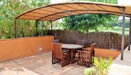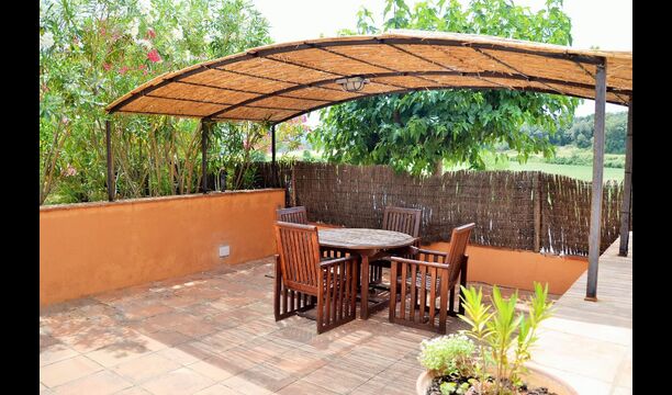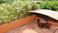 Denne 2-etagers ferielejlighed ligger for sig selv ude i haven og har derfor en lækker, privat terrasse. Denne er overdækket, så man kan sidde og nyde skyggen og evt. aftensmaden her.