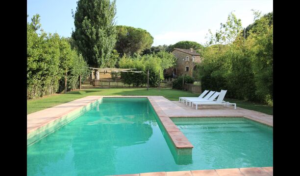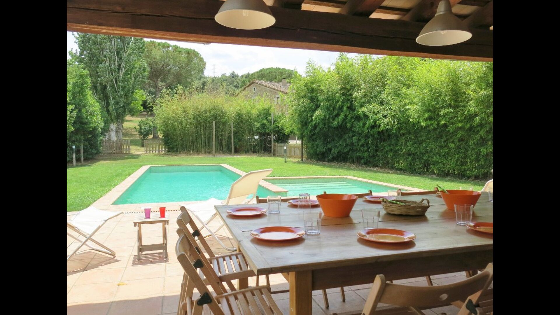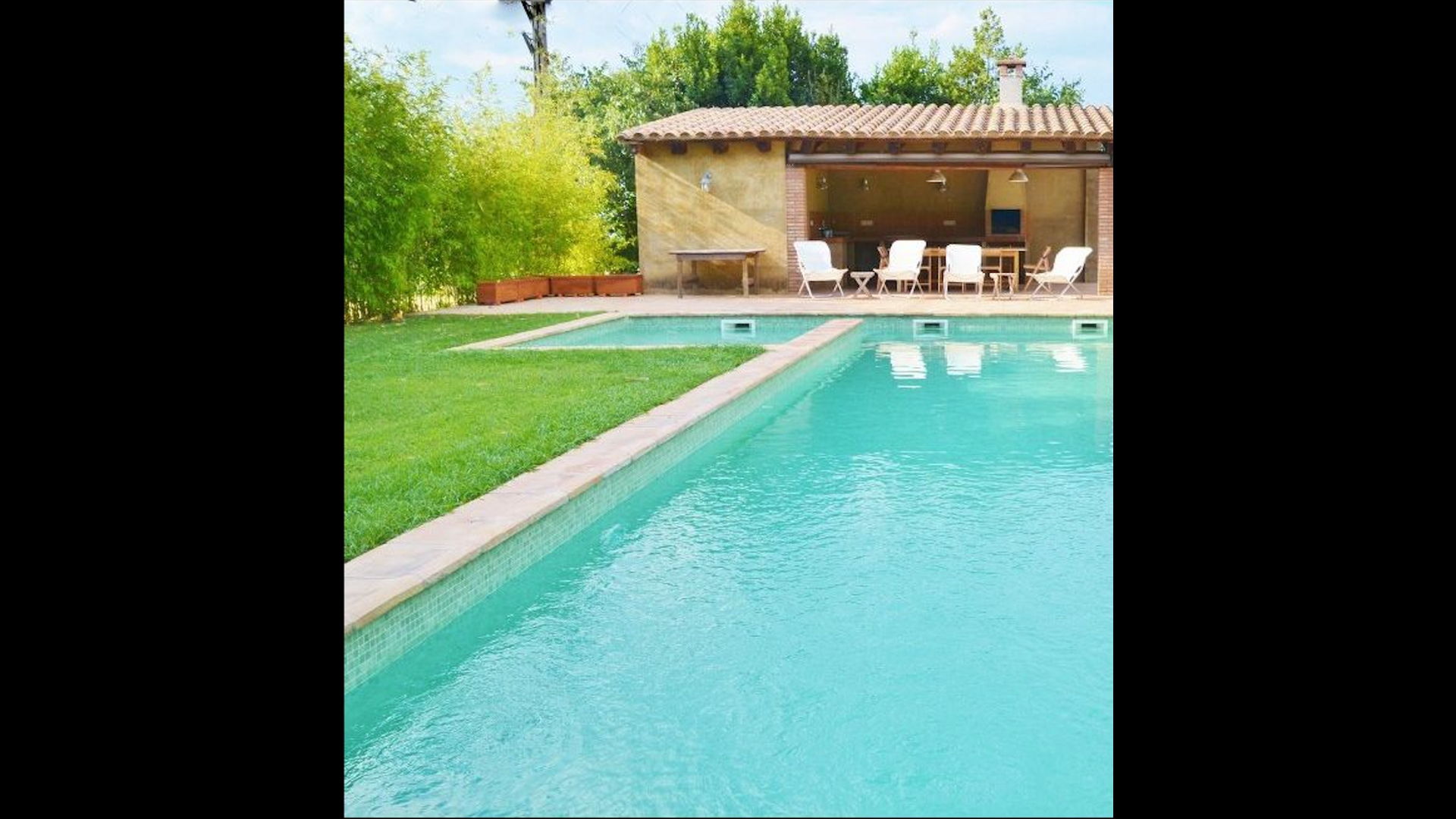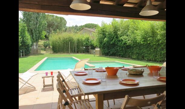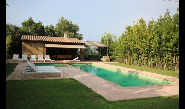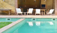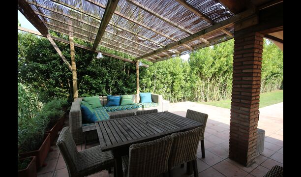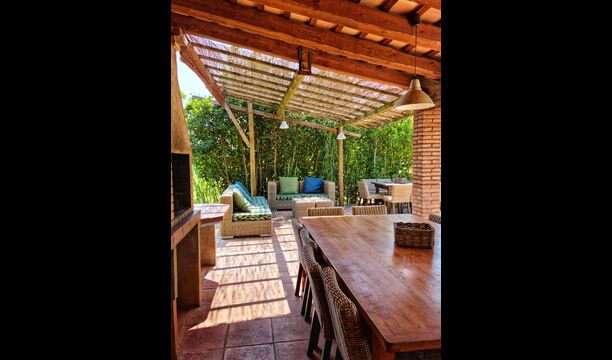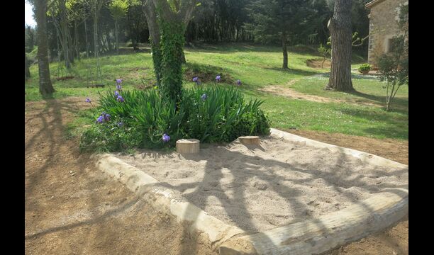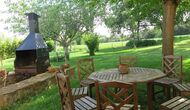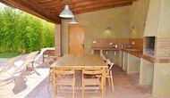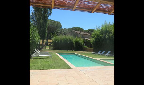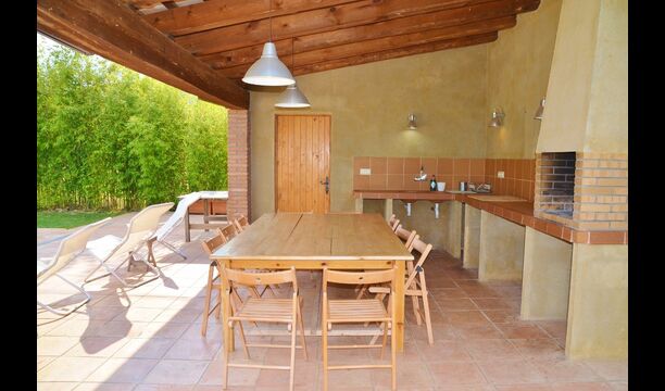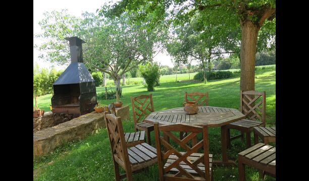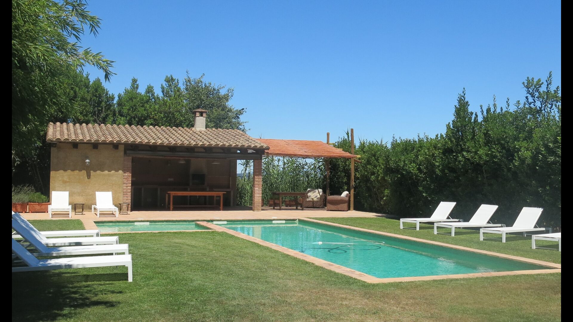I den anden ende af haven, med en fremragende udsigt over markerne, finder du det store poolområde (indhegnet for at beskytte små børn). Swimmingpoolen, som er med saltvand, er 10m x 4m meter, og desuden er der et lille bassin til de helt små børn. Ved enden af poolen er der en stor overdækket terrasse med udendørs køkken, rindende vand, køleskab og grill. Her kan i selv tilberede og spise måltider. Der er også et toilet, så du ikke bliver nødt til at gå hele vejen ind i huset.