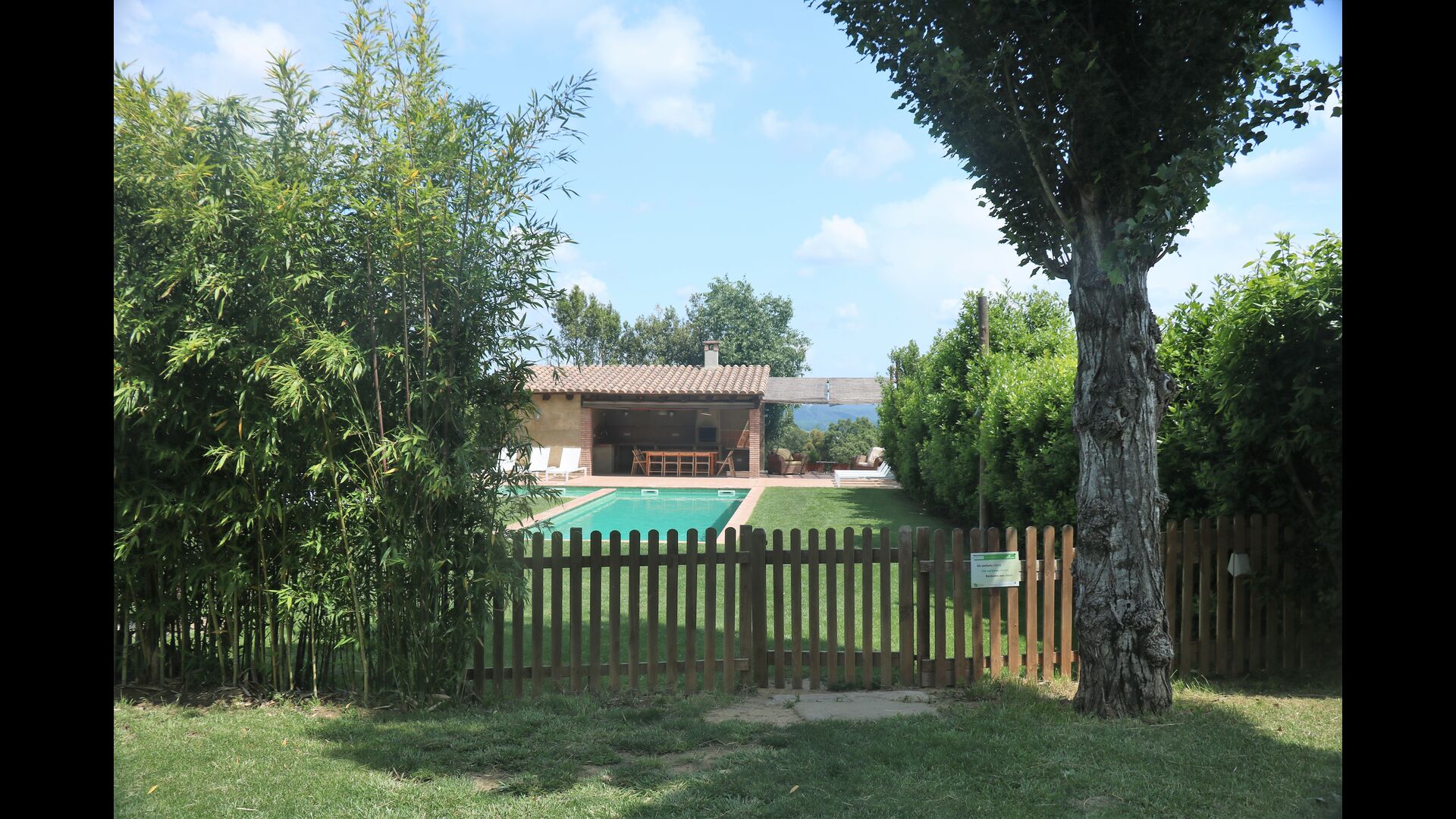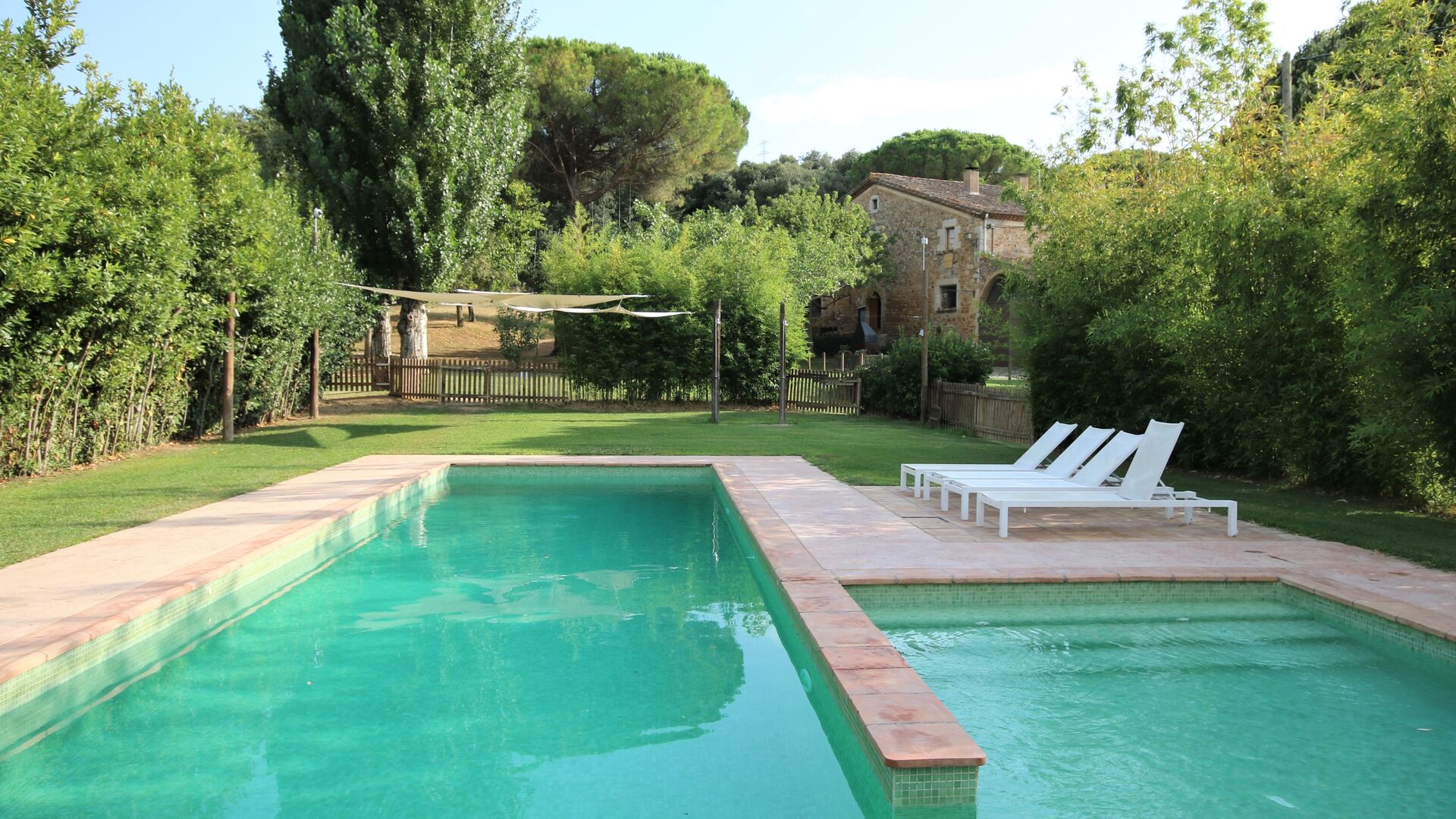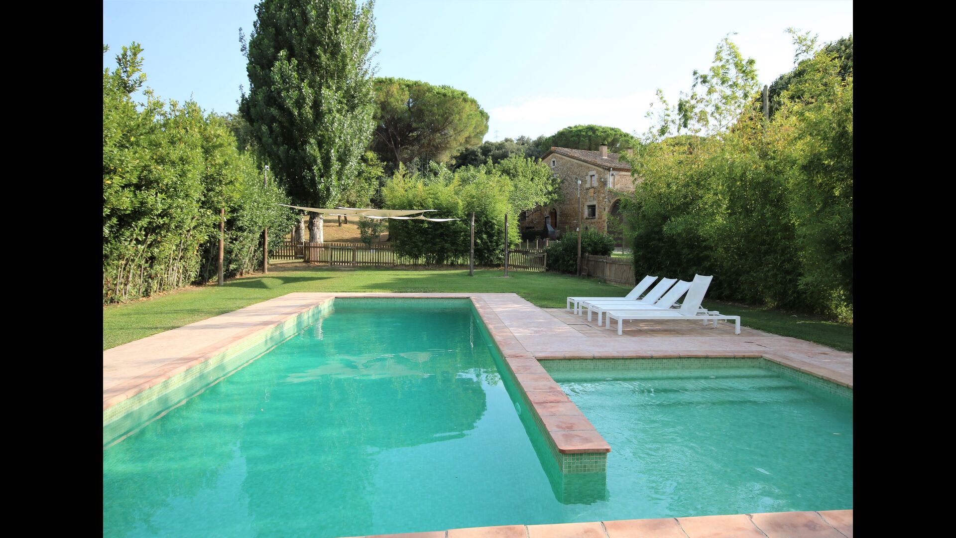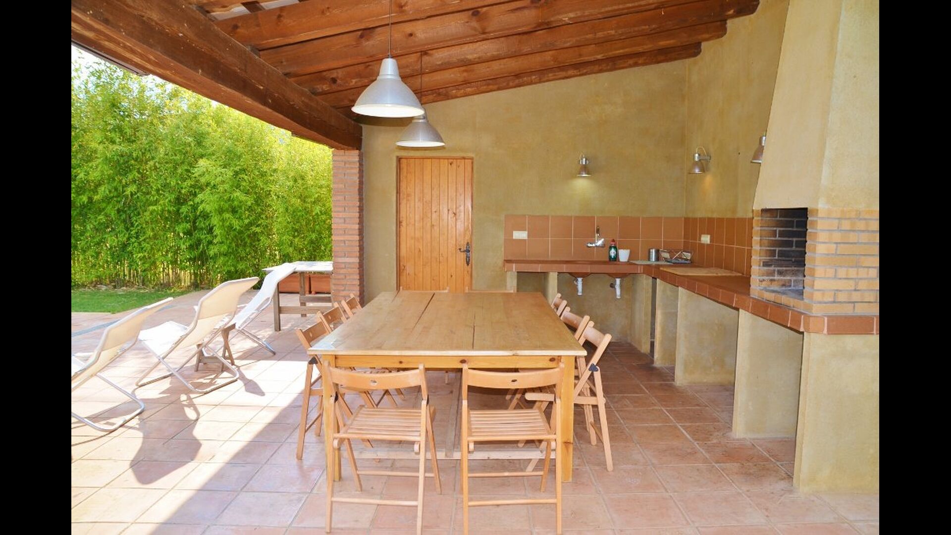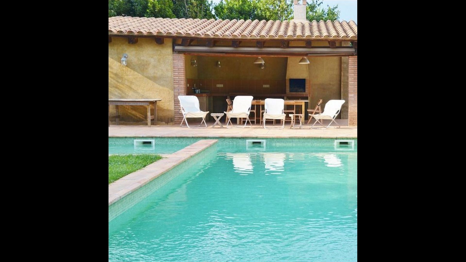I den anden ende af haven, med en fremragende udsigt over markerne, finder du det store poolområde (indhegnet for at beskytte små børn). Swimmingpoolen, som er med saltvand, er 10m x 4m meter, og desuden er der et lille bassin til de helt små børn. Ved enden af poolen er der en stor overdækket terrasse med udendørs køkken, rindende vand, køleskab og grill. Her kan i selv tilberede og spise måltider. Der er også et toilet, så du ikke bliver nødt til at gå hele vejen ind i huset.
