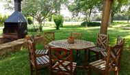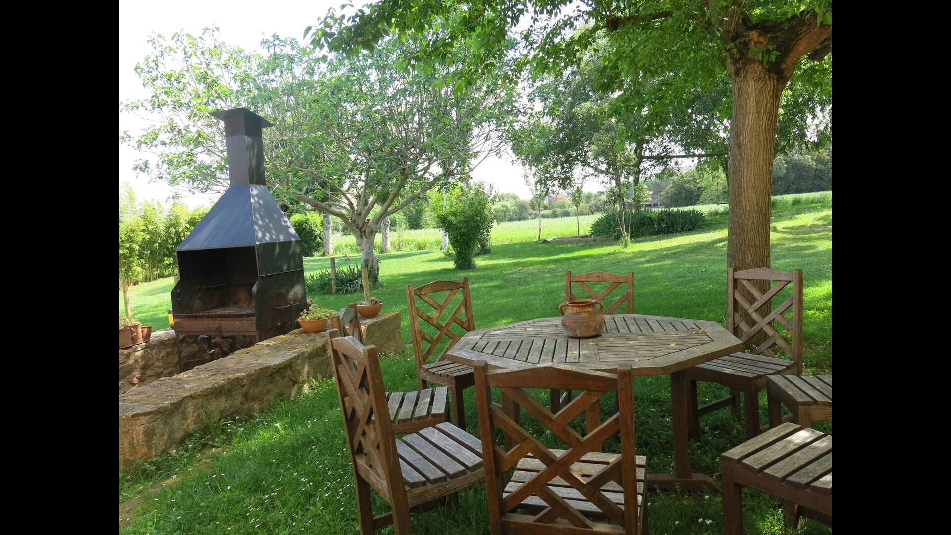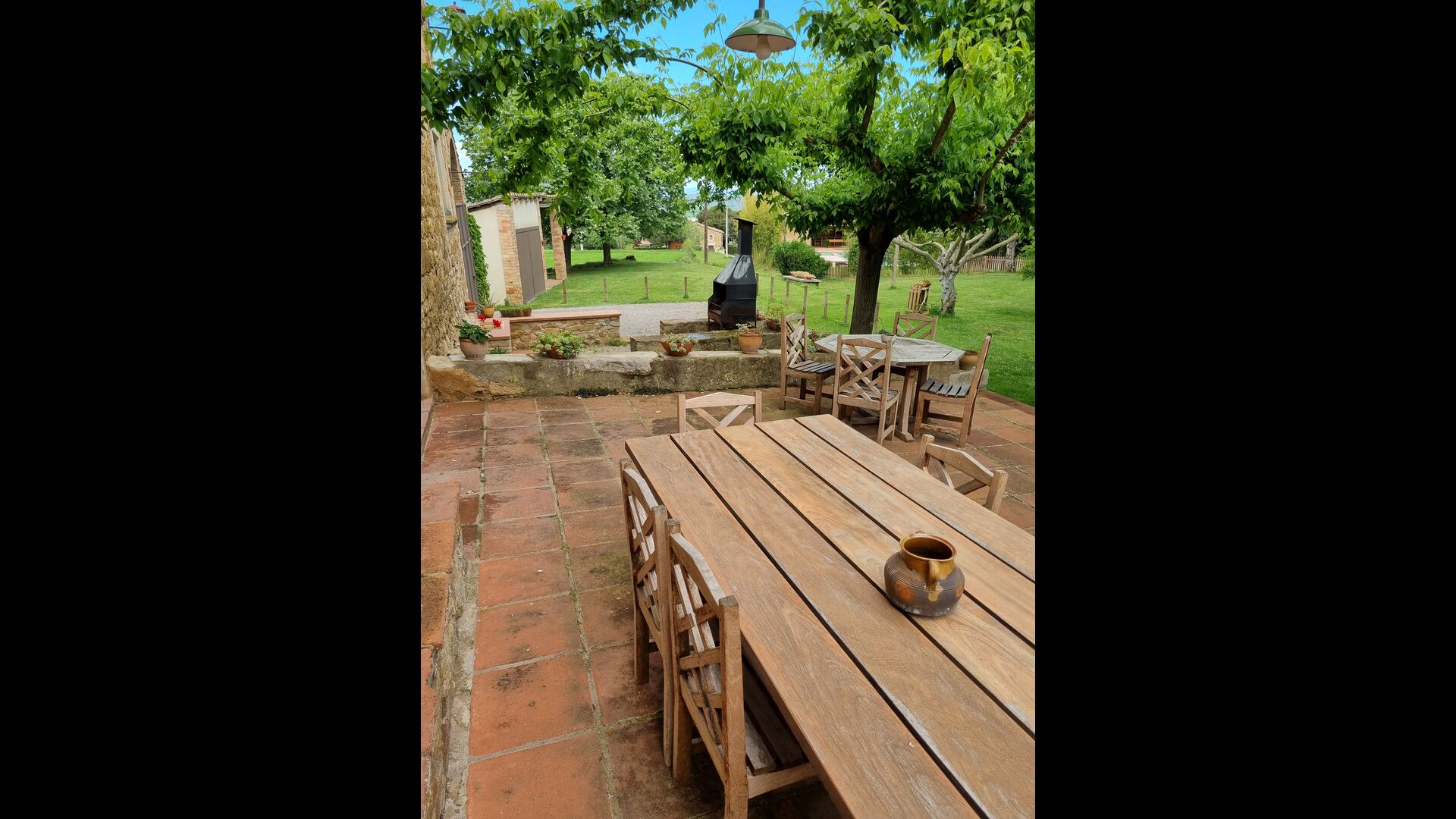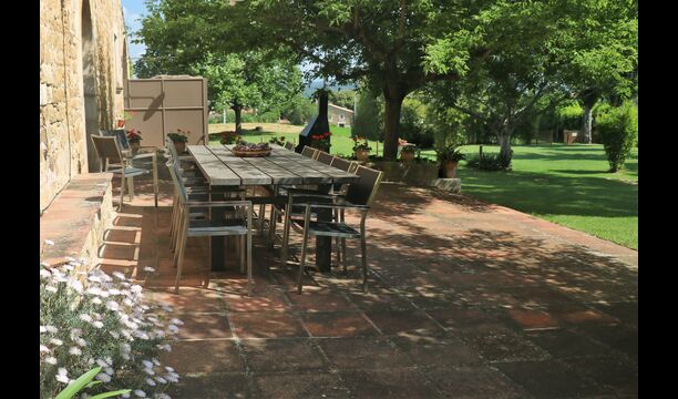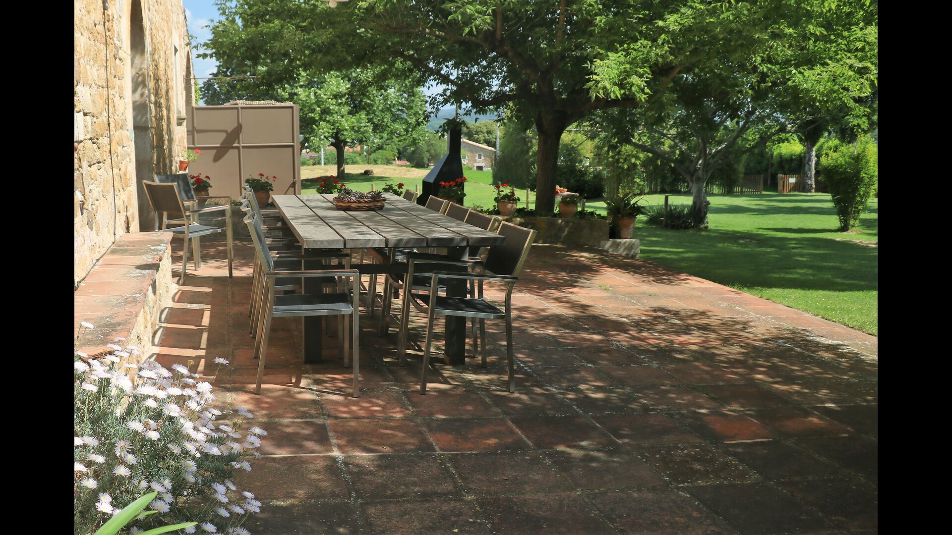 Udenfor, foran huset, finder du den store græsplæne med mange skyggefulde hjørner under træerne. Her er nogle mindre terrasseområder, hvor det er oplagt at få en kop kaffe om morgenen eller slappe af med en bog og et glas vin. Der kan desuden placeres ekstra borde, så man kan sidde her og spise hvis man foretrækker.