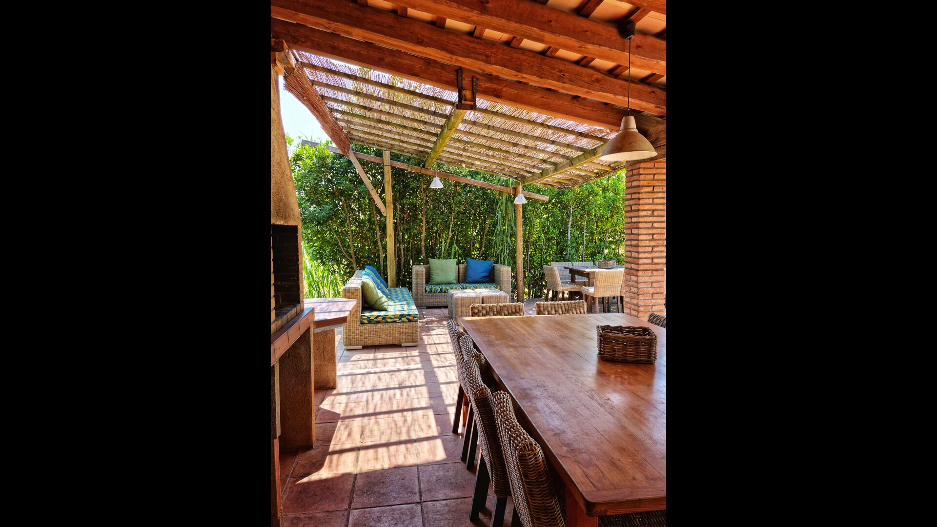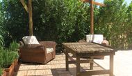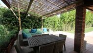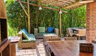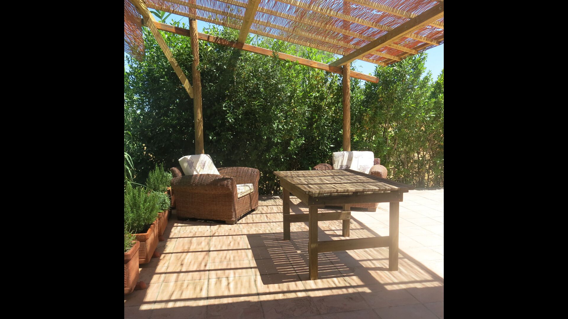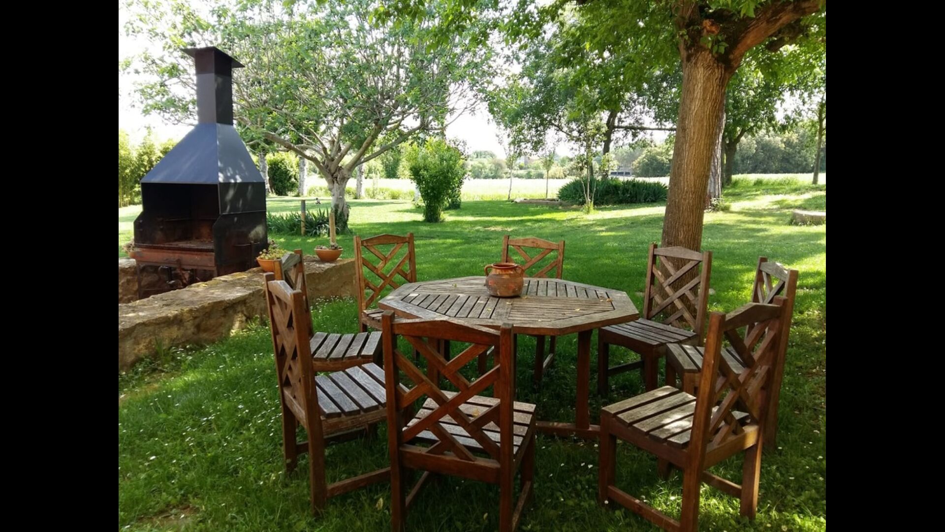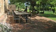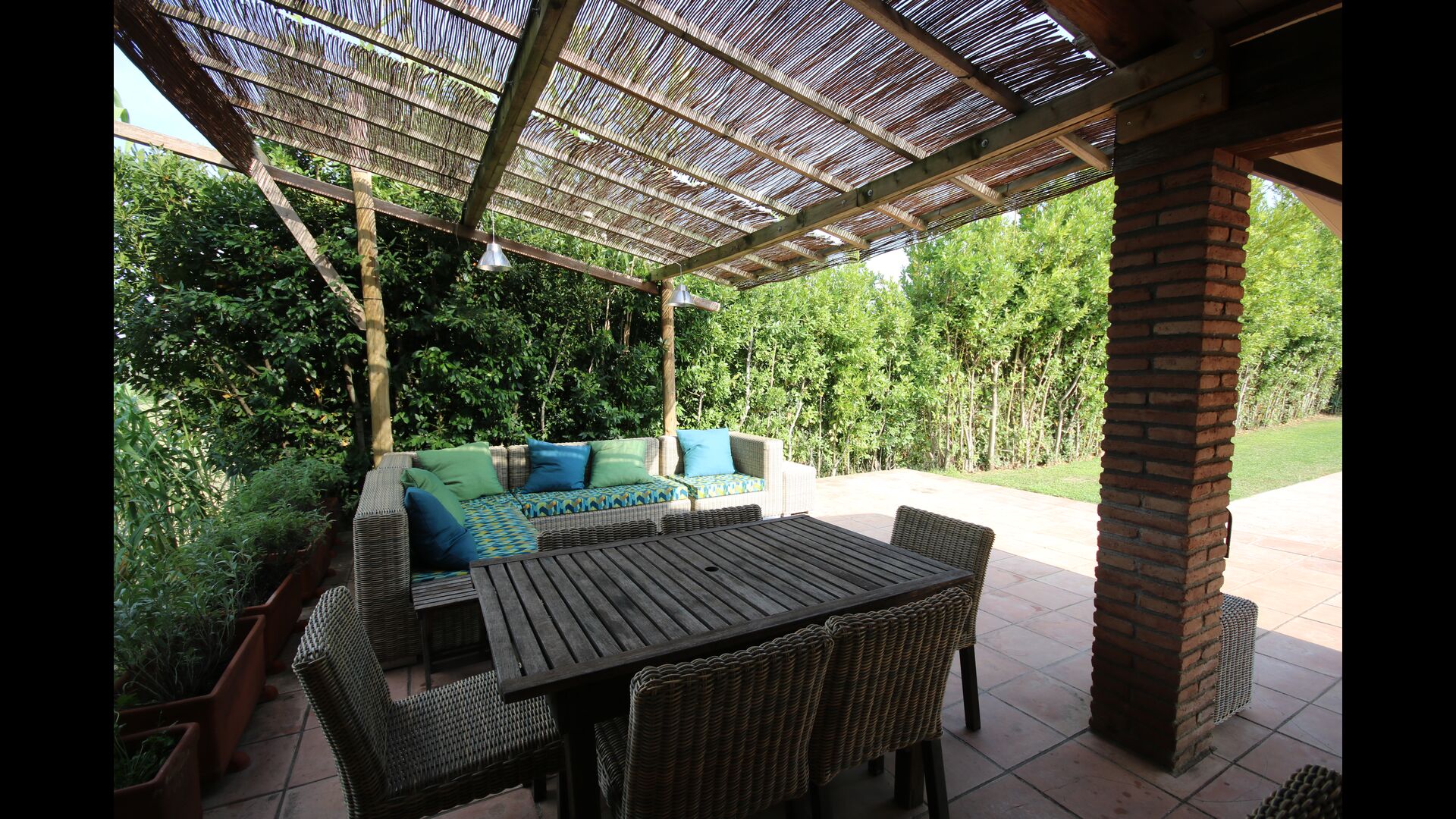 Udenfor, foran huset, finder du den store græsplæne med mange skyggefulde hjørner under træerne. Her er nogle mindre terrasseområder, hvor det er oplagt at få en kop kaffe om morgenen eller slappe af med en bog og et glas vin. Der kan desuden placeres ekstra borde, så man kan sidde her og spise hvis man foretrækker.