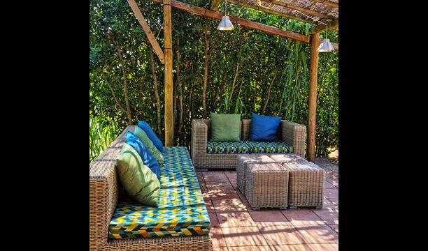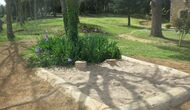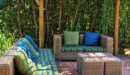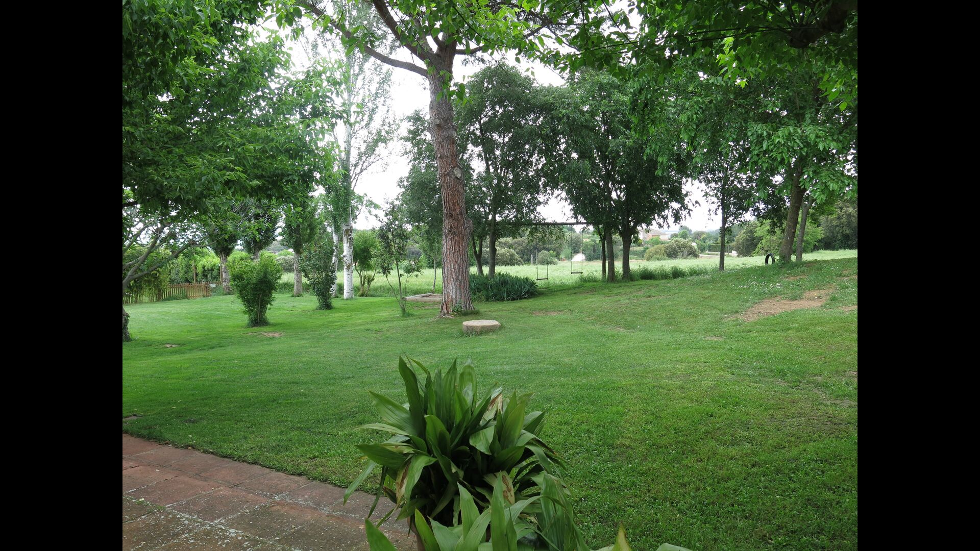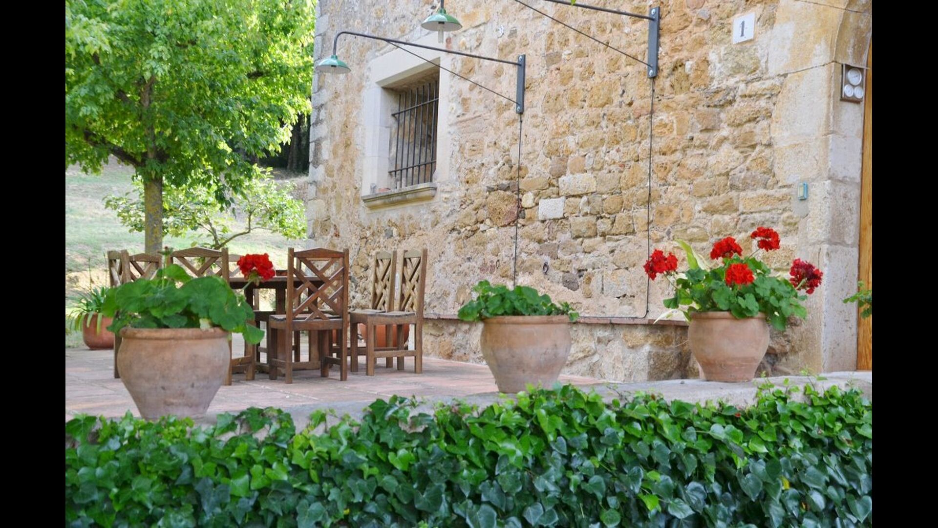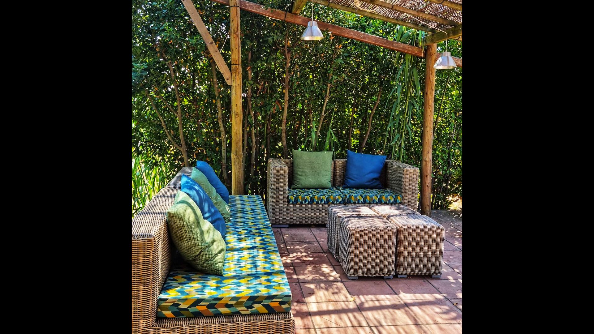 Udenfor, foran huset, finder du den store græsplæne med mange skyggefulde hjørner under træerne. Her er nogle mindre terrasseområder, hvor det er oplagt at få en kop kaffe om morgenen eller slappe af med en bog og et glas vin. Der kan desuden placeres ekstra borde, så man kan sidde her og spise hvis man foretrækker.
