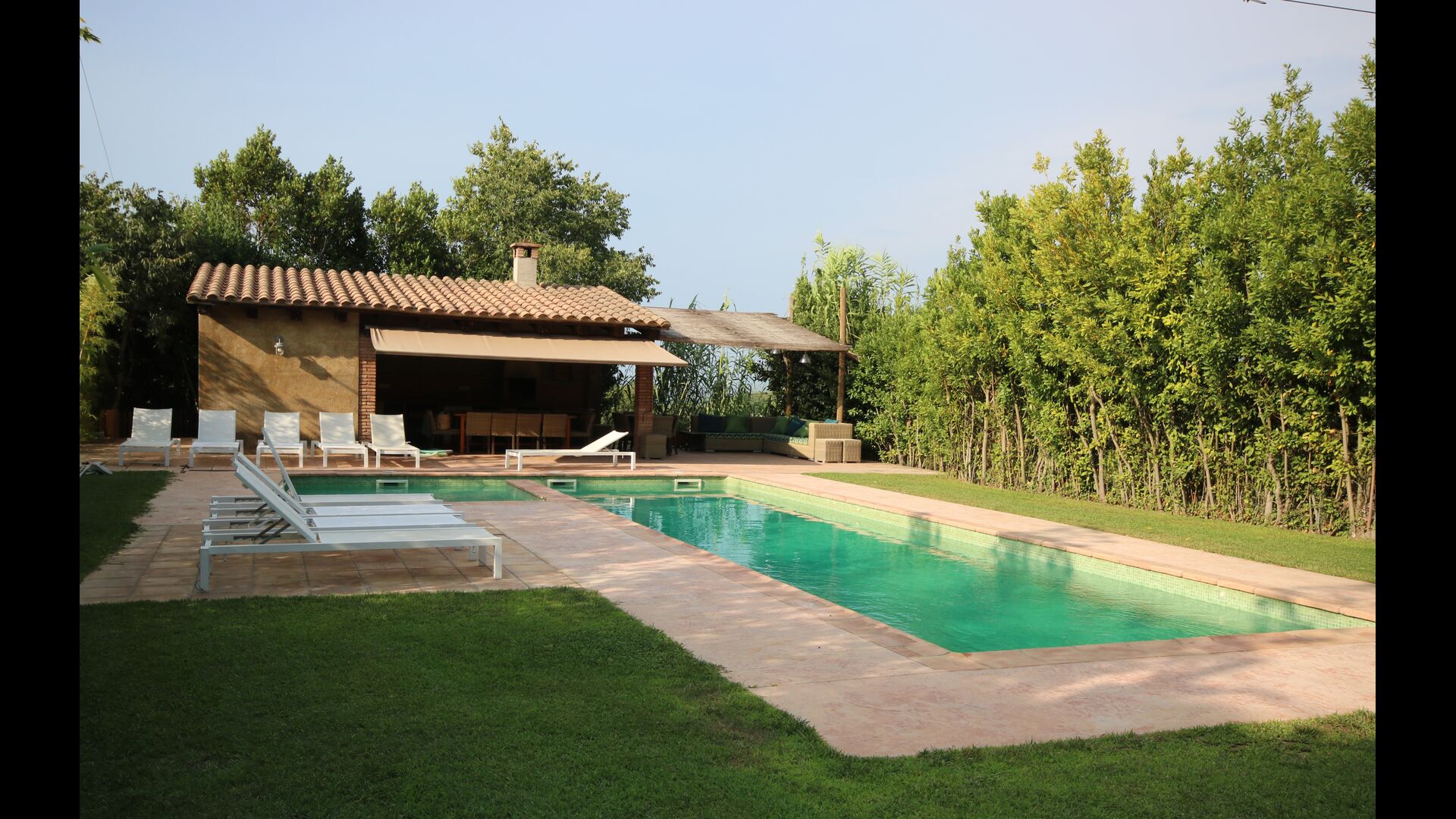 • Pool-området med overdækket terrasse, køleskab, toilet, rindende vand, grill mv