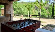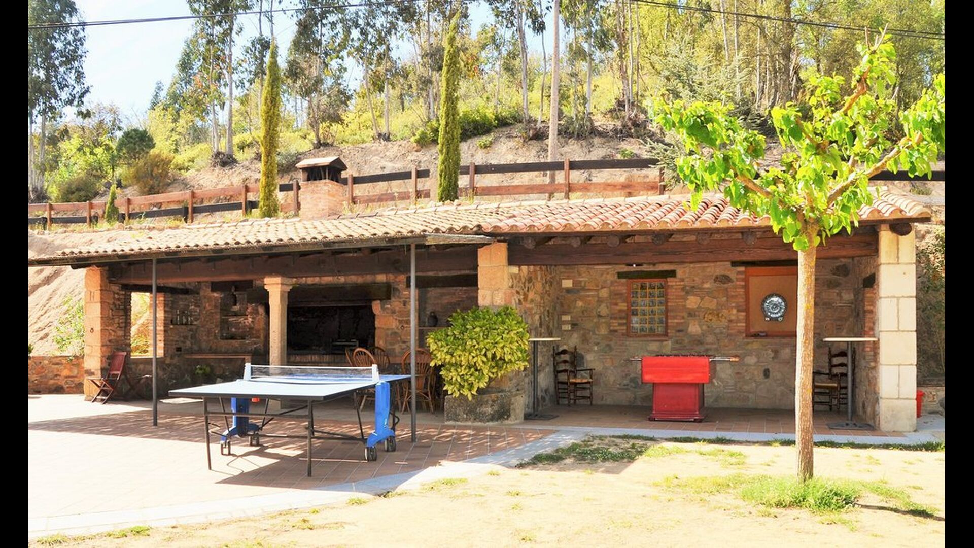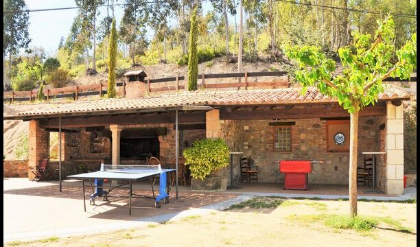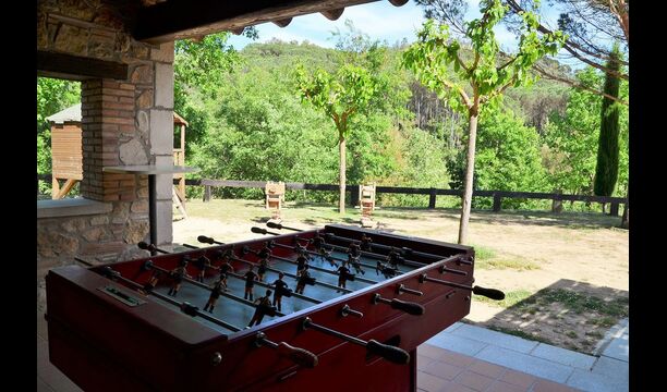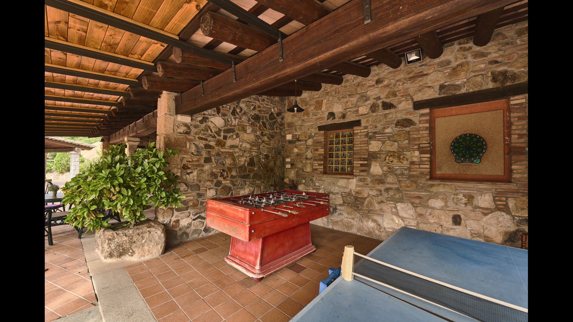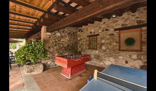 På den anden side af huset, ved siden af den udendørs terrasse, er et overdækket område med dart, bordfodbold og bordtennis, et legehus med mini-køkken og en sandkasse, så børnene har rig mulighed for at underholde sig selv, mens de voksne slapper af ved spisebordet. Huset er perfekt til hyggelige udendørs middage, overdækkede eller under åben himmel, da der er en dør der direkte forbinder terrassen med køkkenet, og på den anden side er den store overdækkede grill. Her er også et toilet så man ikke behøver at gå ind i huset.