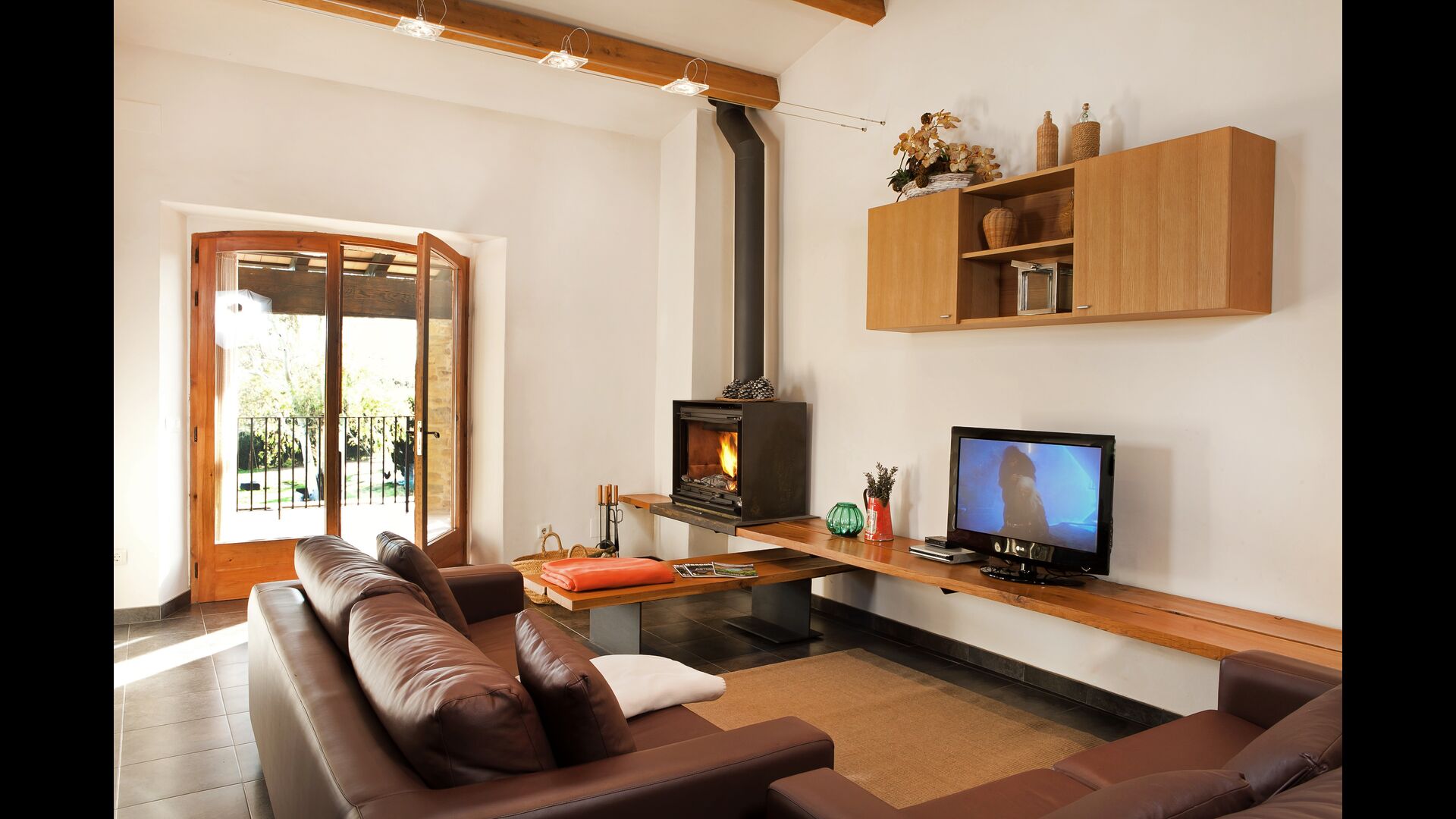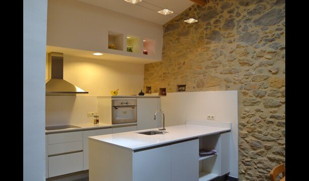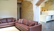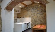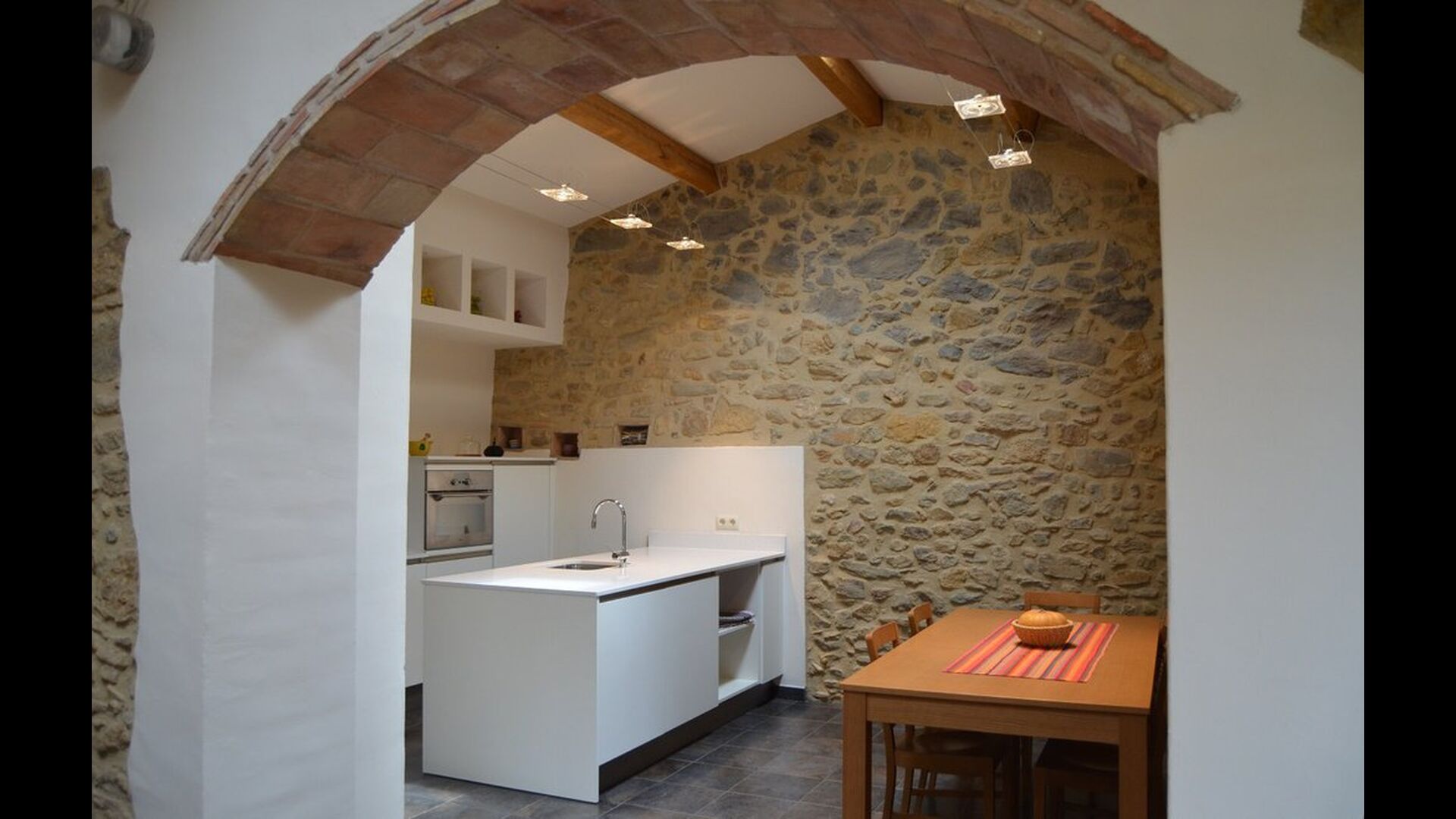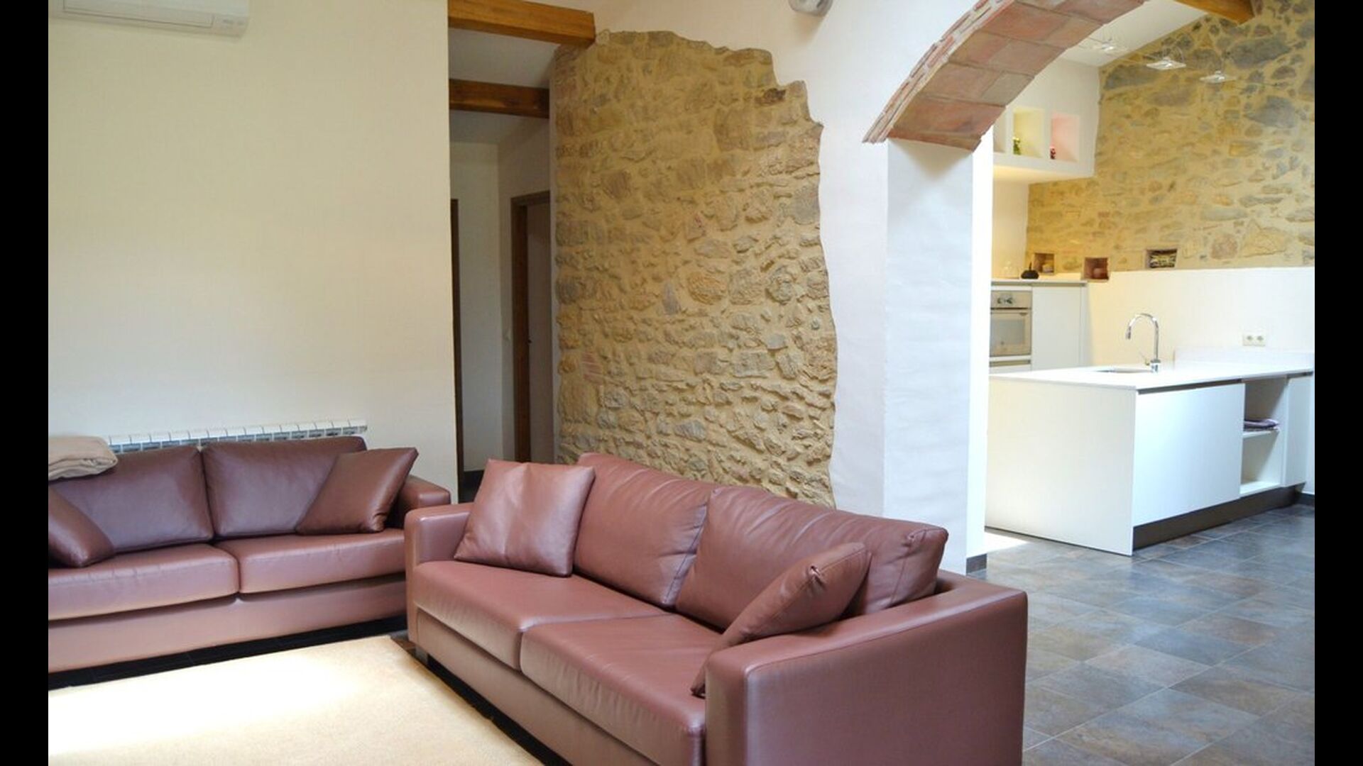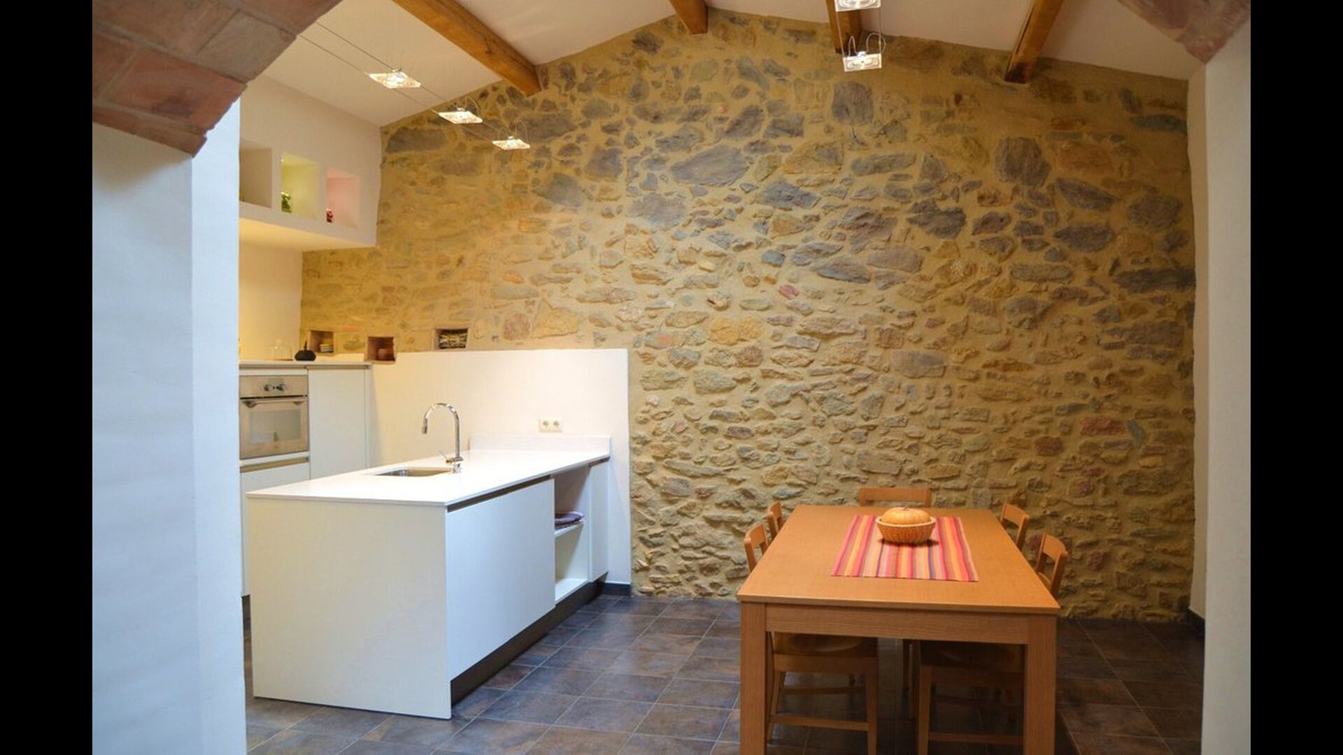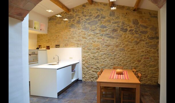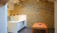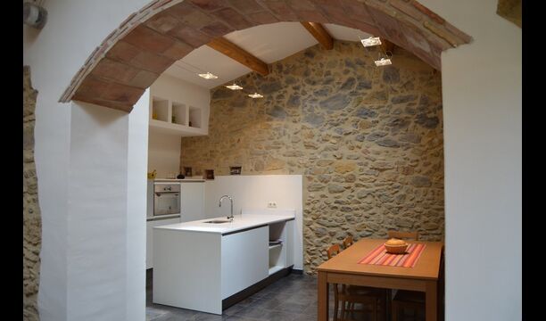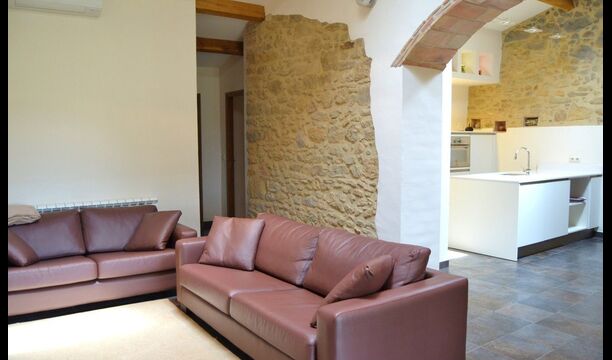 Det meget flotte og moderne fællesrum indeholder både et sofahjørne med TV, et åbent og veludstyret køkken og et flot spisebord. Stenvæggene i dette rum kombineret med de hvide vægge giver en autentisk, men samtidig ny, atmosfære. Lejligheden har en privat terrasse med udsigt ud over haven og de flotte omgivelser, og der er her også et spisebord, hvor den hjemmelavede mad kan nydes under de lune catalanske aftener.