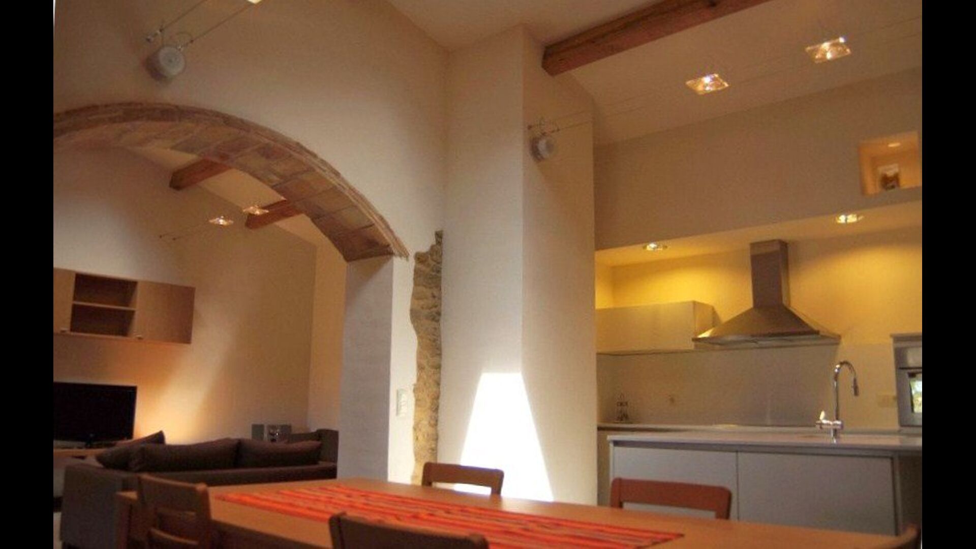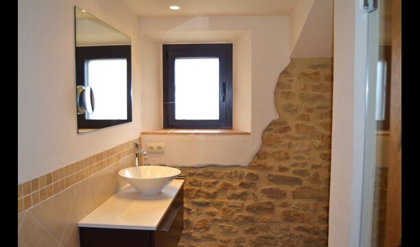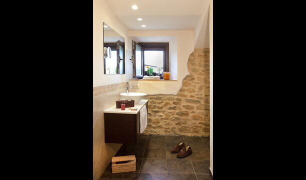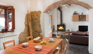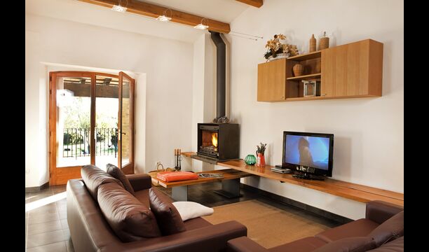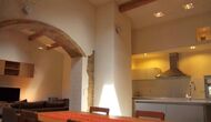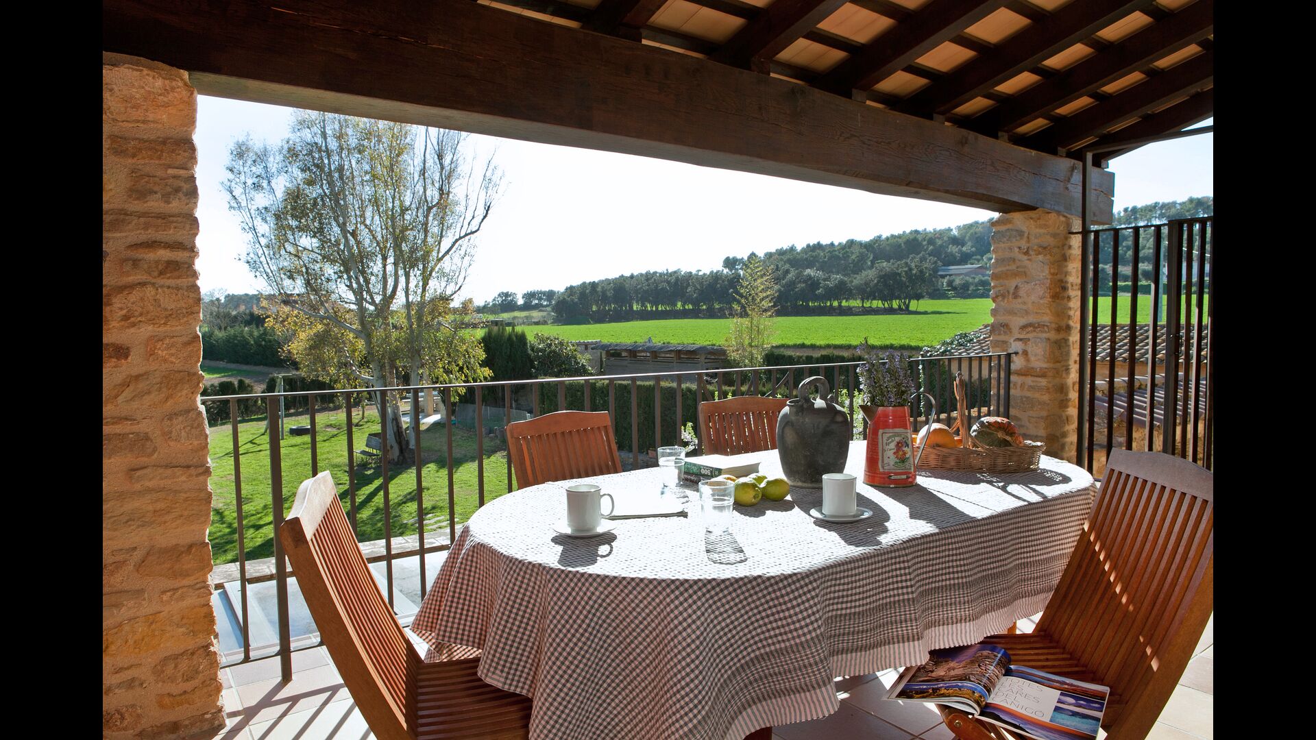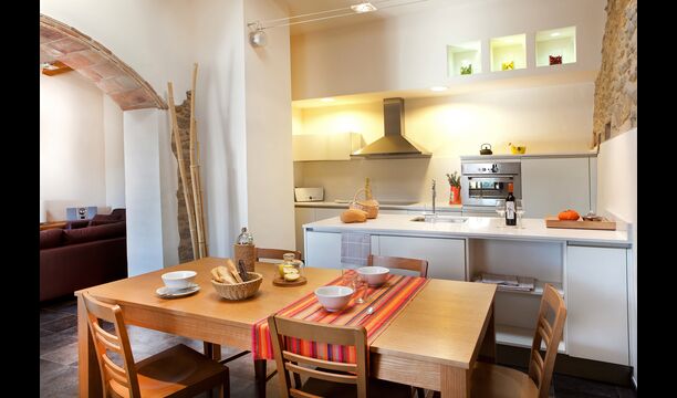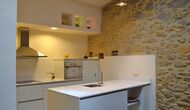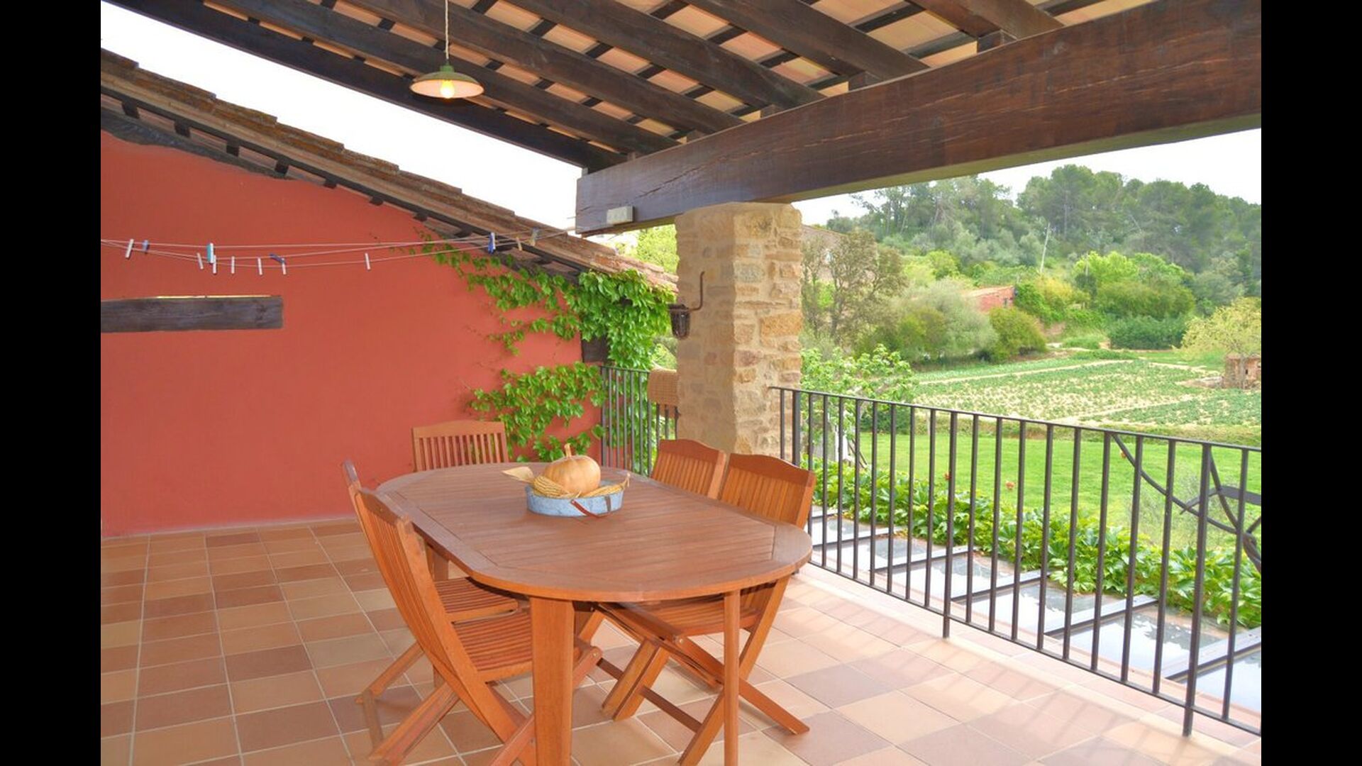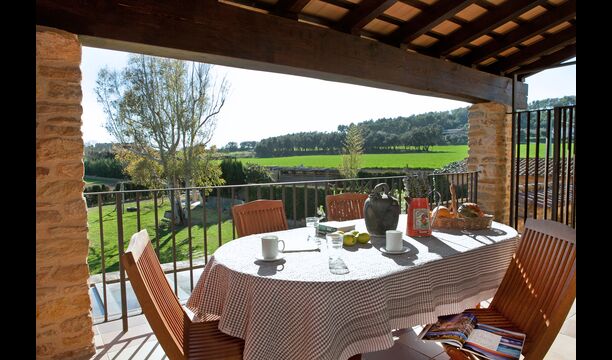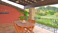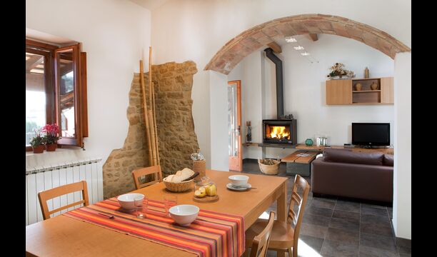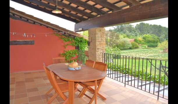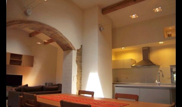 Det meget flotte og moderne fællesrum indeholder både et sofahjørne med TV, et åbent og veludstyret køkken og et flot spisebord. Stenvæggene i dette rum kombineret med de hvide vægge giver en autentisk, men samtidig ny, atmosfære. Lejligheden har en privat terrasse med udsigt ud over haven og de flotte omgivelser, og der er her også et spisebord, hvor den hjemmelavede mad kan nydes under de lune catalanske aftener.