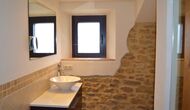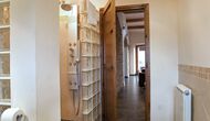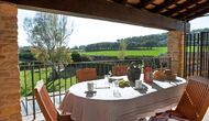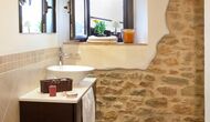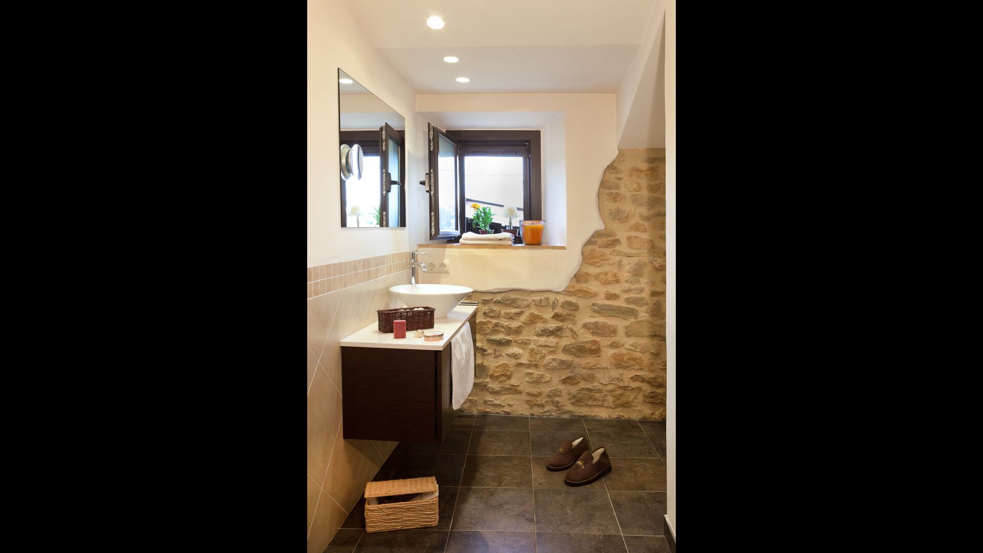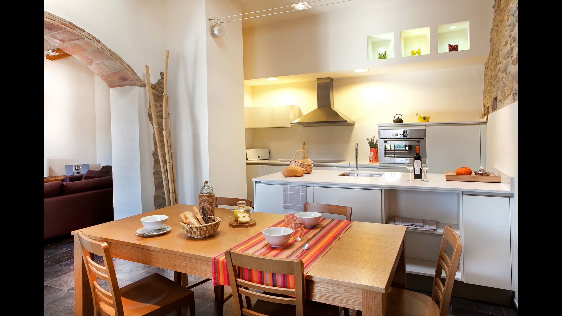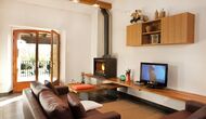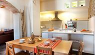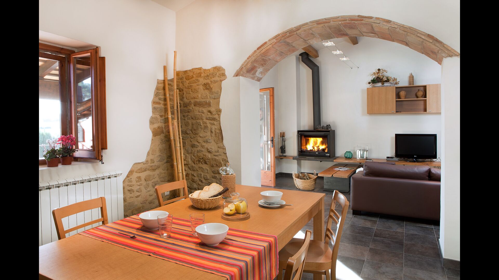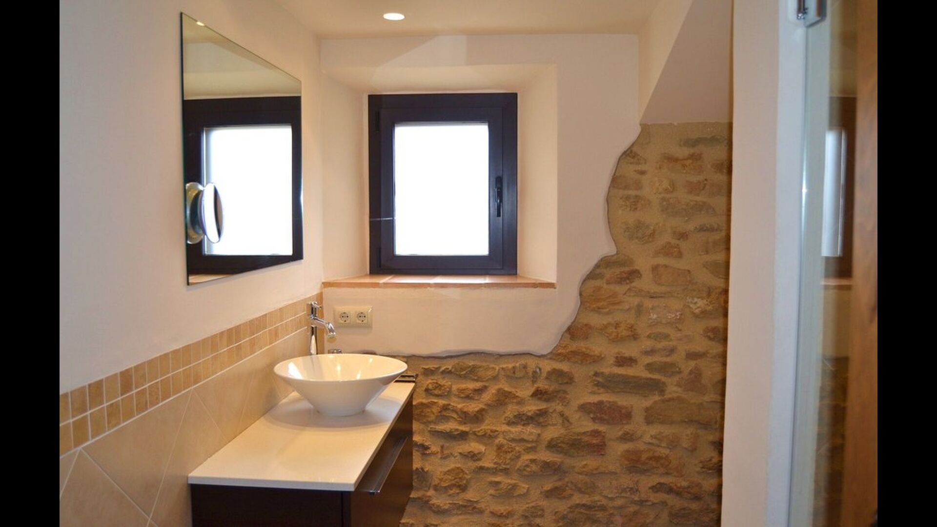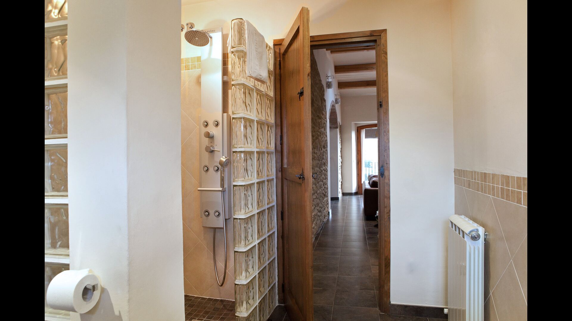 Det meget flotte og moderne fællesrum indeholder både et sofahjørne med TV, et åbent og veludstyret køkken og et flot spisebord. Stenvæggene i dette rum kombineret med de hvide vægge giver en autentisk, men samtidig ny, atmosfære. Lejligheden har en privat terrasse med udsigt ud over haven og de flotte omgivelser, og der er her også et spisebord, hvor den hjemmelavede mad kan nydes under de lune catalanske aftener.