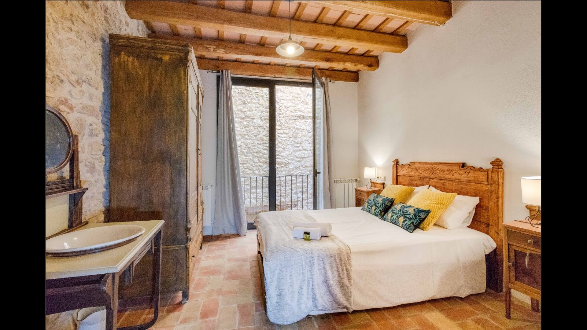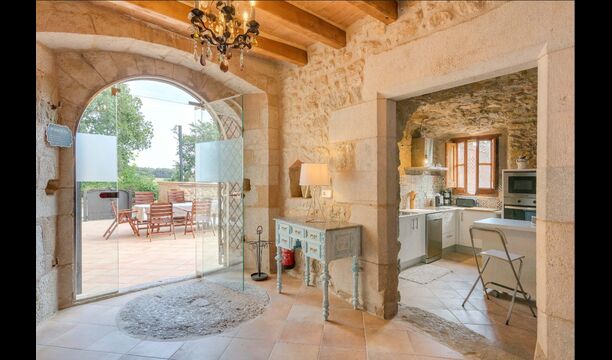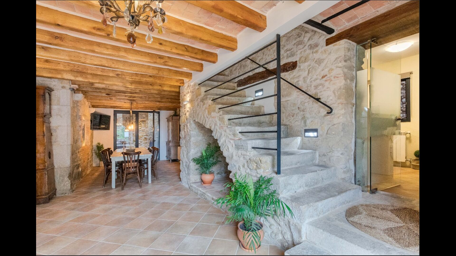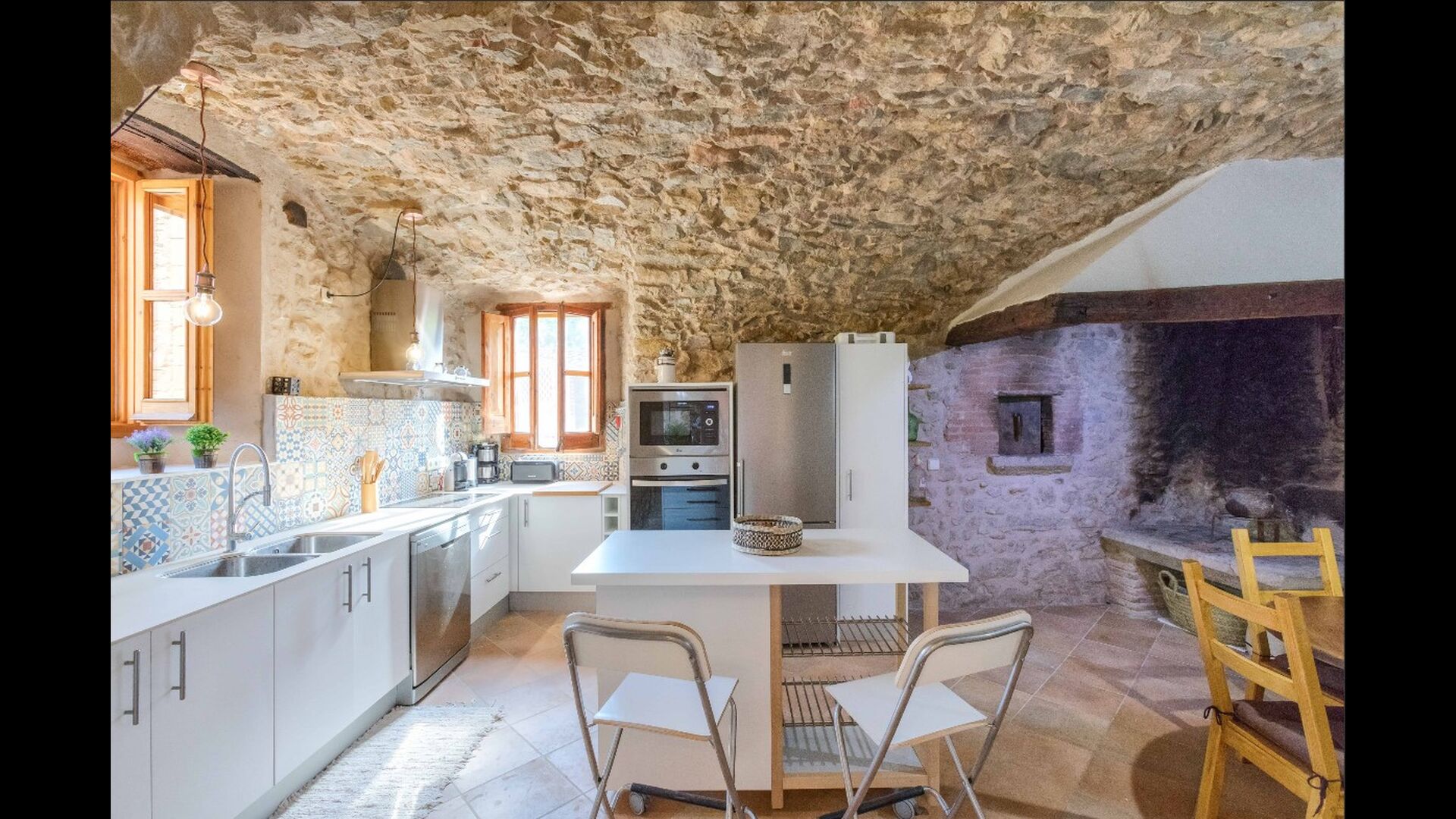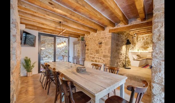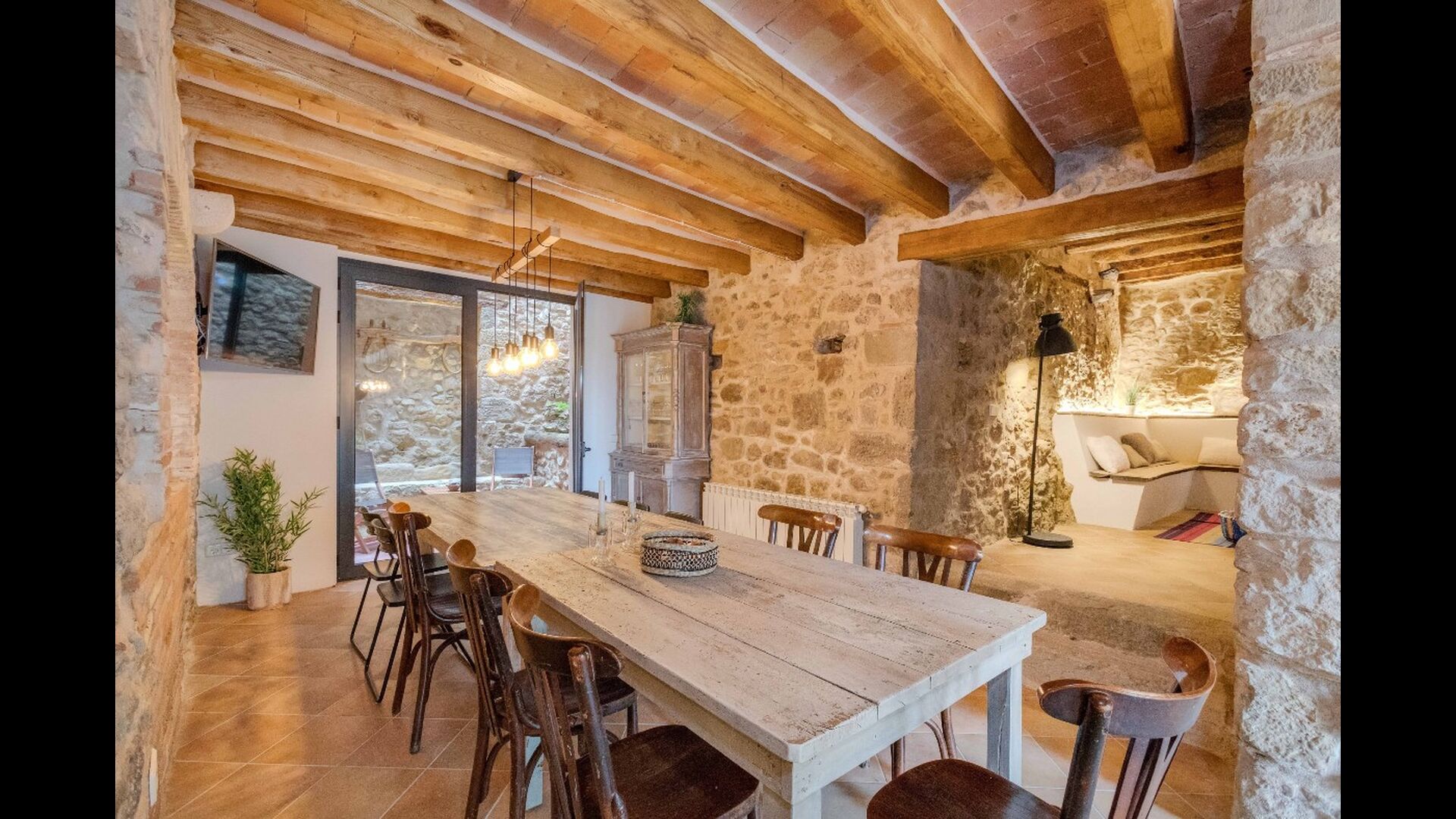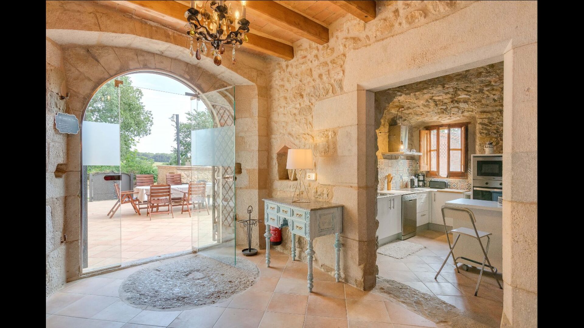 Her vil I møde et autentisk catalansk kalkstenshus med 6 rummelige soveværelser og 3 moderne badeværelser. Der er et dejligt fællesrum og et stort køkken, veludstyret og selvfølgelig med opvaskemaskine, køleskab, fryser , mikroovn og komfur.