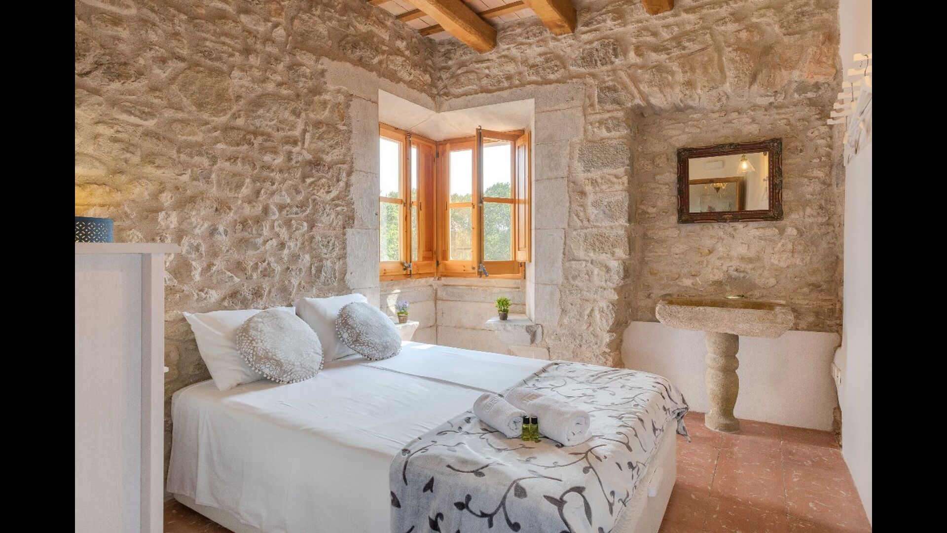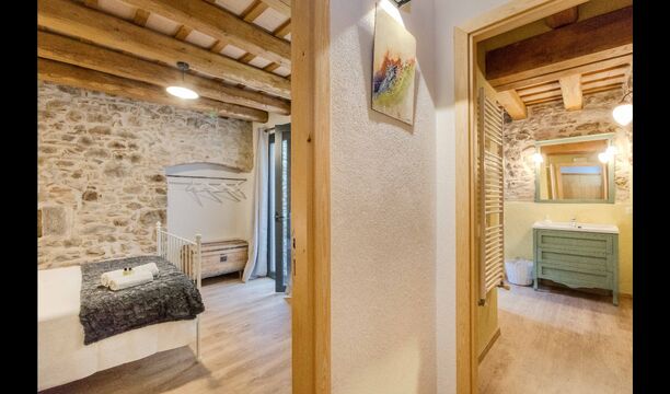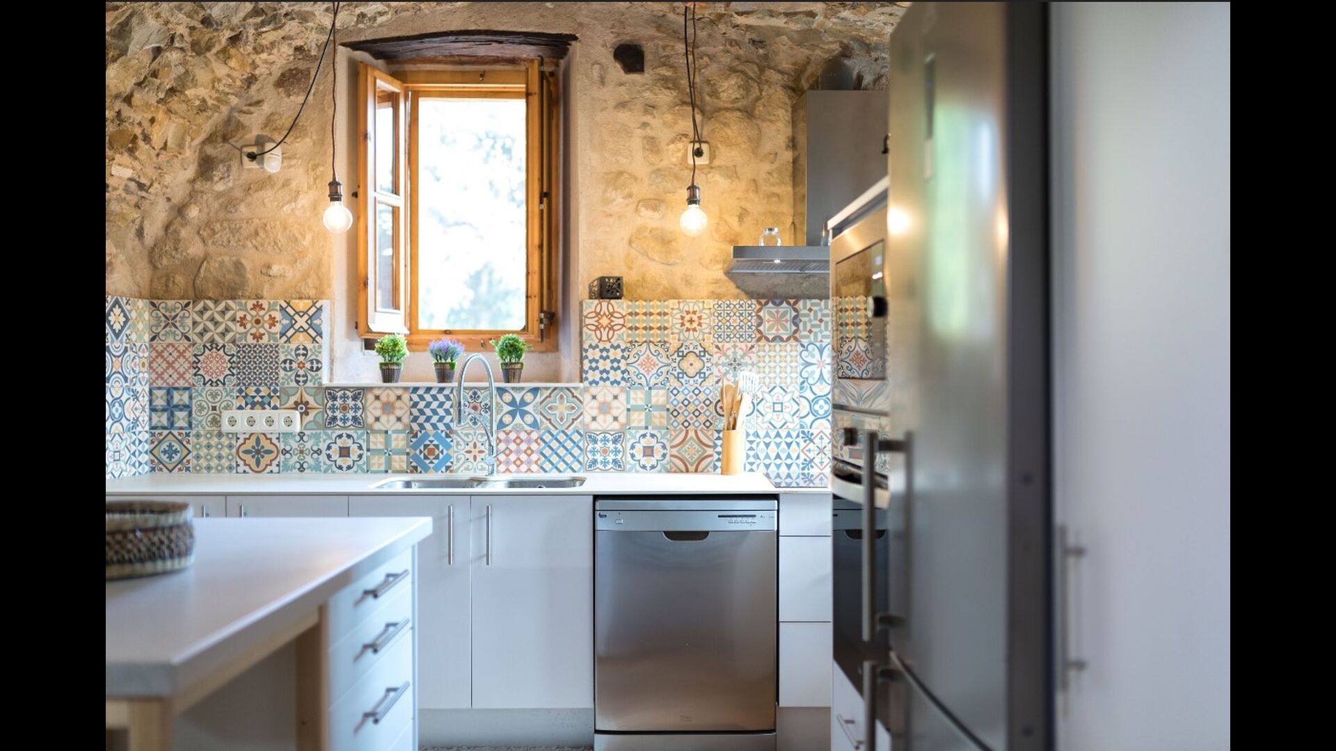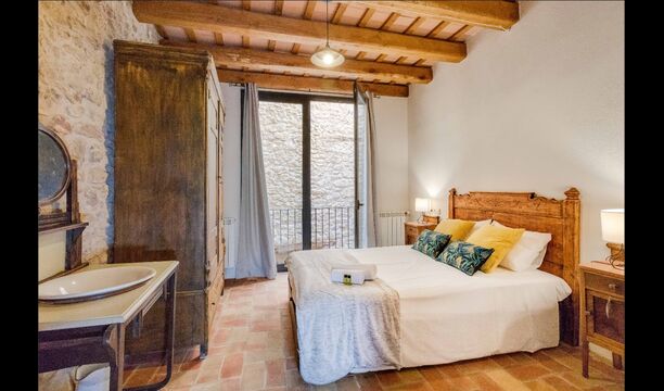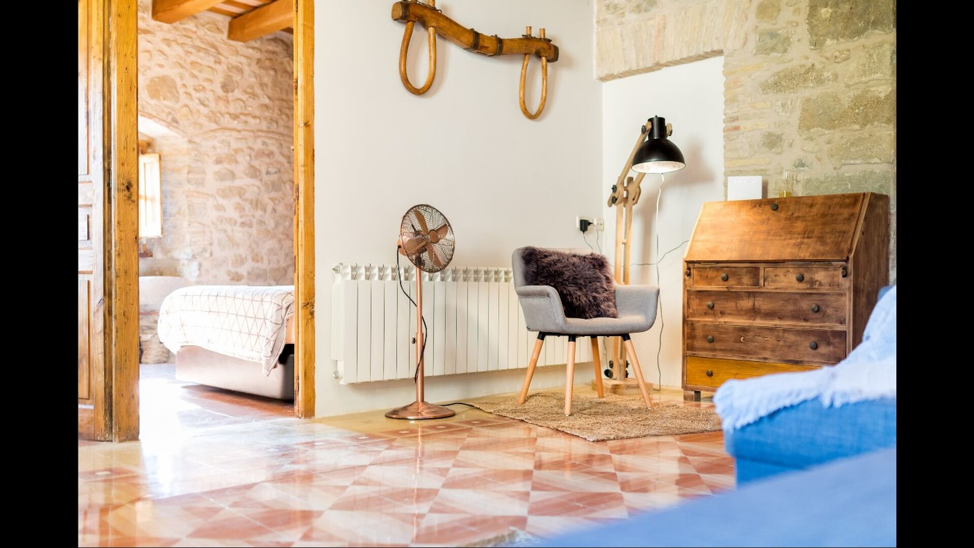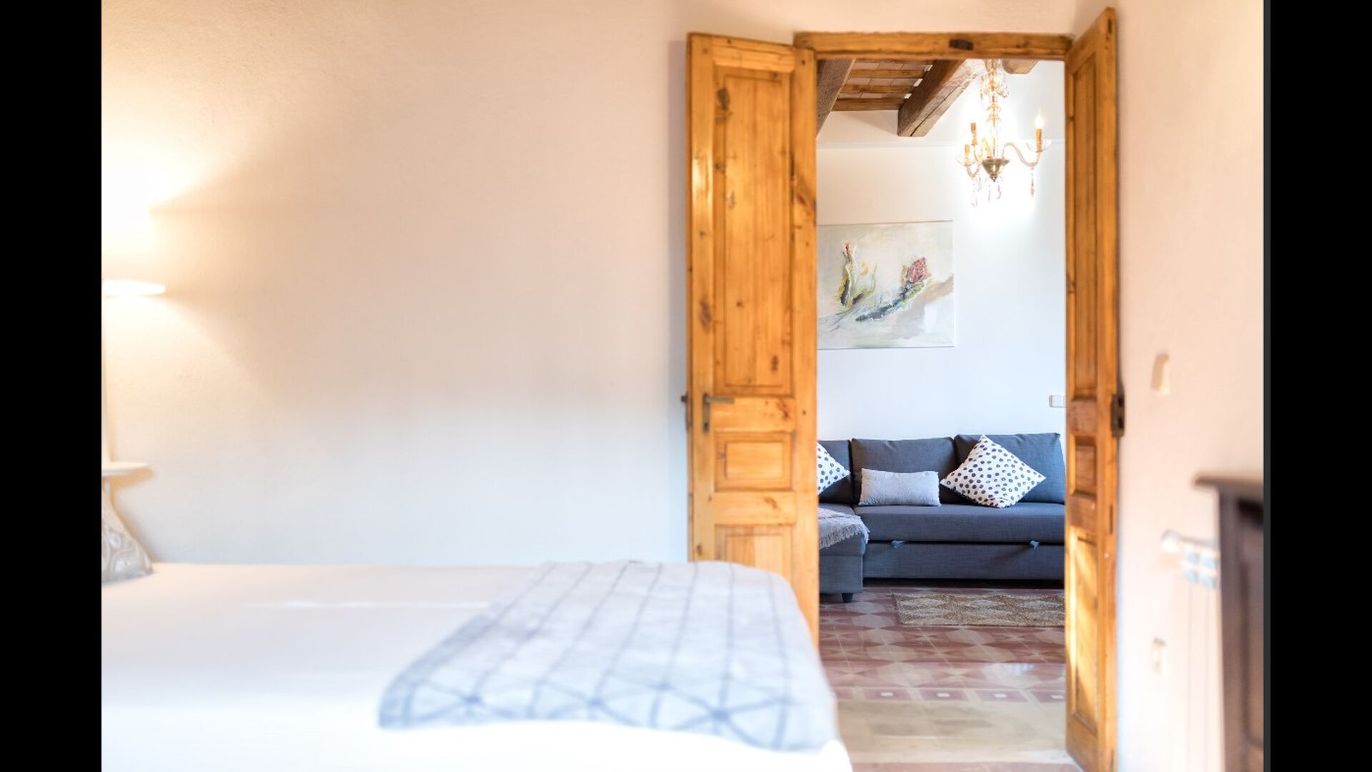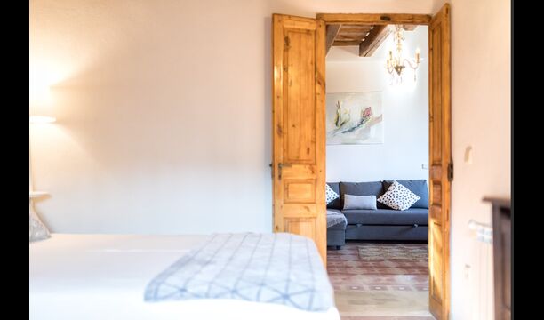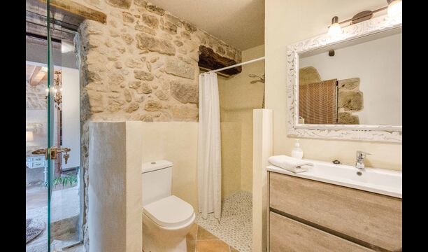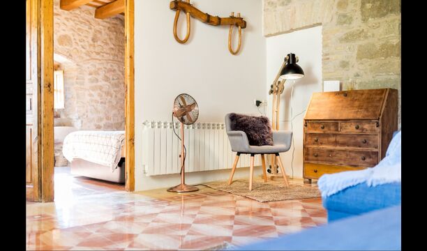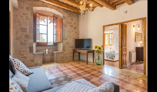 Her vil I møde et autentisk catalansk kalkstenshus med 6 rummelige soveværelser og 3 moderne badeværelser. Der er et dejligt fællesrum og et stort køkken, veludstyret og selvfølgelig med opvaskemaskine, køleskab, fryser , mikroovn og komfur.