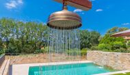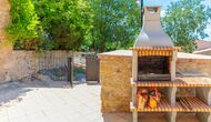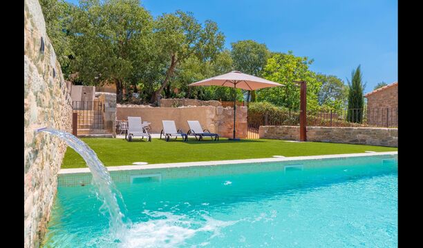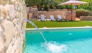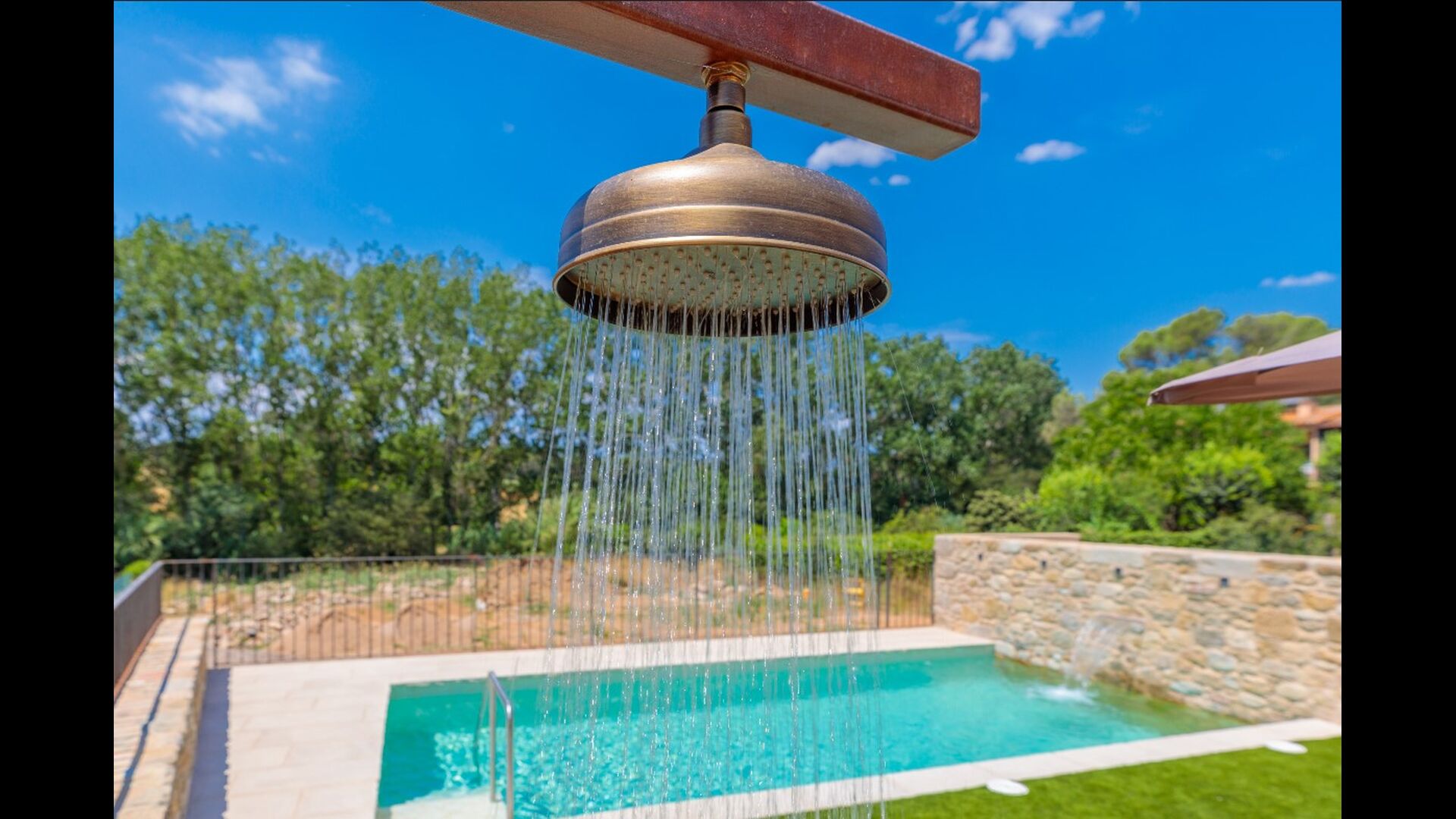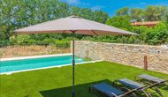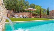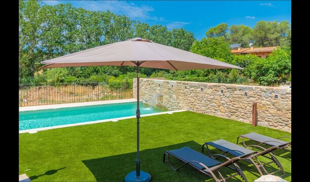 Husets udeområder tilbyder en eksklusiv pool og afslapningsområde. Dette poolområde er fuldt indhegnet. Poolen har et meget flot vandfontæne, der tændes fra en knap. Der er hængekøjer og parasoller, så I kan slappe og og få mest muligt ud af en afslappet ferie i denne smukke feriebolig. Yderligere er der ved siden af poolen et lille rum med "fodboldbane", der er ideelt for de små at lege.