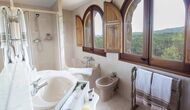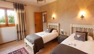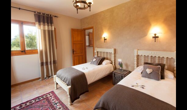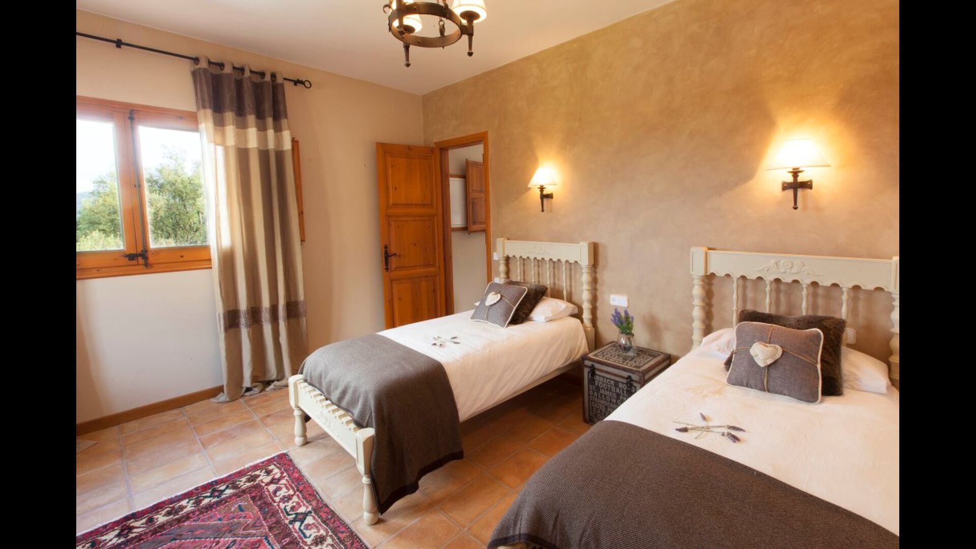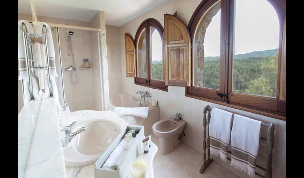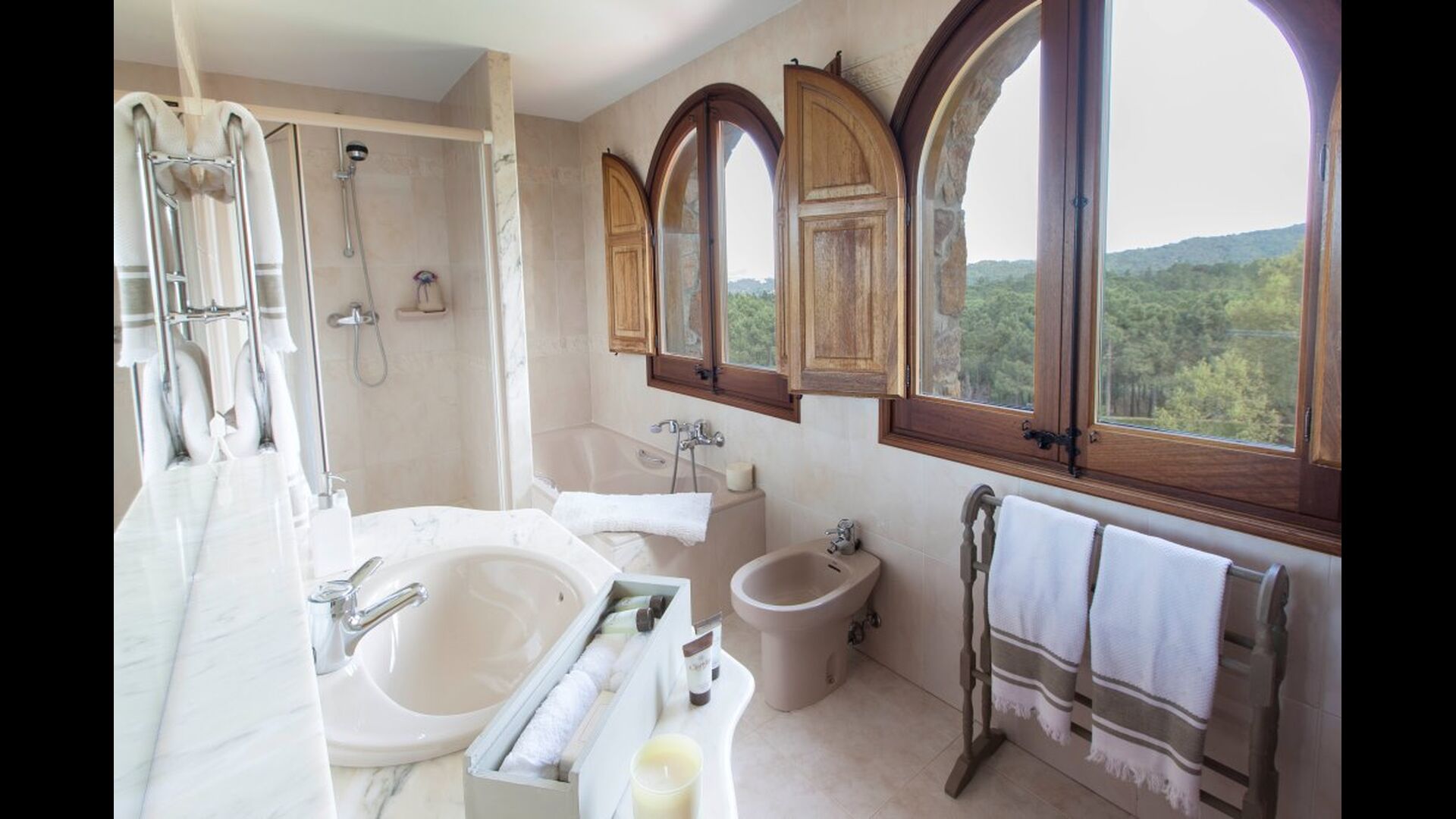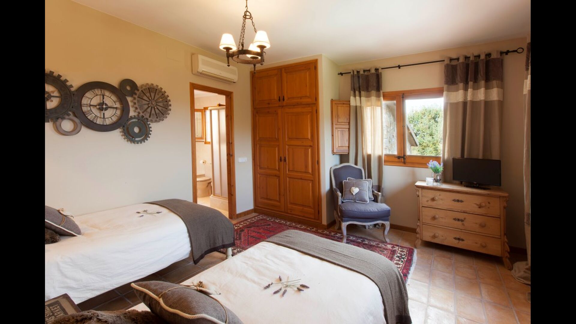 Montnegre Suiten er en suite på 32m2 med to enkeltsenge fuldt udstyret med TV, badeværelse med bruser og badekar samt garderobe. Det har udsigt over haven og poolen. Det er placeret i den sydlige fløj af øverste etage. Pastelindretningen med mørkebrune accenter giver en klar personlighed, der transporterer dig til roen og friskheden i landskabet. Det store metalur på væggen giver det en unik karakter.