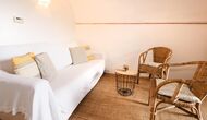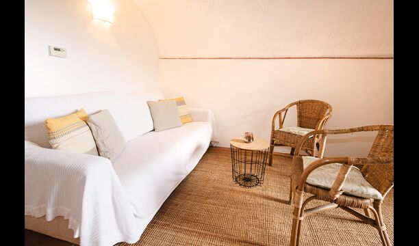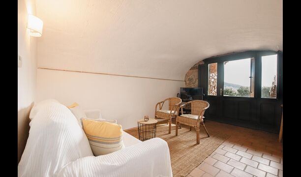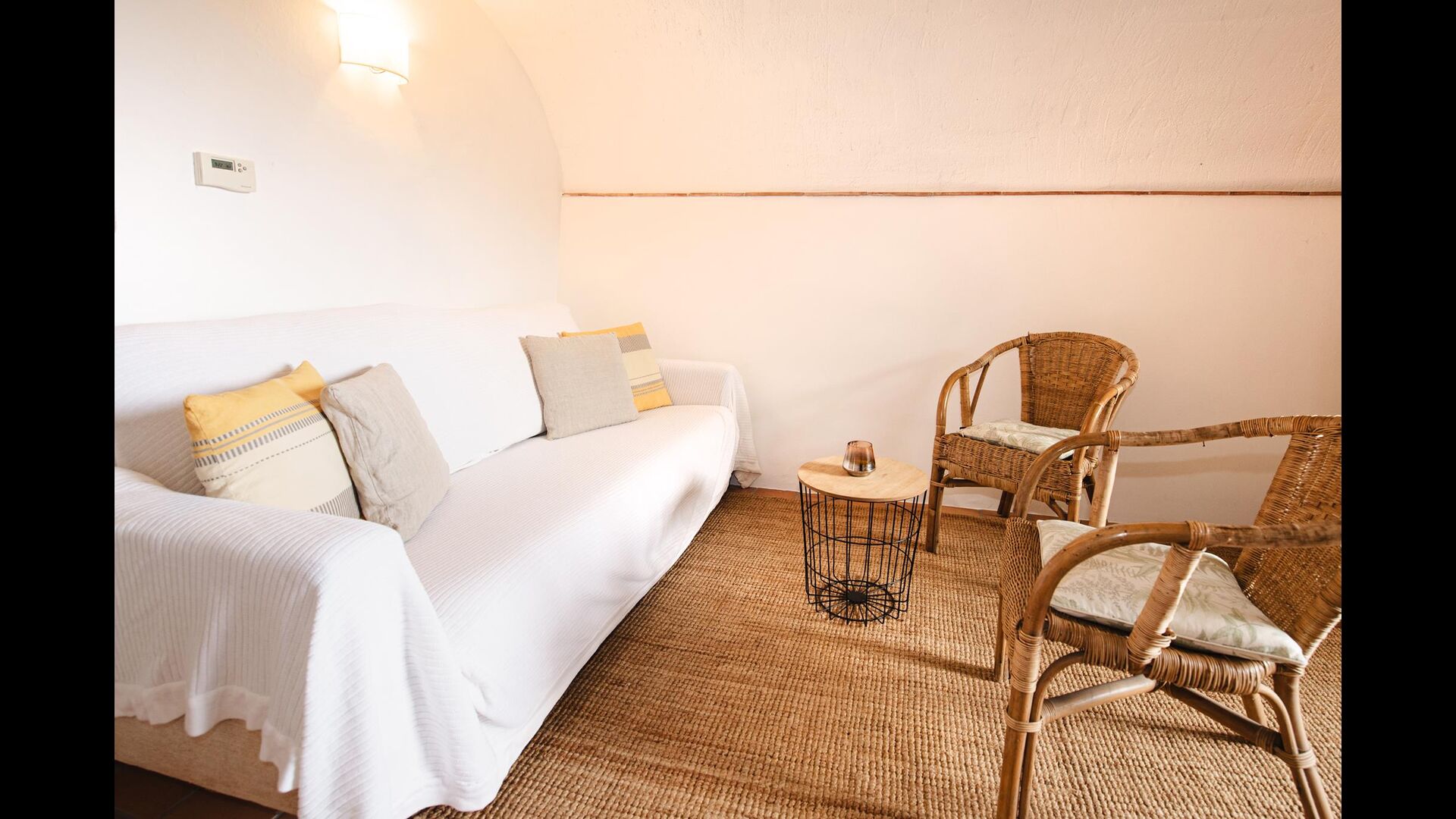Ved indgangen til La Cort er der en privat terrasse med et siddearrangement bestående af træstole og –bord. Lige inden for døren er den hyggelige stue, med sofa og satellitfjernsyn.