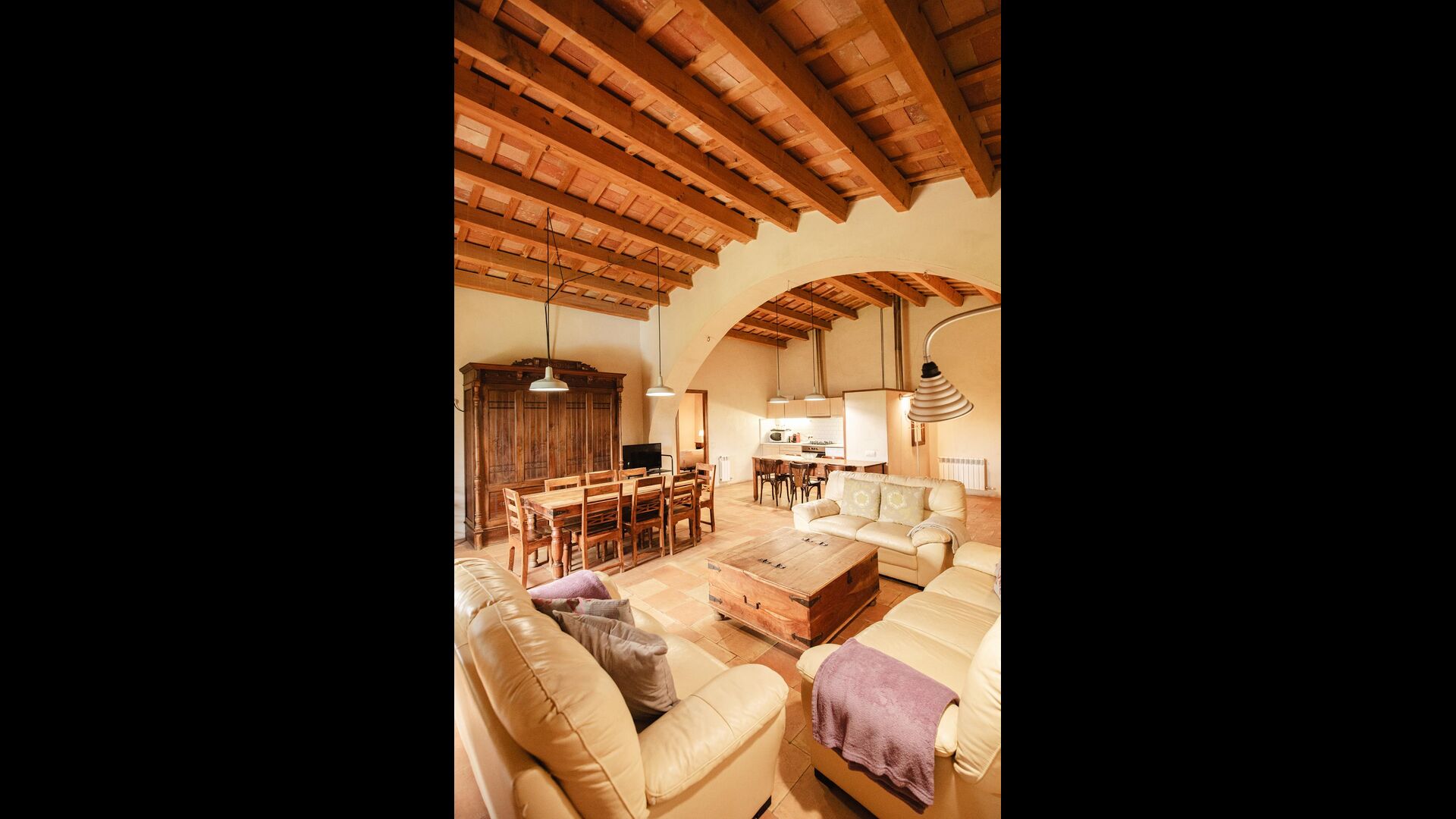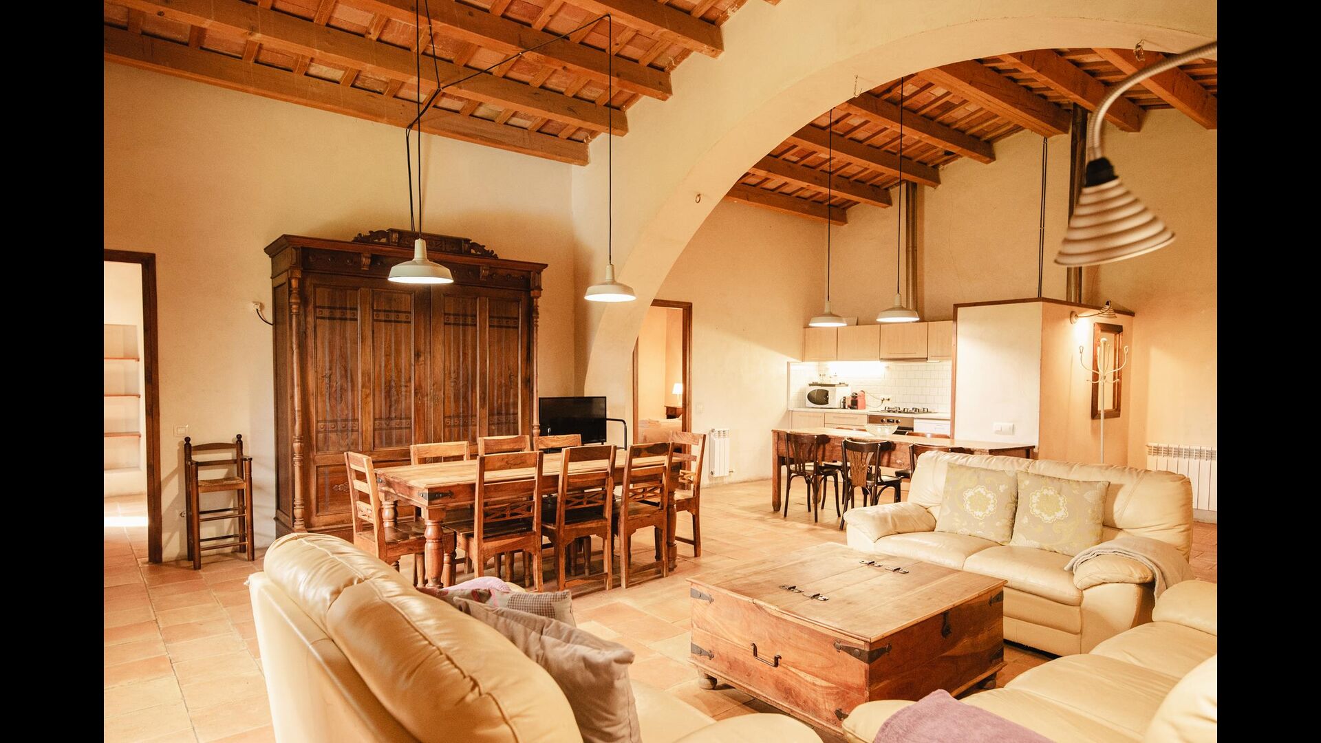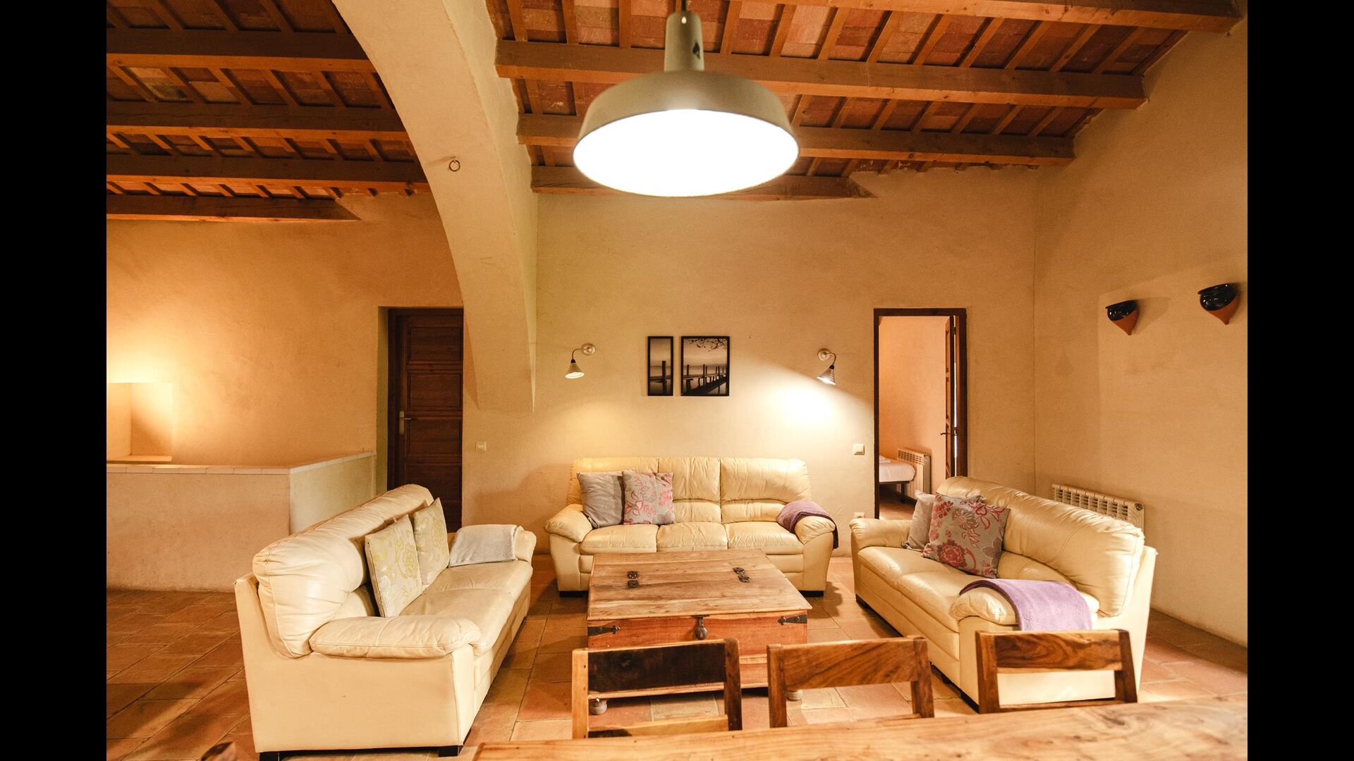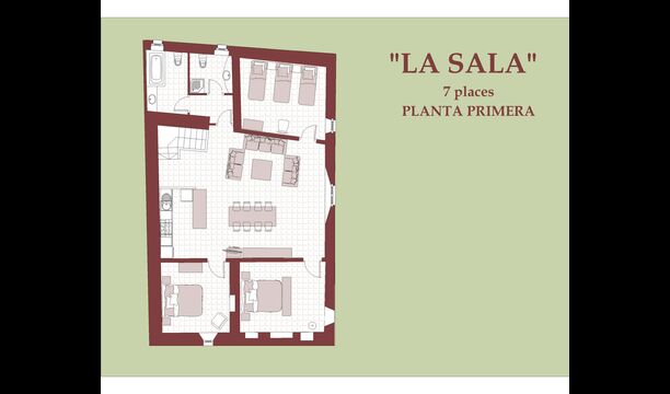 Lejligheden til 7 personer ligger på 1. etage i hovedbygningen. Man går igennem et fælles aktivitetsrum, før man når til La Sala. Her bliver man mødt af et stort opholdsrum, der fungere som en stue og er smukt indrettet i traditionel catalansk stil med moderne træk. I stuen finder man to flotte spiseborde samt tre sofaer, et sofabord og et fjernsyn, så der selvfølgelig også er god mulighed for at slappe af. Ud over disse siddearrangementer finder man diverse malerier og vægdekorationer, som giver en rar stemning. Det fuldt udstyrede køkken er forbundet med opholdsstuen og er inklusivt vaskemaskine og opvaskemaskine.