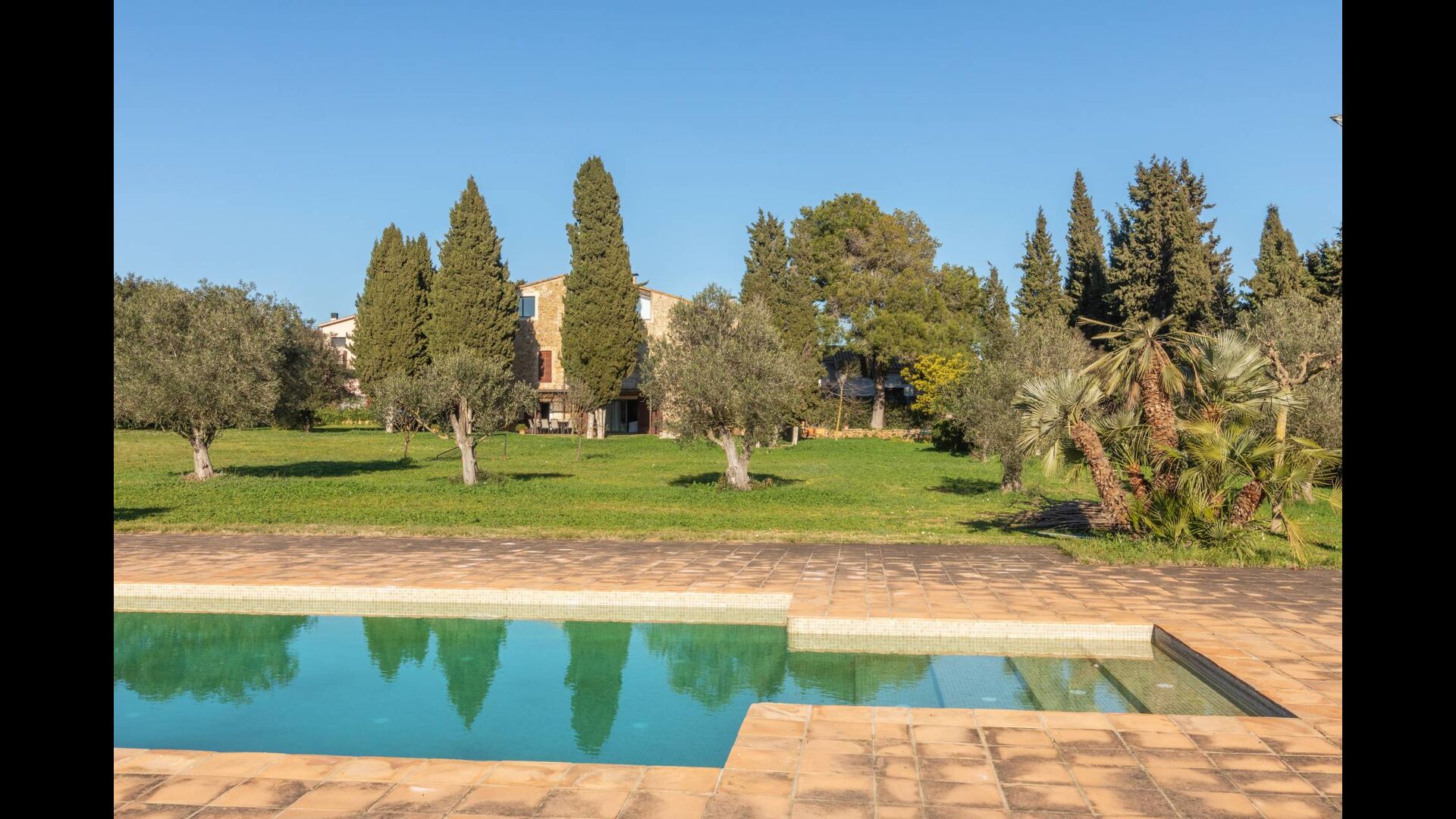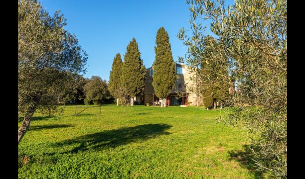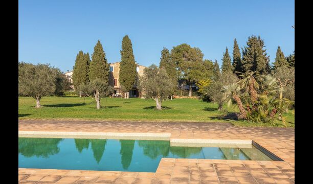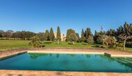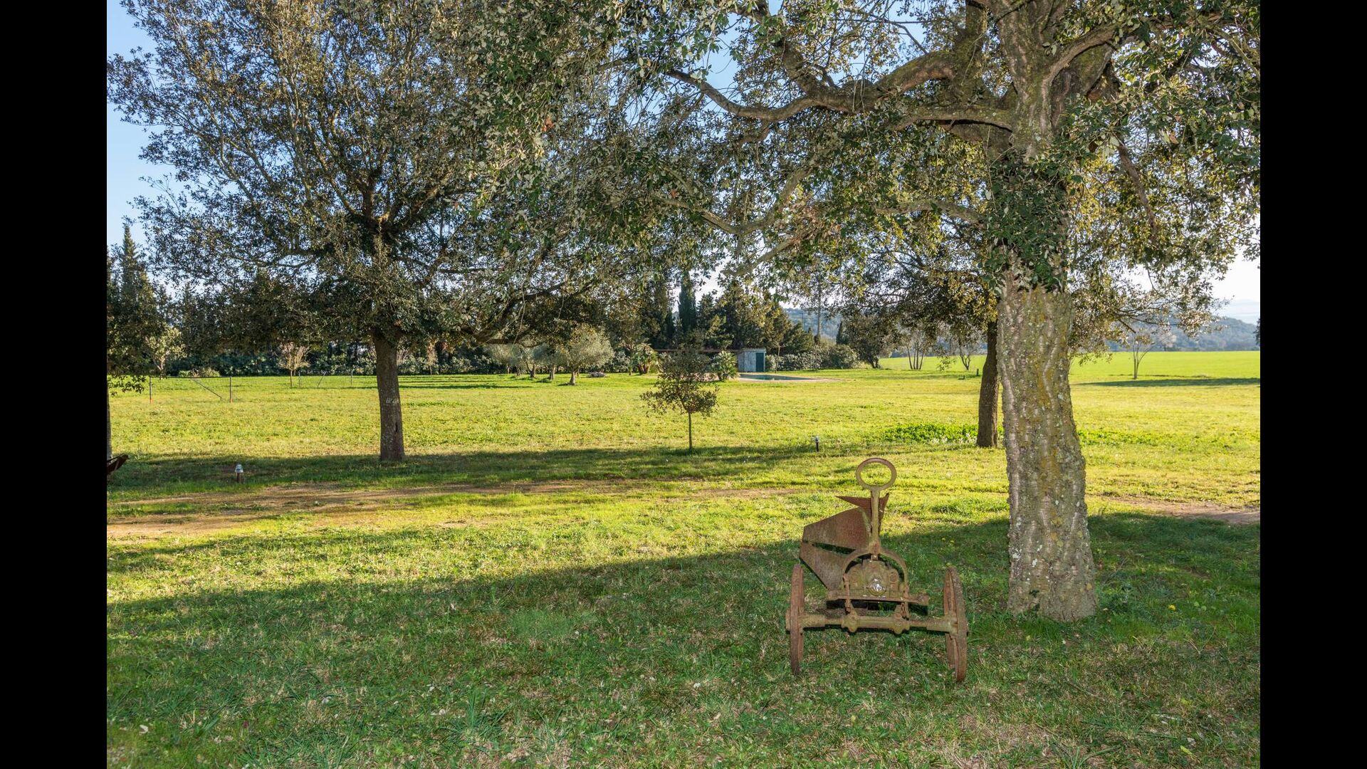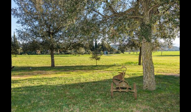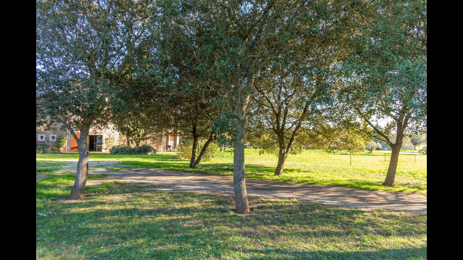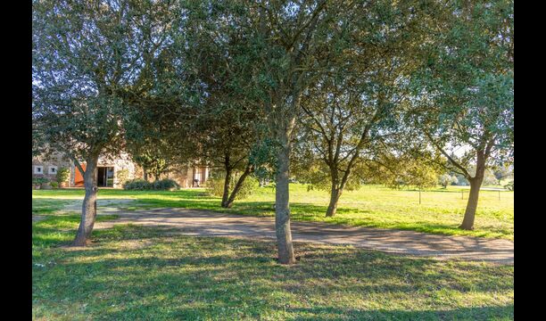 Ejendommen nås via en træallé, der fører frem til masiaen, omgivet af 30.000 m² privat grund og anlagte haver.