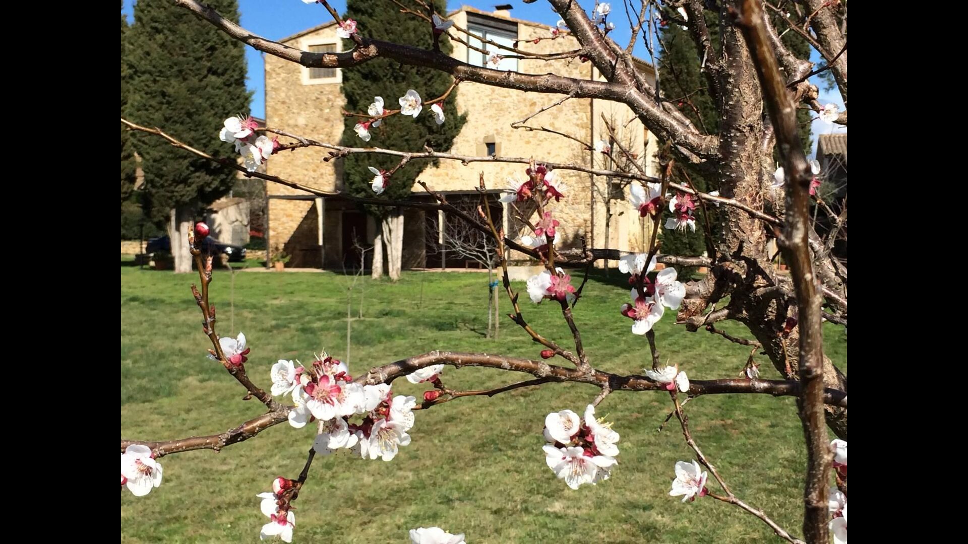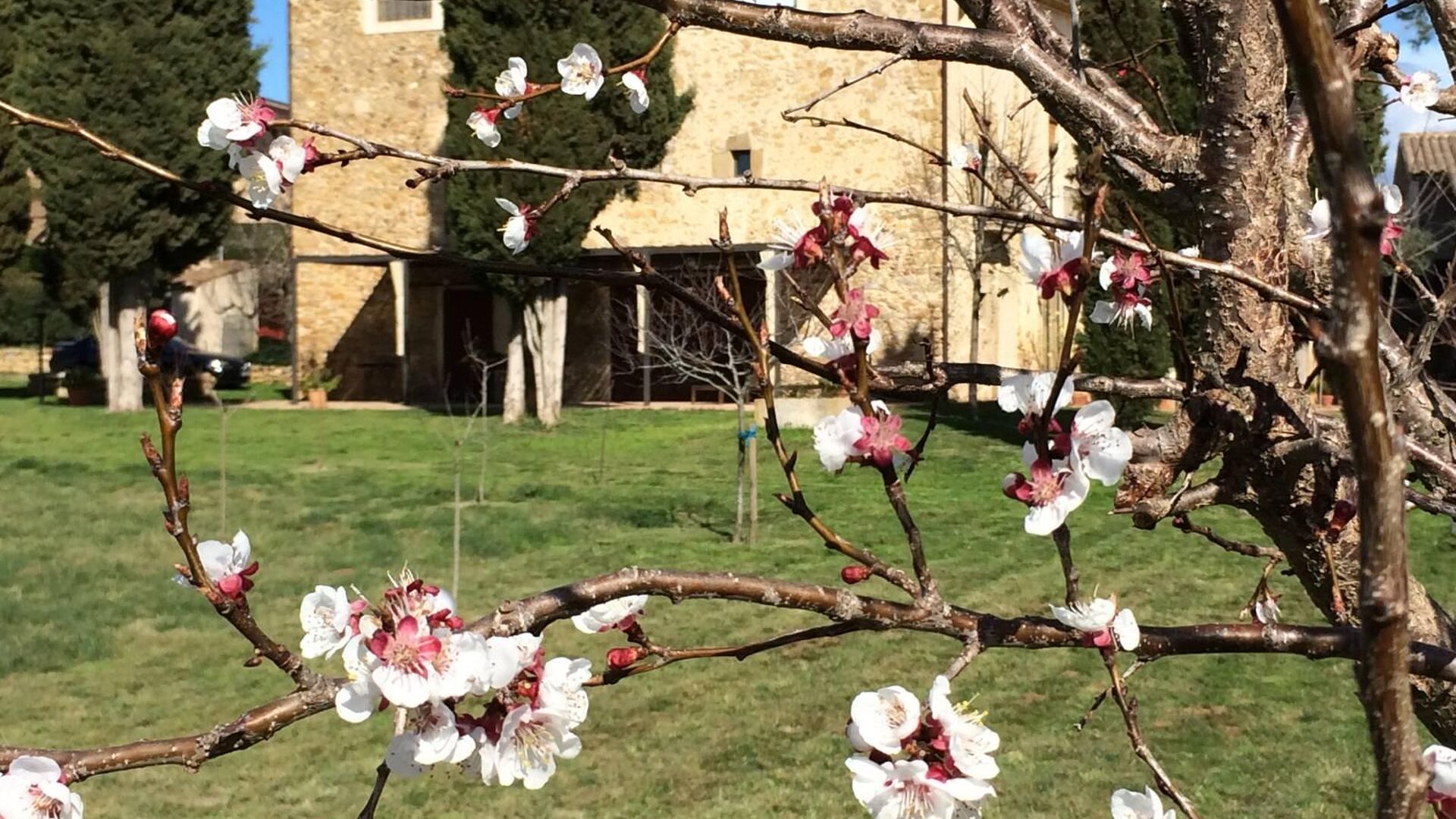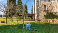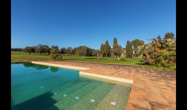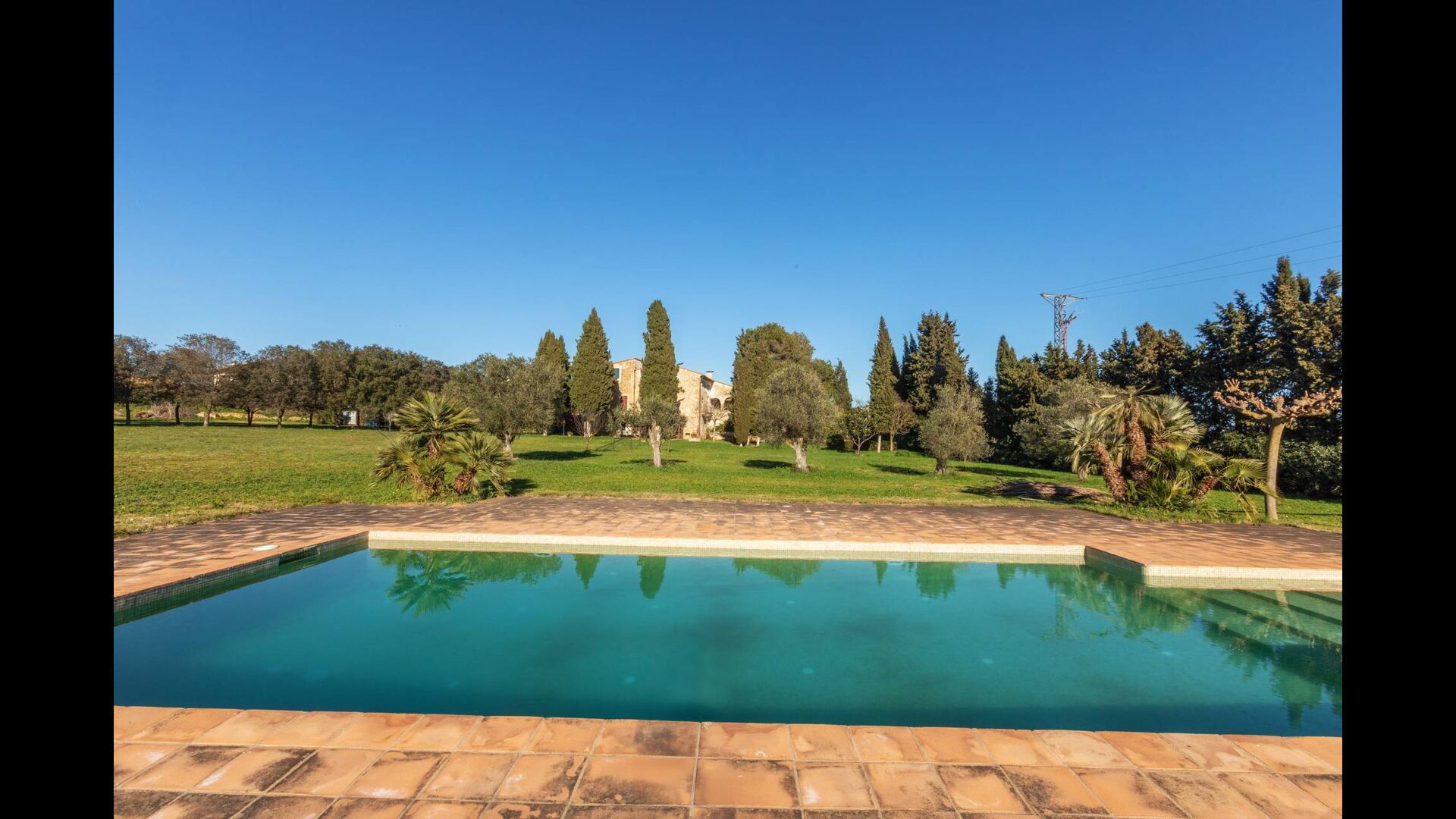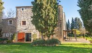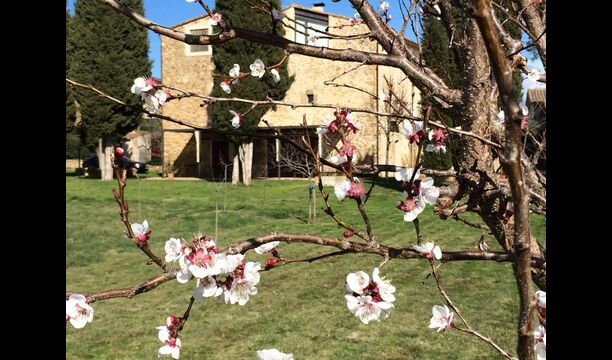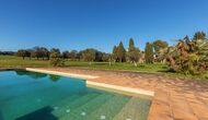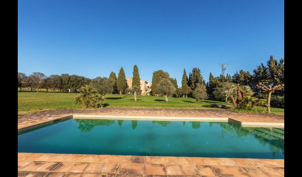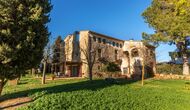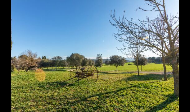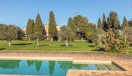 Ejendommen nås via en træallé, der fører frem til masiaen, omgivet af 30.000 m² privat grund og anlagte haver.