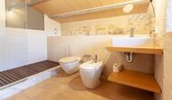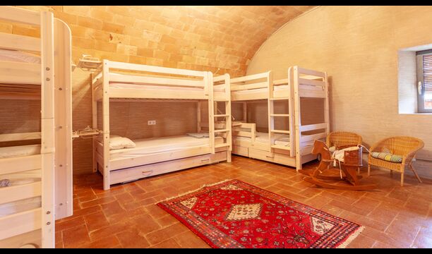 På denne etage findes også fem soveværelser: tre dobbeltværelser, ét værelse med to enkeltsenge og ét værelse med tre køjesenge til op til seks børn samt to badeværelser med bruser.