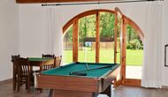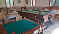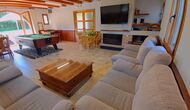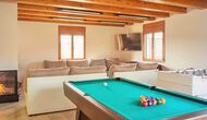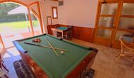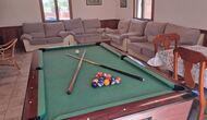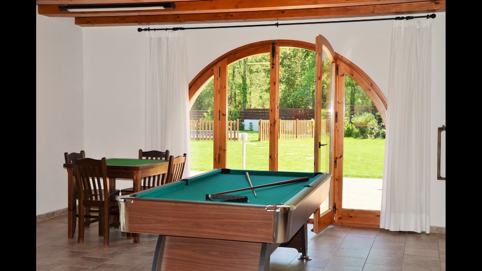 Når man træder ind af ferievillaens entré, er der til venstre en opholdsstue, hvor der er sofaer, billard, stor fladskærm og musikanlæg – et sted, hvor man kan slappe af indenfor. Til højre ligger husets meget veludstyrede køkken, der har en deepfrier (som altid er fyldt med frisk olie til ankommende gæster), mikroovn, flere køleskabe, nespressomaskine, kæmpe ovn, stor opvaskemaskine samt meget andet. Her er der ligeledes en flot spisestue – og der er ligeledes udgang til et udendørs spiseområde, så man kan nyde de lange, lune sommeraftener.
