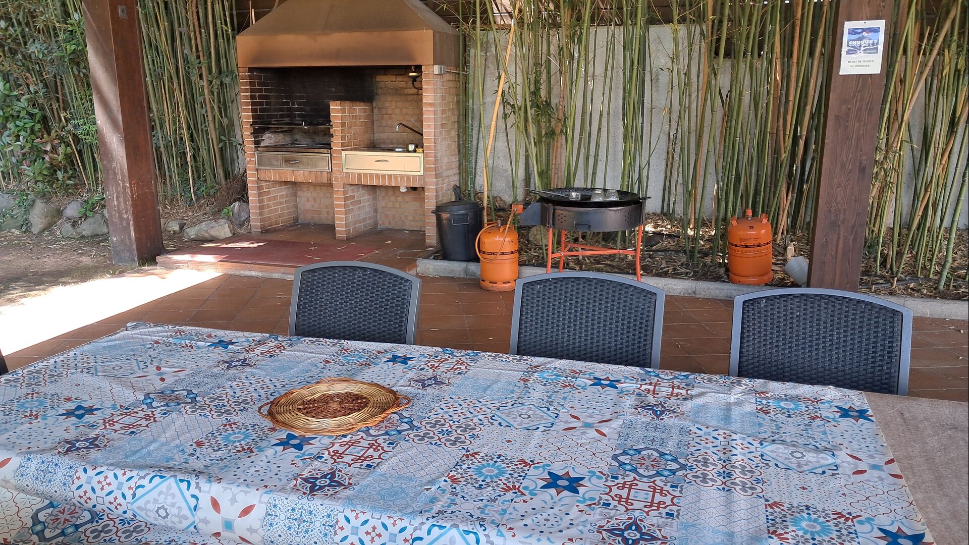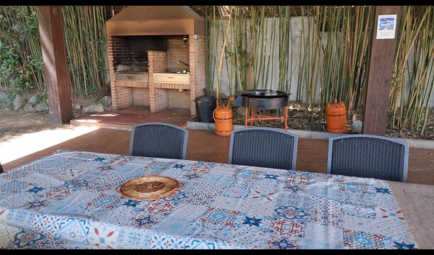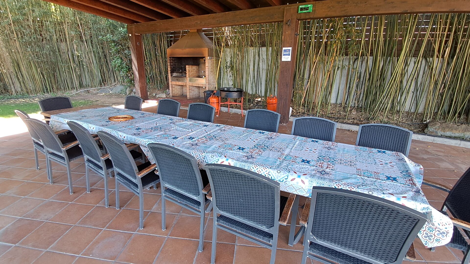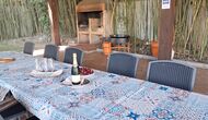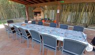 Der er en kæmpe overdækket terrasse, hvor hele feriegruppen kan sidde ude og spise. Der er naturligvis en stor grill, hvor maden kan tilberedes.