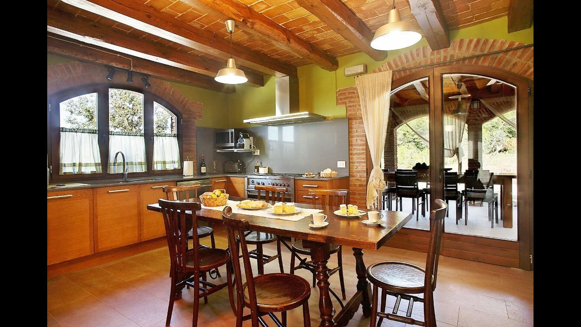 Indenfor er huset flot indrettet: Der er stenvægge og et flot bjælkeloft i alle rummene. Der er en stue med store, bløde sofaer og en pejs. Ved siden af ligger husets moderne køkken med alt fra opvaskemaskine og ovn til brødrister og mikroovn – det er dejligt veludstyret og rummer de køkkenredskaber, i har brug for. I kan spise indenfor her i køkkenet eller på den anden side af glasdøren, der leder jer ud til den overdækkede terrasse, hvor der er et flot spisebord og hyggelig belysning i aftentimerne.