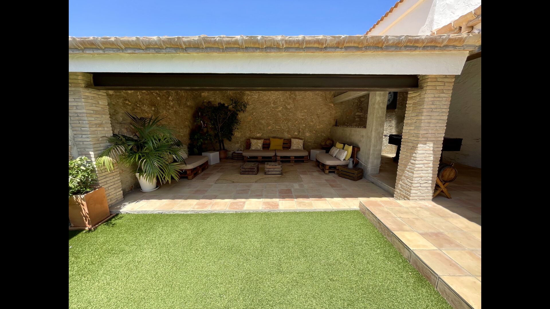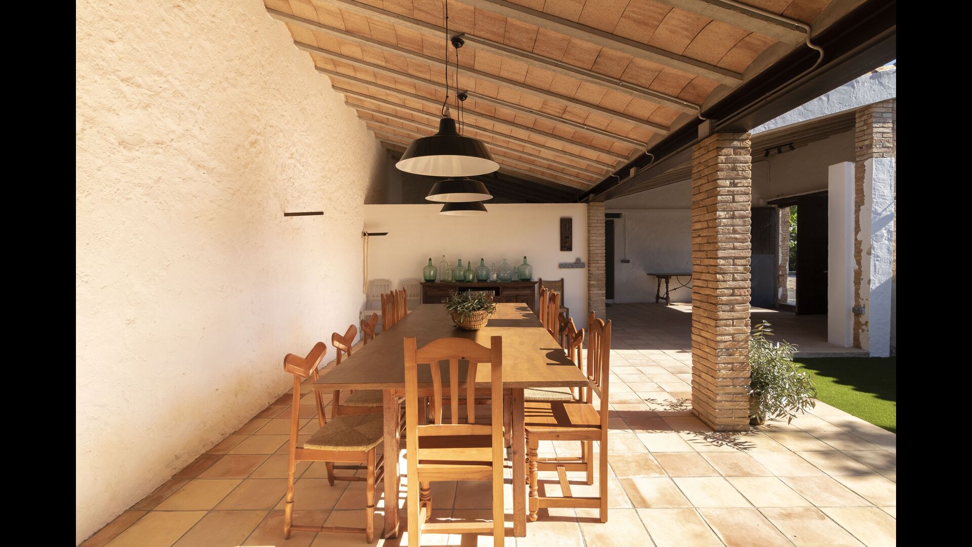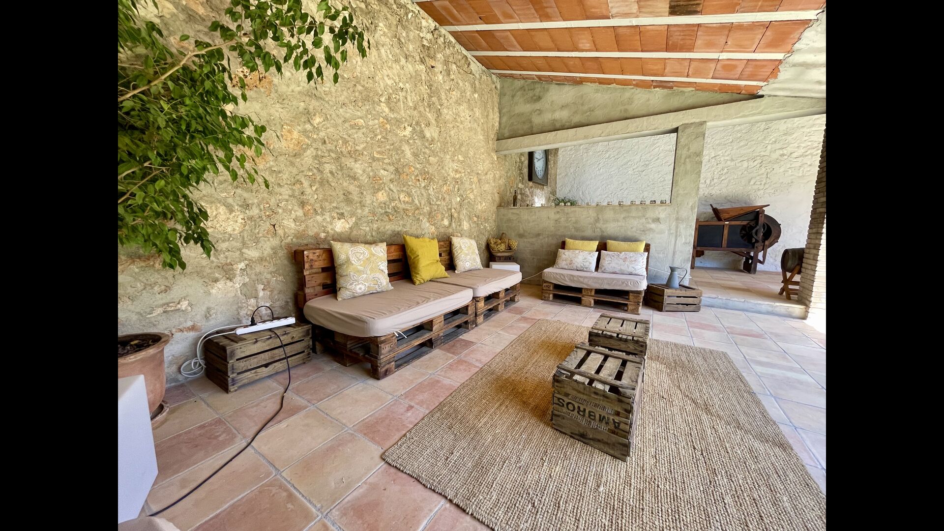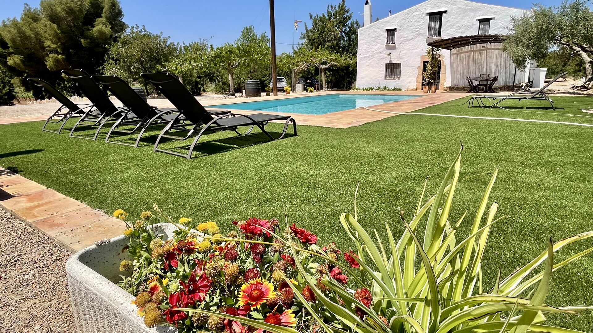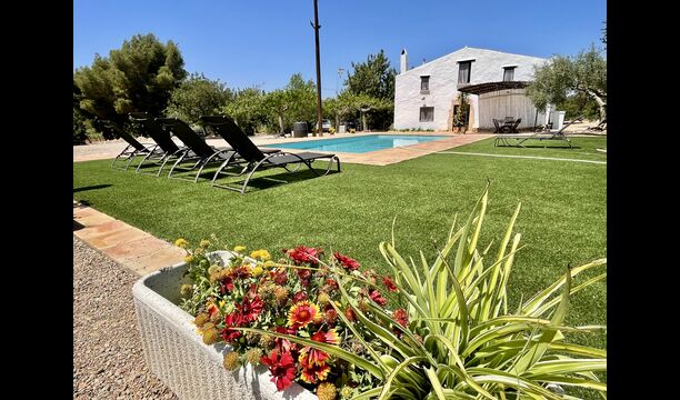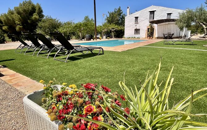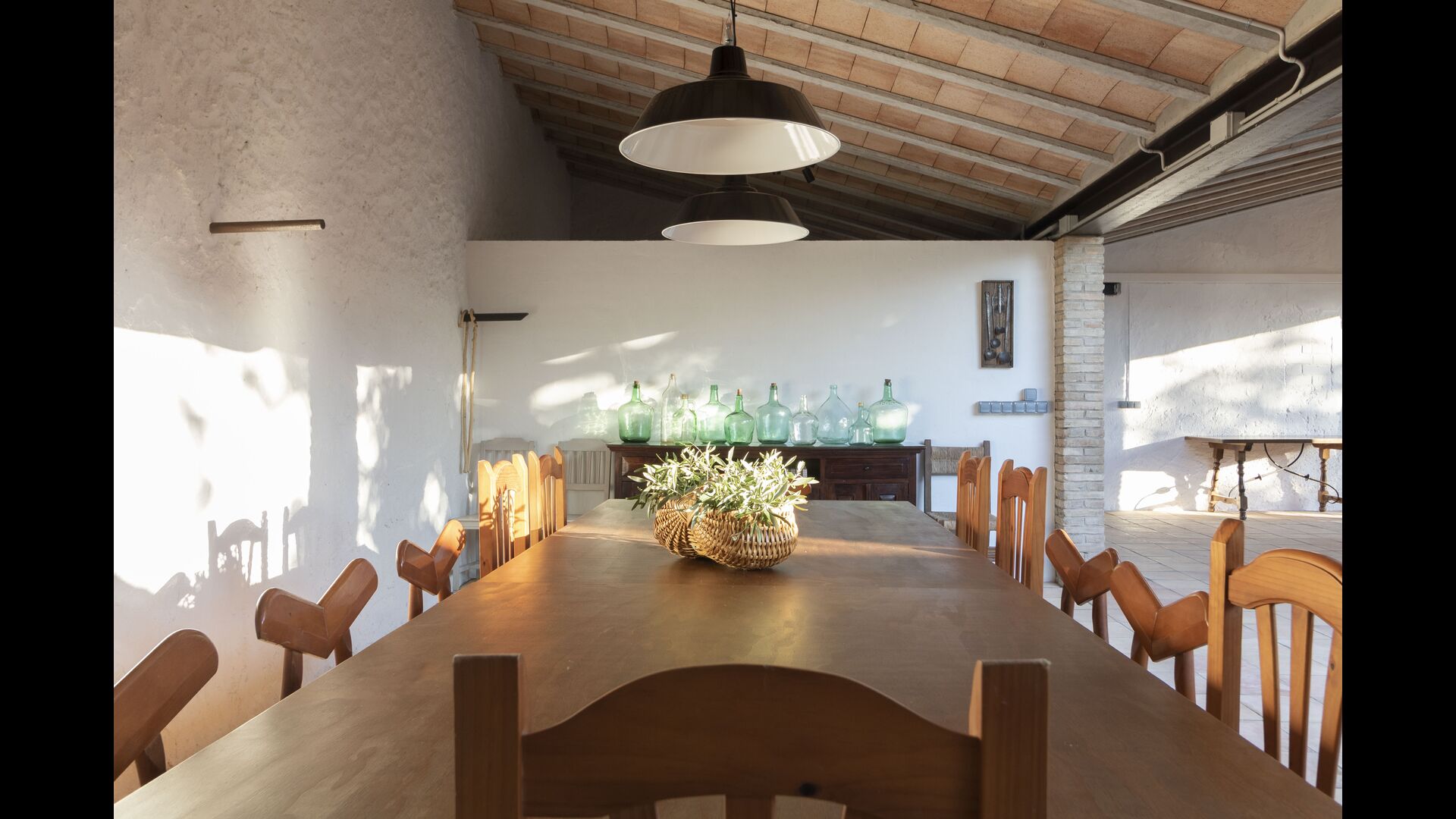 Ved siden af hovedindgangen har huset også en delvist overdækket udendørsterrasse, perfekt til morgenmad og aftensmad ved det blidt klukkende vand i poolen, som i sig selv er ret stor og kommer med nogle liggestole. Uanset om du køler ned i poolen, slapper af i liggestolene eller nyder noget tapas på den udendørsterrassen, vil du være i stand til at se ud på det vidunderlige Catalanske landskab . En del af grunden til, at Casa Moma er så vidunderligt isoleret, er de 6 hektarer af skov og johannesbrødtræer og 3 hektarer af vinmarker og olivenlunde som omgiver ejendommen.