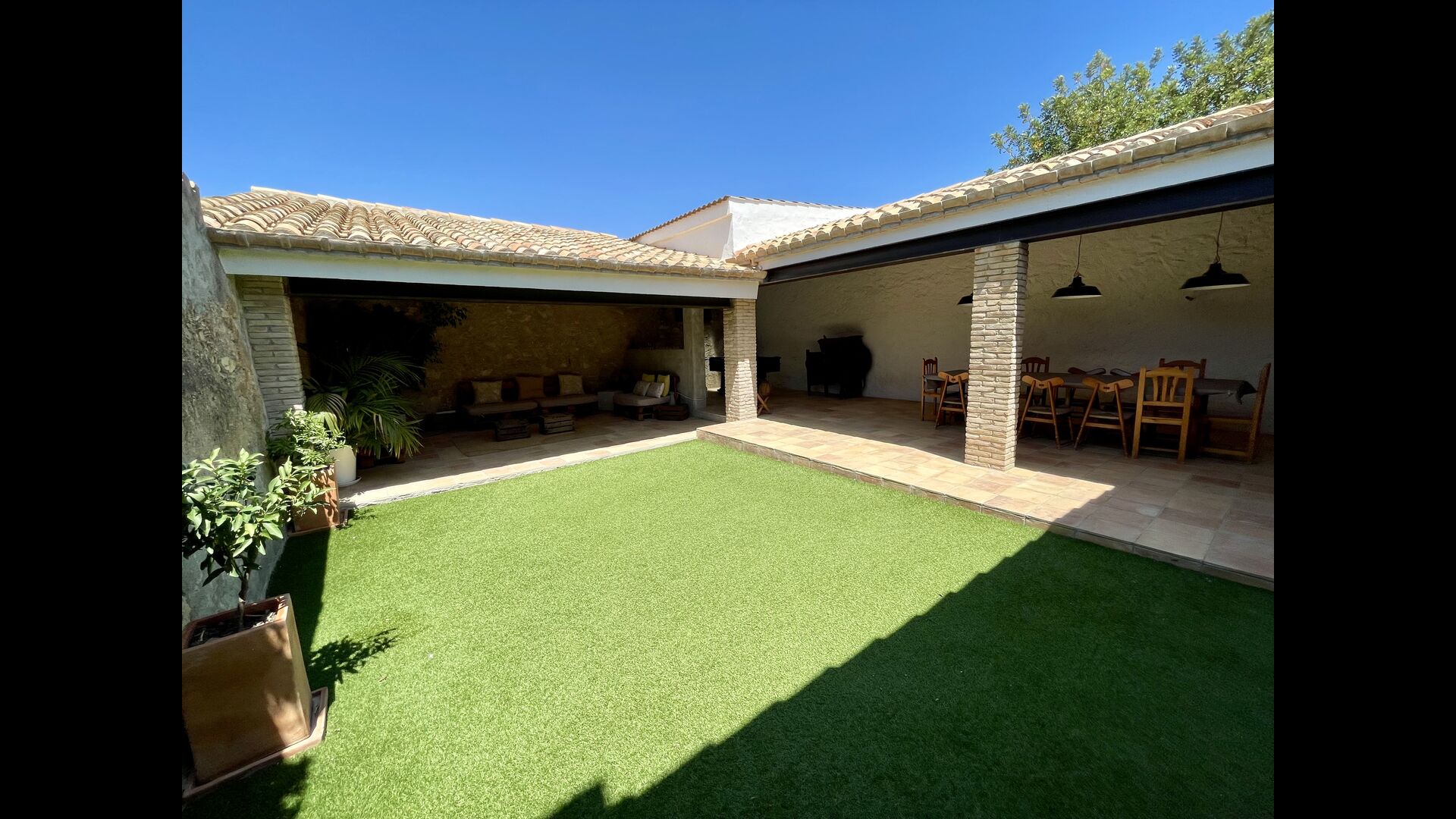 Huset har også en indendørs gårdhave, flankeret af en veranda forbundet med selve huset; verandaen har et afslapningsområde med flere behagelige stole og hyggelige dekorationer samt spisestue/bord, barbecue-udstyr og bordfodbold. Nyd solen i gården eller slap af i skyggen af verandaen – eller spisning med venner eller familie ved middagsbordet!