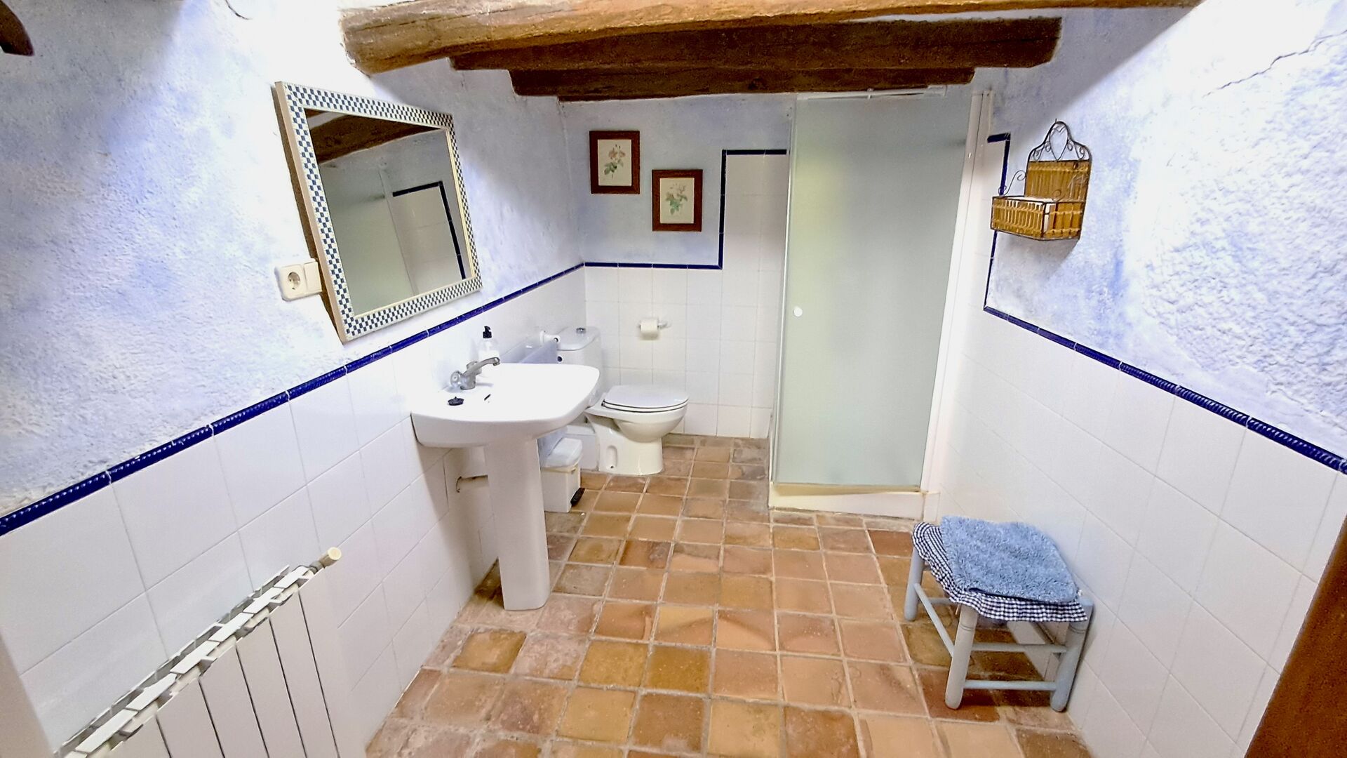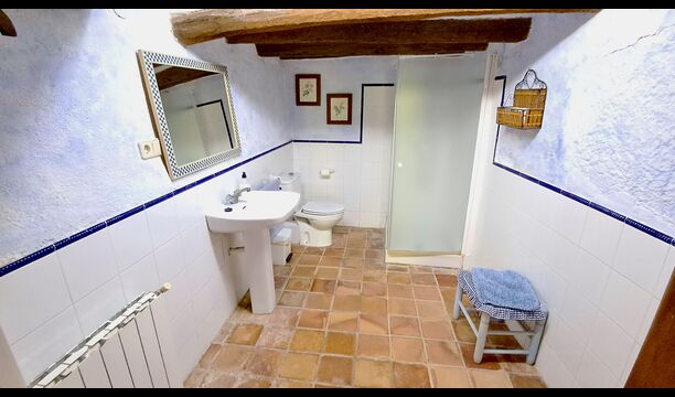 På 1.sal ligger køkkenet og den åbne spisestue, som har direkte adgang til den store terrasse, hvor der er en grill og en fantastisk udsigt. Perfekt til at holde hyggelige middage i de lune sommeraftener. Der ud over er der 3 meget store og rummelige soveværelser. De har alle forskelligt design, men har det til fælles at de er af meget høj standart og har et autentisk look. Der er et værelse der har én dobbelt seng, et med to enkeltsenge og et med to dobbeltsenge, så der kan sove fire personer hvis det er nødvendigt. På denne sal er der også et godt og veludstyret badeværelse. Køkkennet er veludstyret og som resten af huset af en høj kvalitet, og har den samme rustikke og autentiske indretning.