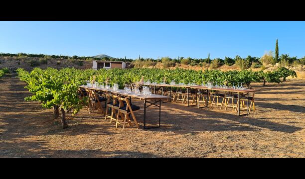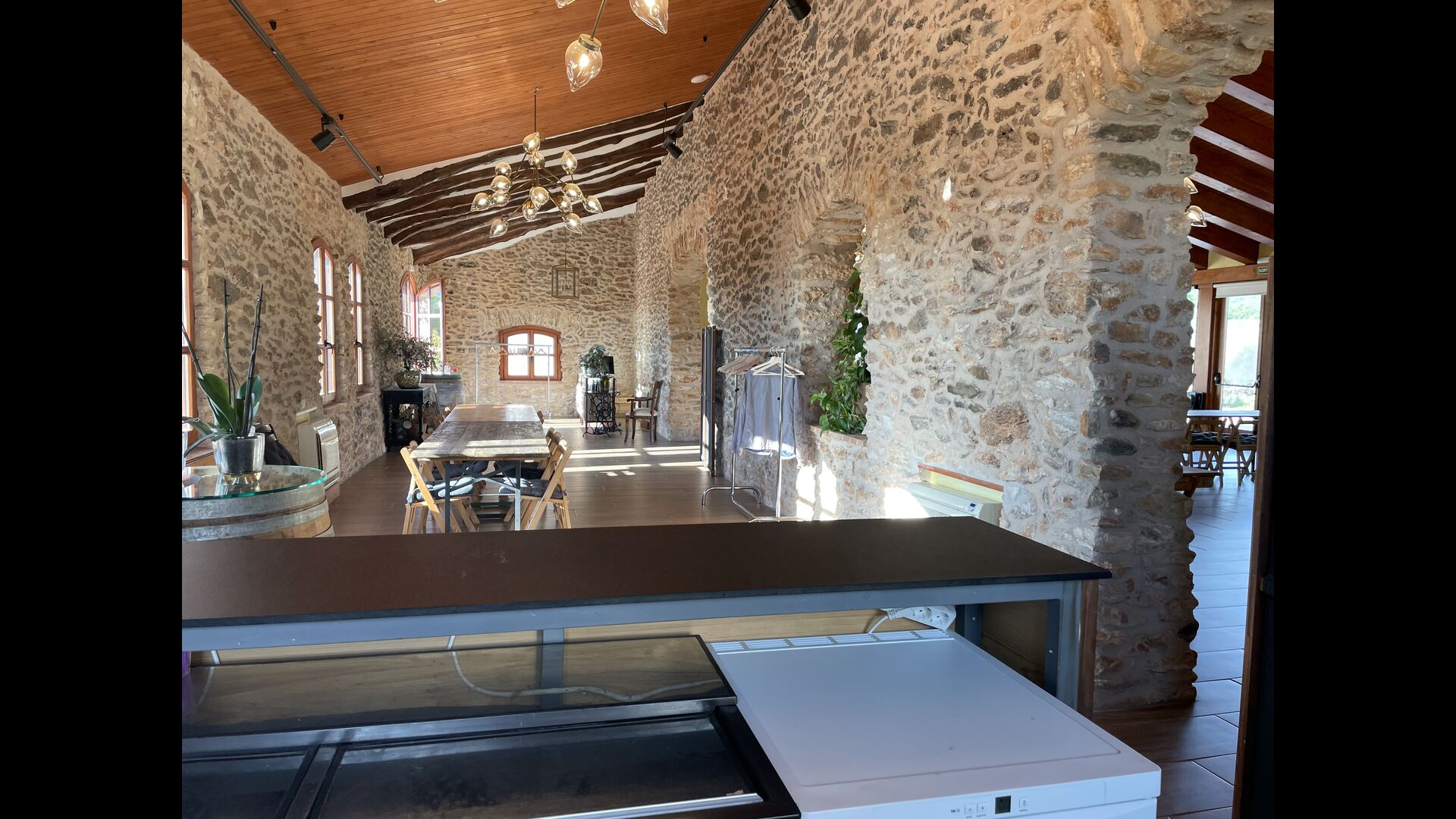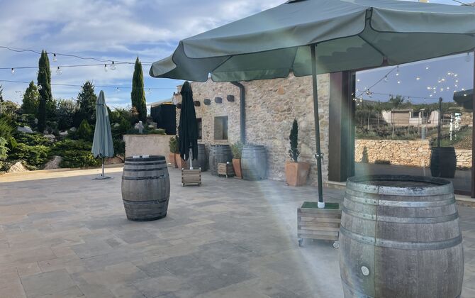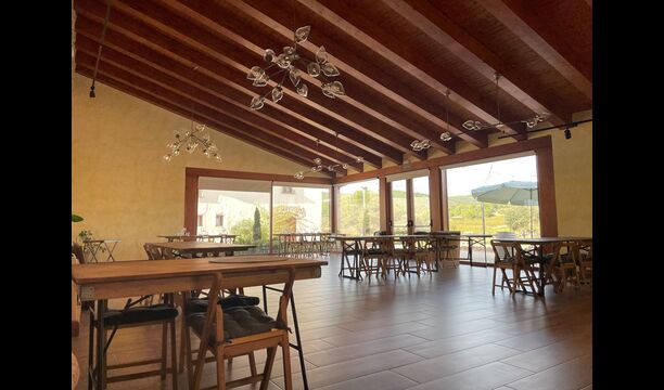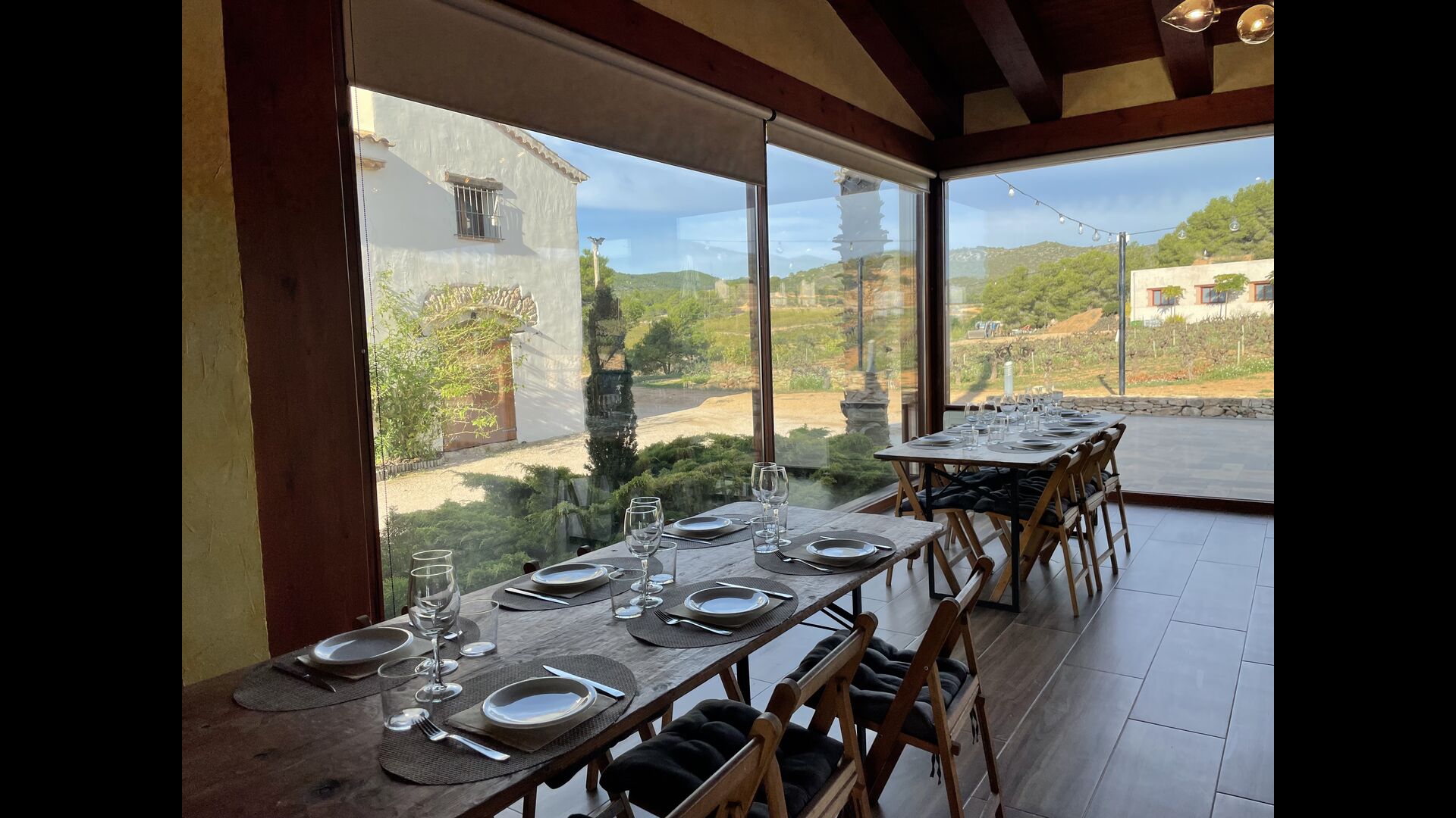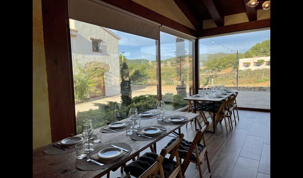 Den ligger direkte foran vinmarkerne i Cristina og Pere, og ofte flyttes arrangementet udenfor på terrassen eller endda i vinmarkerne. Indenfor giver de store panoramavinduer det perfekte bagtæppe til din fest, med udsigt over vinmarkerne og solnedgangen.