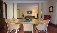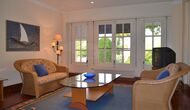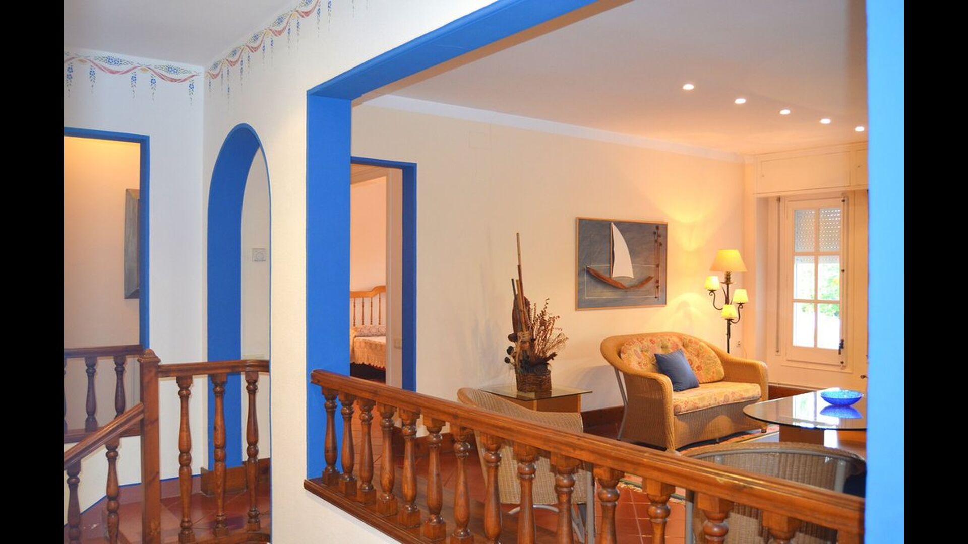 Resten af etagen er et meget stort fællesområde indrettet i maritim stil med en opholdsstue, hvor der er TV og DVD samt et spiseområde med et stort spisebord. Herfra kan du få adgang til den enorme terrasse med et spisebord til udendørs spisning og en tilhørende smuk udsigt. Da kanten er ikke så højt, anbefaler vi ikke dette hus til familier med mindre børn.