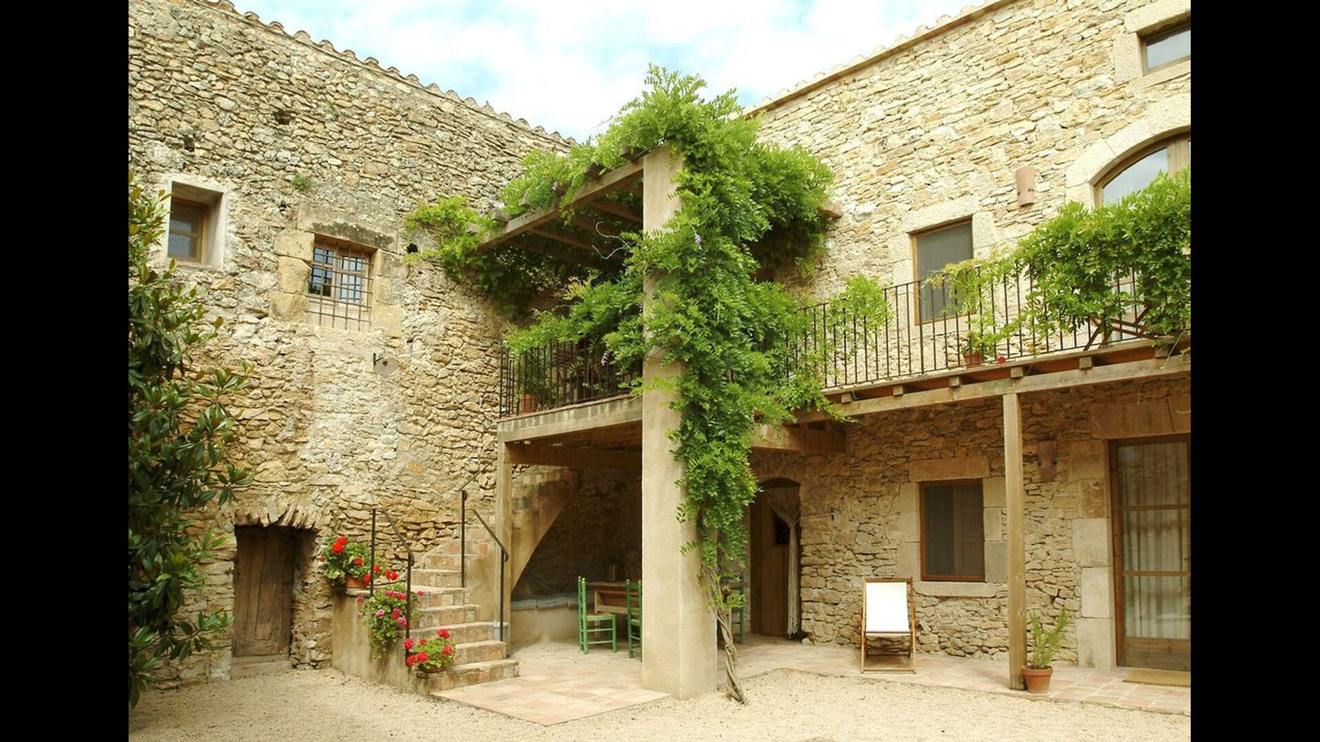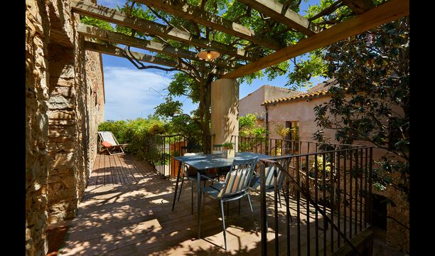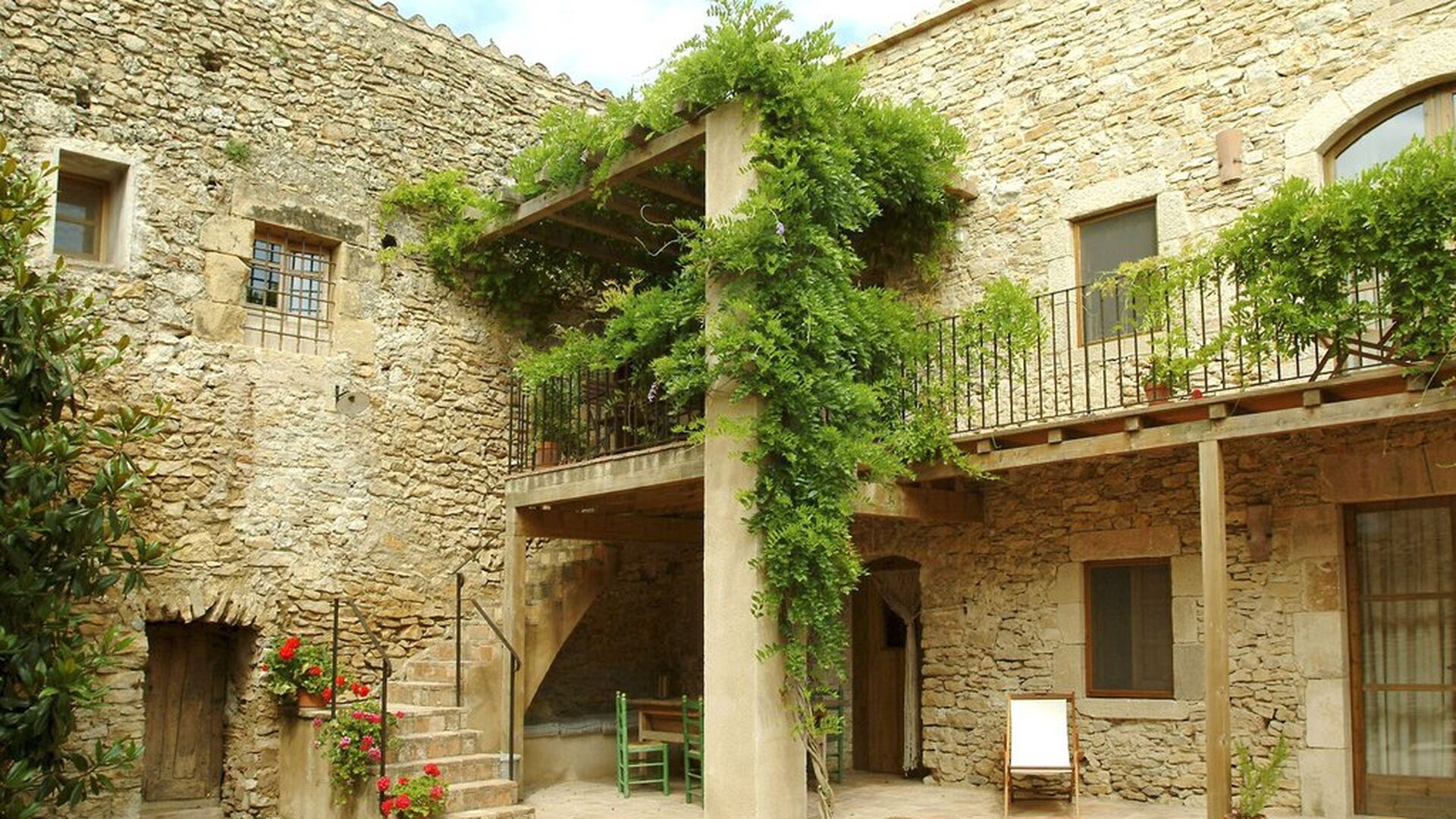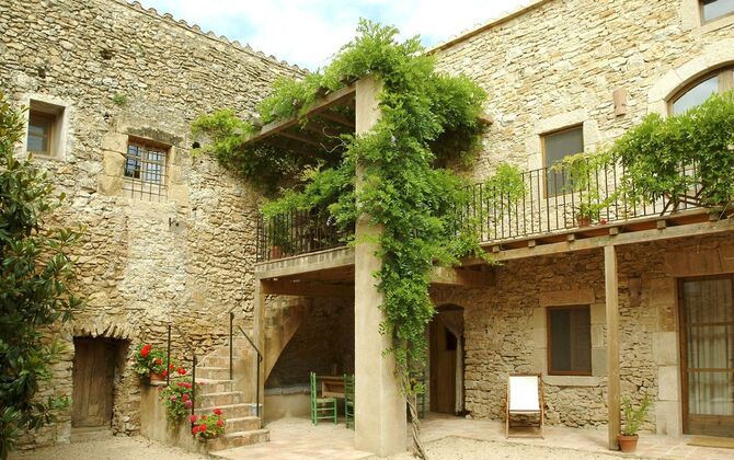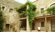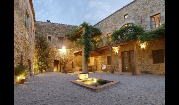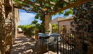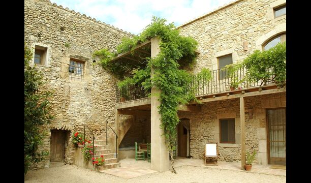 Denne lejlighed er beliggende øverst på første sal i højre side af den store gårdsplads, man bliver mødt af efter den store indgangsport af træ. Gårdspladsen og husene er bygget af sten, hvilket giver en rustik og autentisk atmosfære. Ud til gårdspladsen har denne lejlighed en hyggelig overdækket balkon, hvor det er oplagt at nyde de hjemmelavede måltider under de lune catalanske aftener. I dagstimerne er det også et perfekt sted at slappe af, da der er en afkølende skygge.