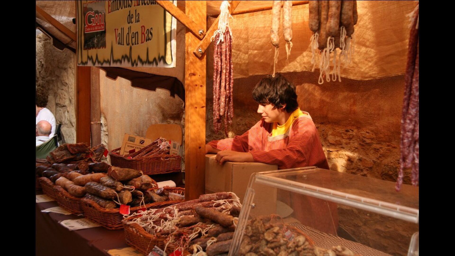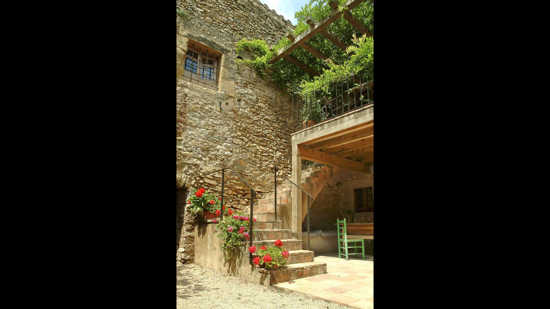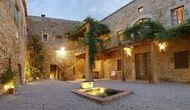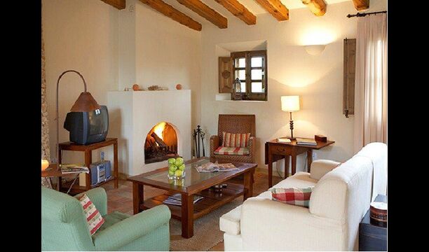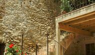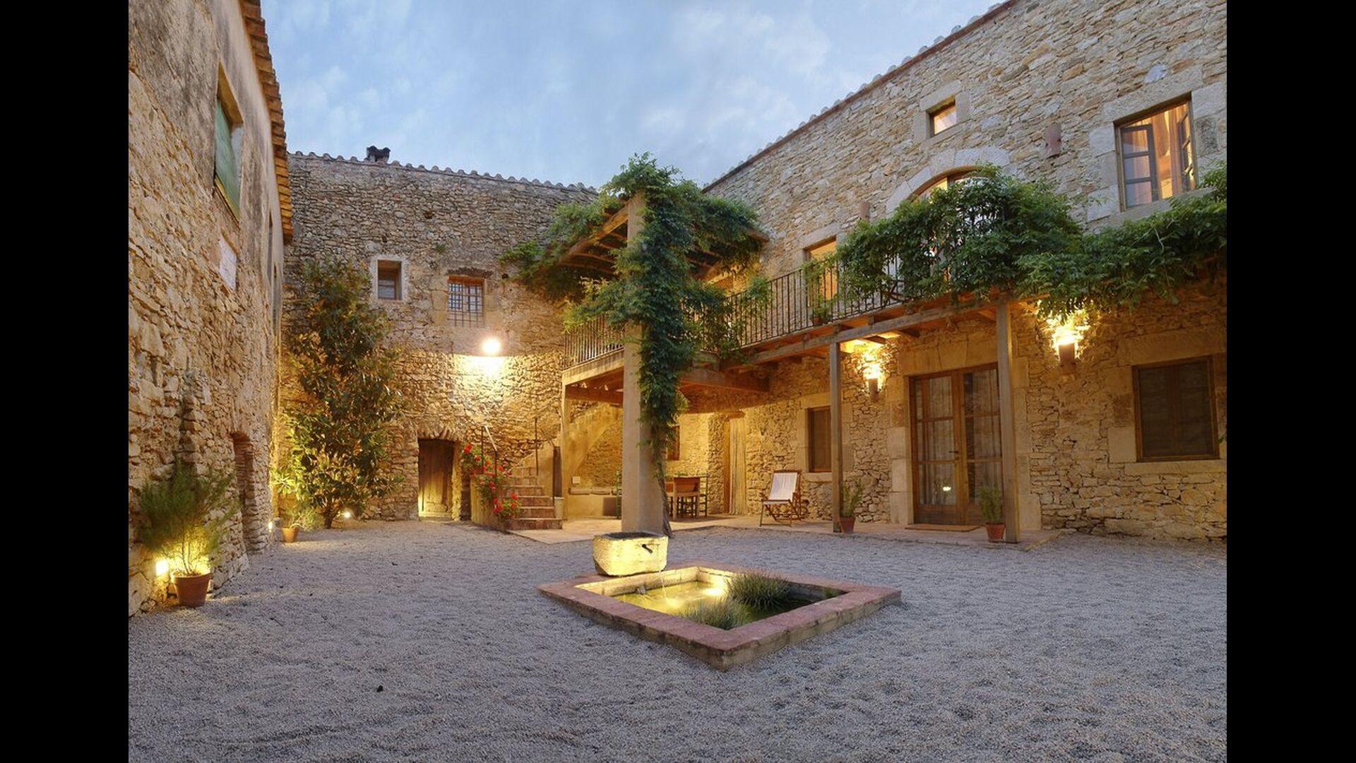 Denne lejlighed er beliggende øverst på første sal i højre side af den store gårdsplads, man bliver mødt af efter den store indgangsport af træ. Gårdspladsen og husene er bygget af sten, hvilket giver en rustik og autentisk atmosfære. Ud til gårdspladsen har denne lejlighed en hyggelig overdækket balkon, hvor det er oplagt at nyde de hjemmelavede måltider under de lune catalanske aftener. I dagstimerne er det også et perfekt sted at slappe af, da der er en afkølende skygge.