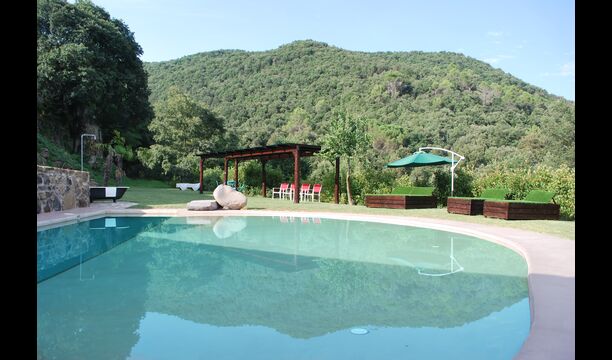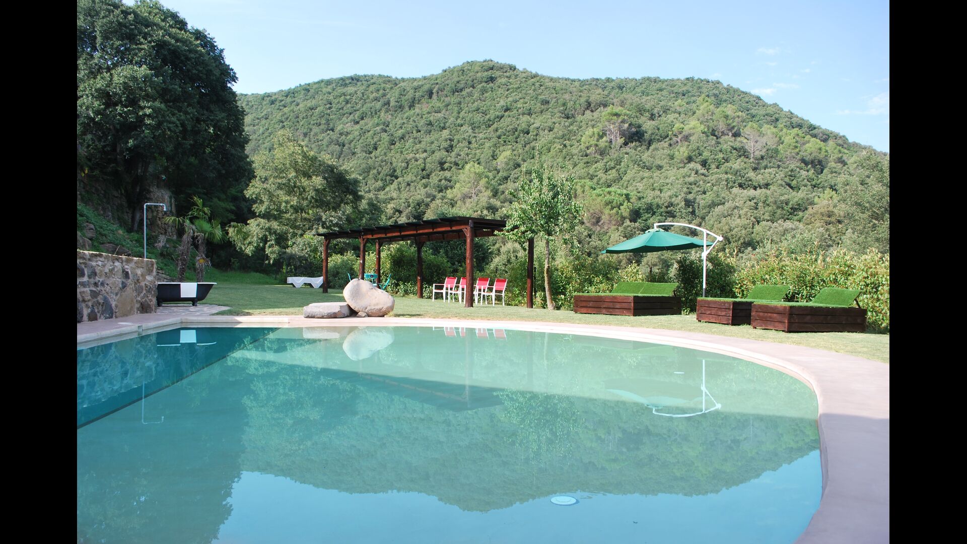 Udenfor er der bl.a. en veranda, den store, vidunderlige have, swimmingpoolen, BBQ-område, et smukt træ med skygge og meget mere. Poolen, som resten af huset, er flot designet i en meget moderne stil, og den er perfekt til børn, da den er inspireret af stranden. Et par minutters gang fra huset er der herudover en flod med et smukt naturligt vandfald, hvor man kan tage en dukkert!