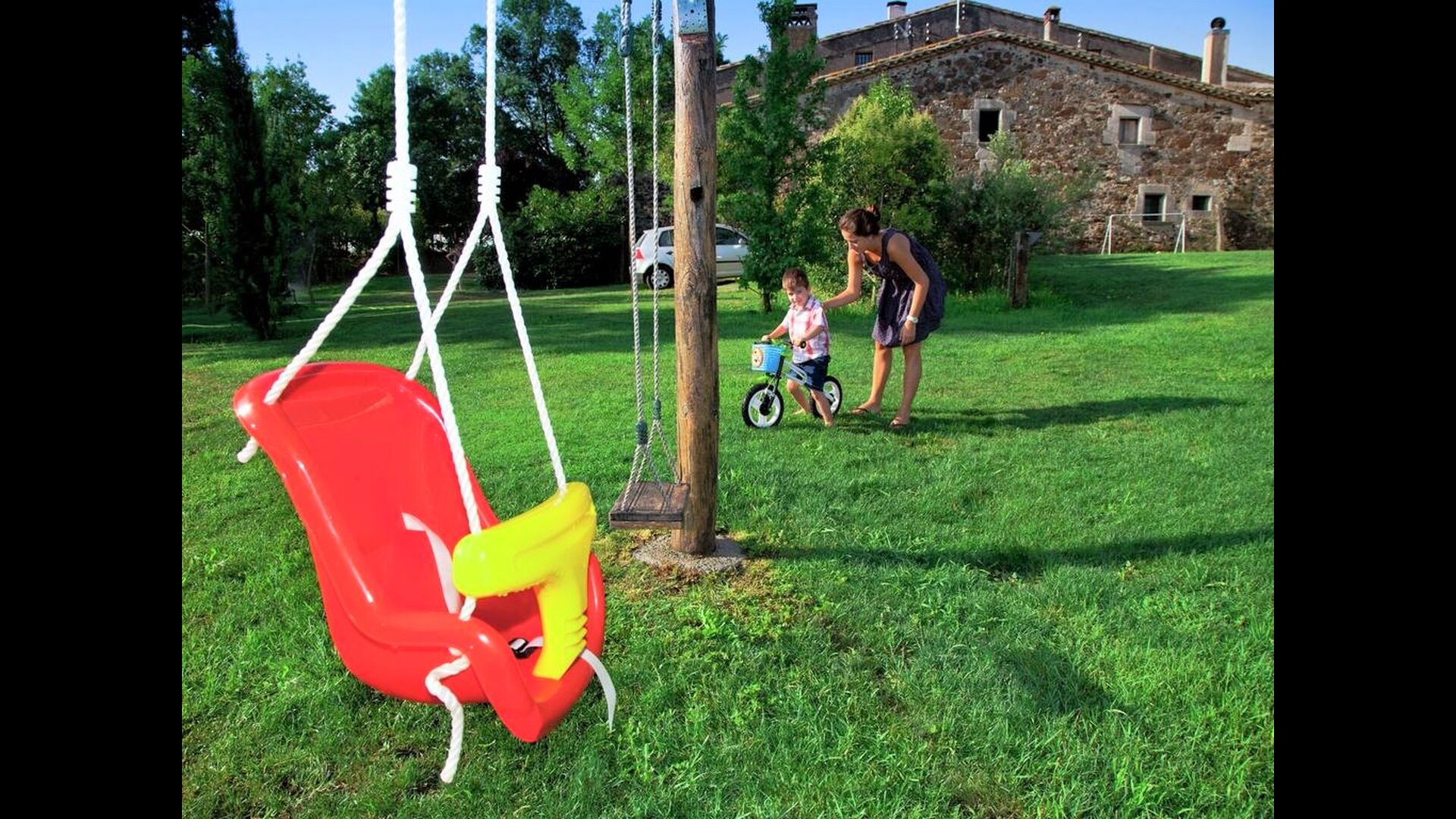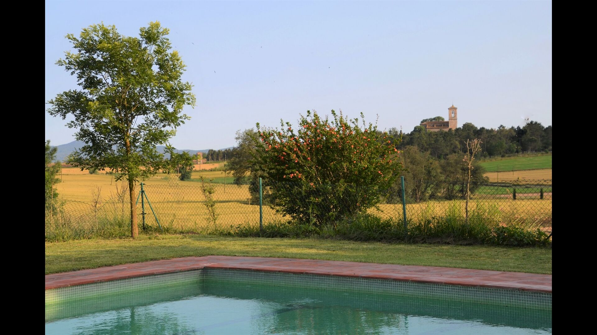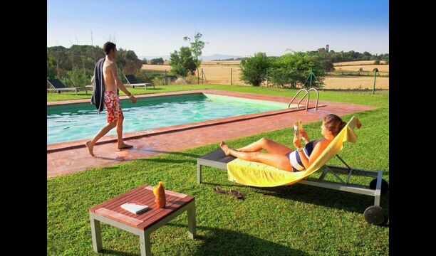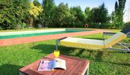 Går man igennem den enorme have, finder man det indhegnede, luksuriøse poolområde. Udover den store pool på 12x6 med varierende dybder, der er delt med de to andre lejligheder, er der diverse solstole, borde, skyggeområder etc., så der er lagt op til optimal afslapning i den dejlige catalanske sol med mulighed for at hoppe i den forfriskende pool. Haven byder desuden også på adskillige skyggeområder med tilhørende siddearrangement, hvor man altid kan finde sig et sted i den skønne natur og læse en bog. Der er endvidere en legeplads i haven til de mindre i feriegruppen, så de kan have det sjovt og underholde dem selv.