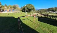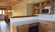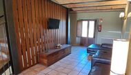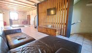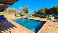 Nedenunder, hvor det fuldt udstyrede køkken er, er det lavet sådan, at der er et åbent spiseområde med et langt spisebord. Herfra er der direkte adgang til den overdækkede og udendørs terrasse, som også har en grill. Det er et glimrende sted, da gruppen kan være sammen, selvom nogle er i køkkenet, på terrassen eller ved grillen. Fra terrassen kan du se poolområdet på den anden side af haven. For at komme herhen skal du bare krydse haven, som er stor nok til en omgang fodbold. Ved poolområde kan du nyde solen i de liggestolene eller tage en afkølende dukkert.