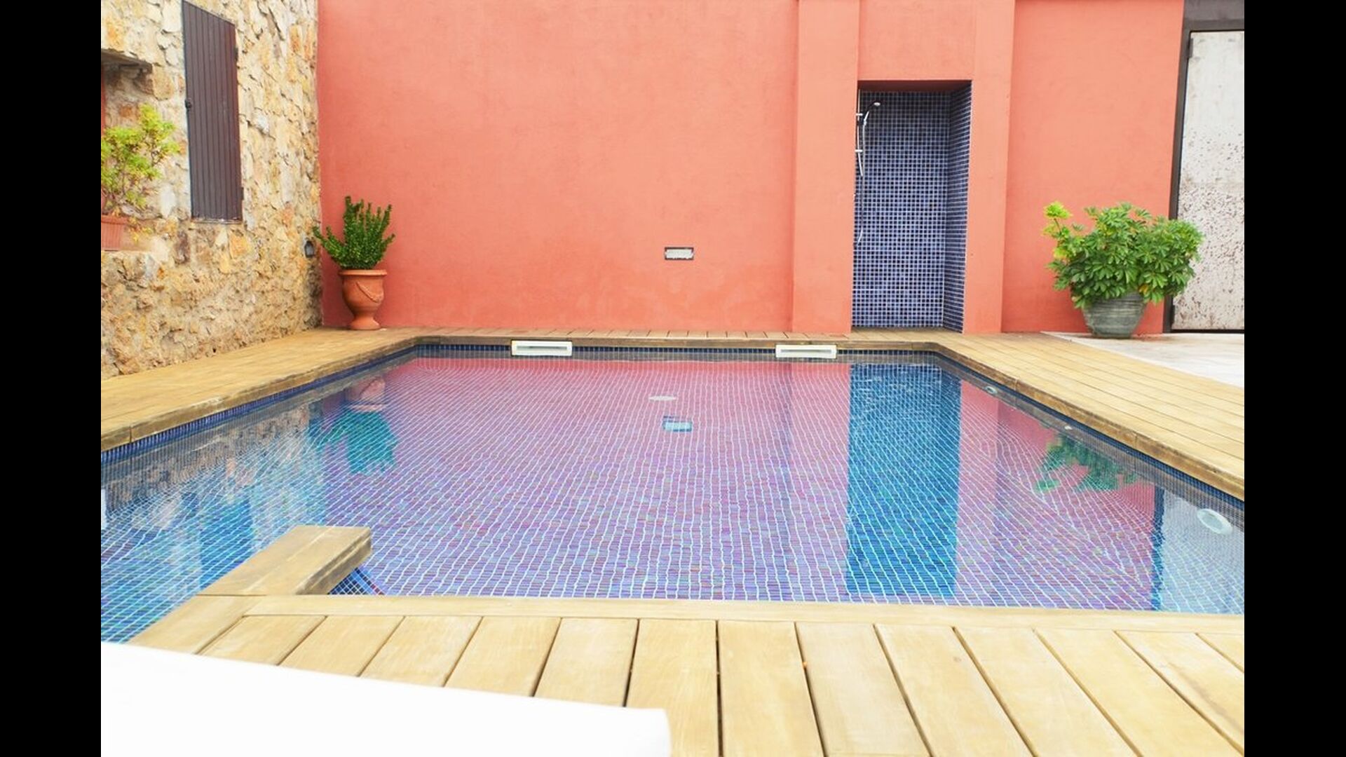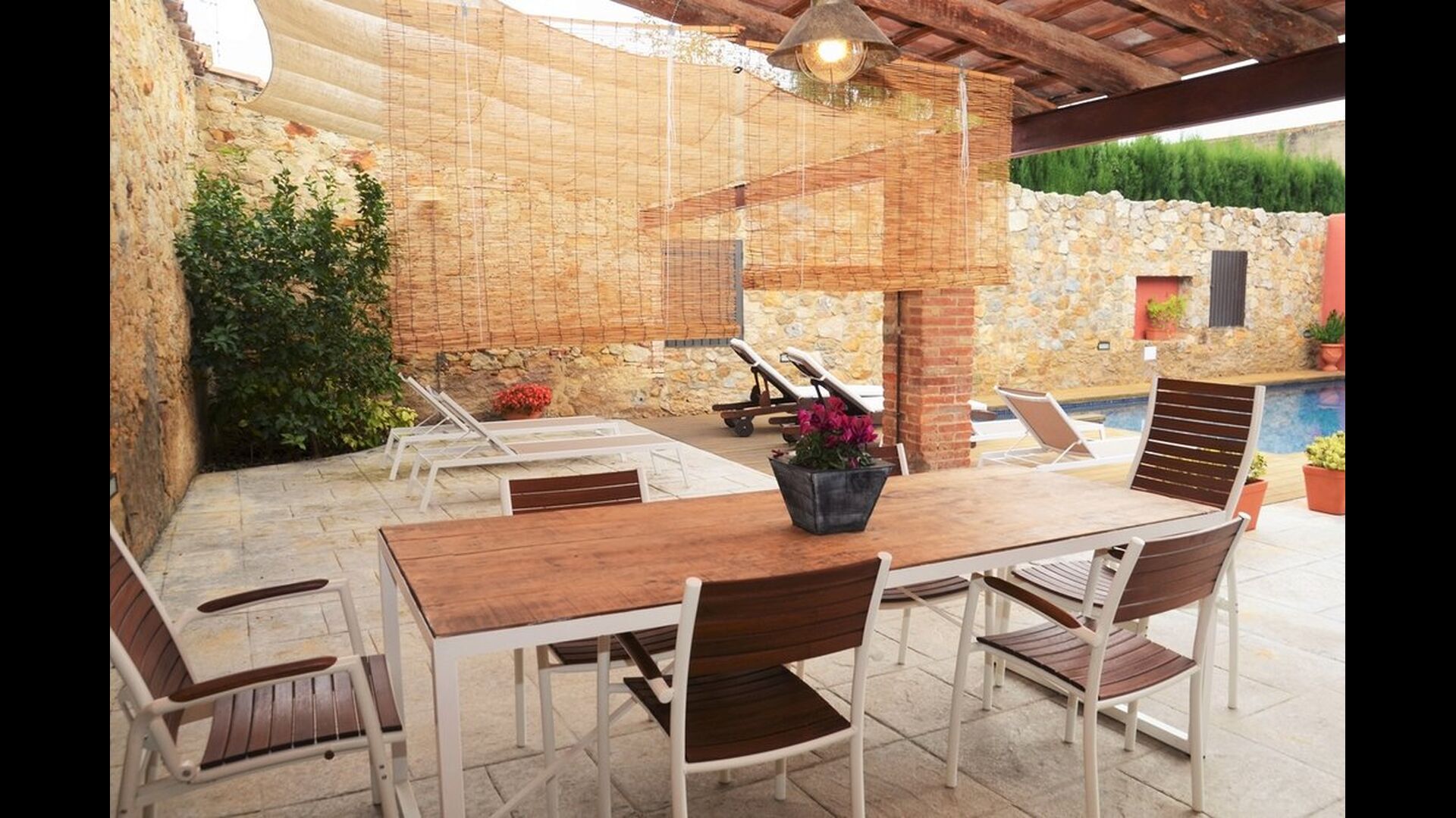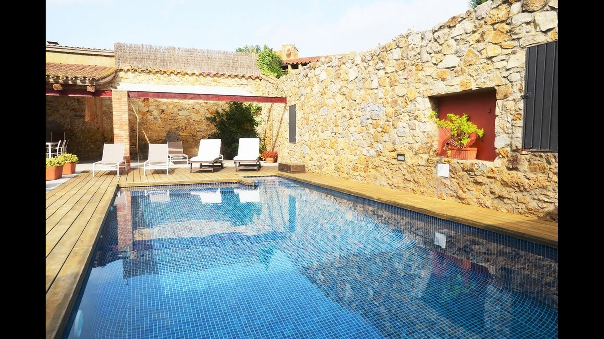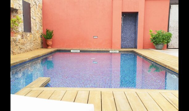 Normalt kan man ikke både have pool og bo i byen - dette er dog tilfældet i Samarit de Pals. Her får man en dejlig pool på 8x4 meter, med trapper og varierende dybder, så de mindre i feriegruppen også kan få fuld gavn af den. Poolområdet har diverse luksuriøsiteter, bl.a. liggestole, skyggeområder, bad, etc., så der er god mulighed for at finde sig til rette og slappe af ved poolen. Gården og poolen er delt med den anden lejlighed, men der er en privat terrasse med grill og spisebord som I har helt for jer selv.