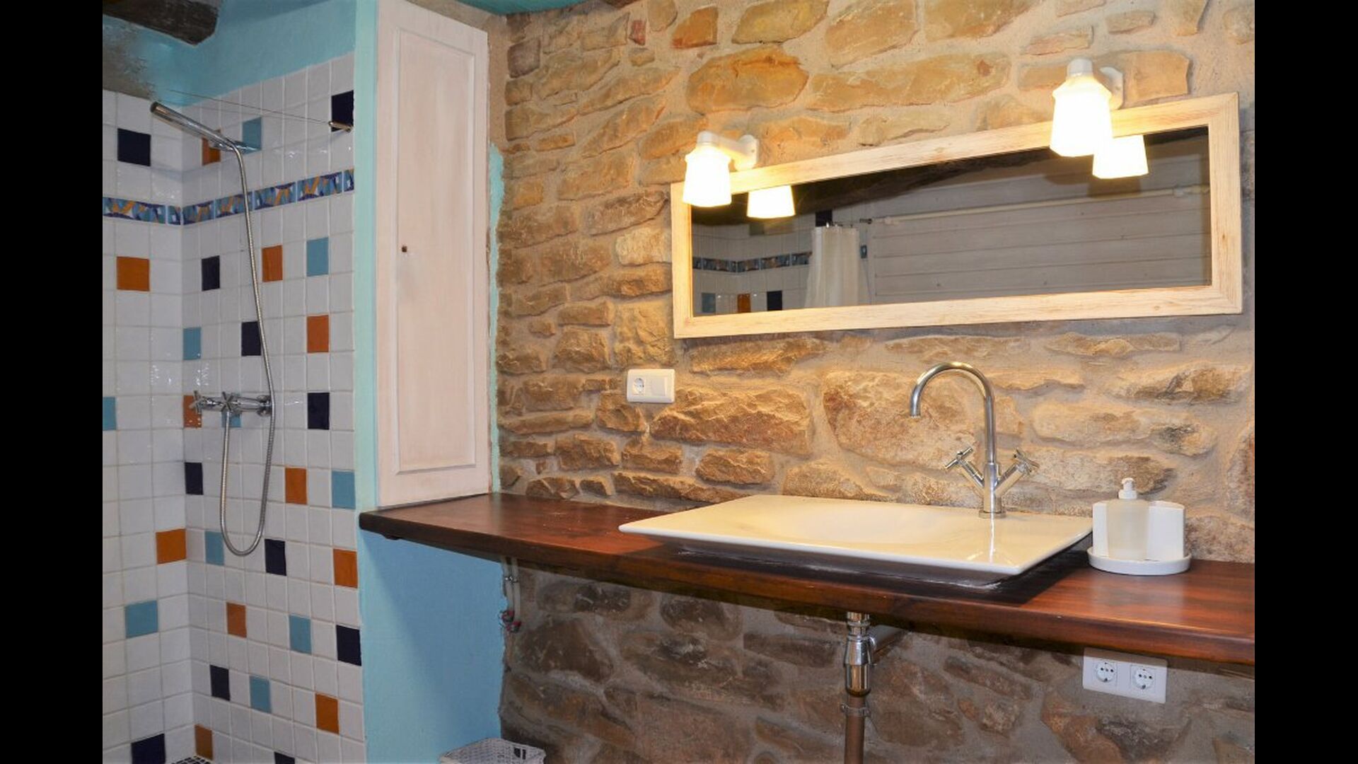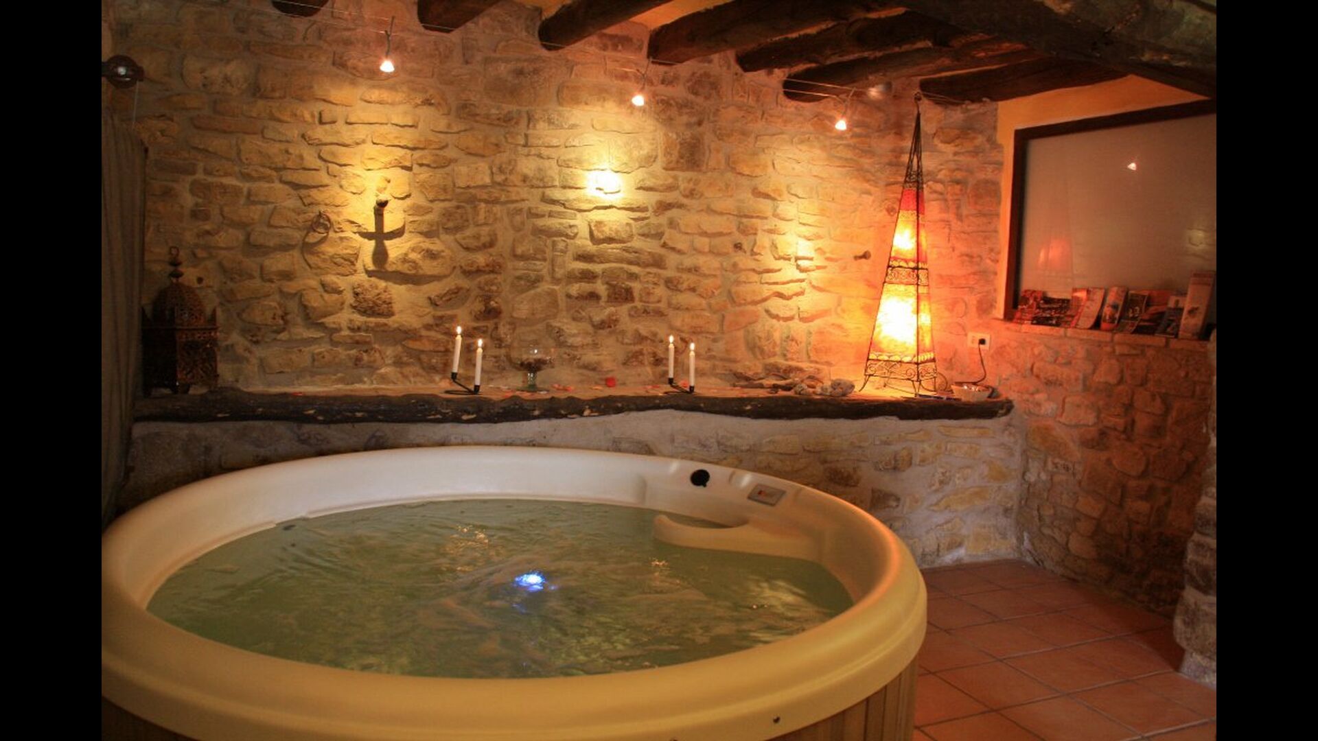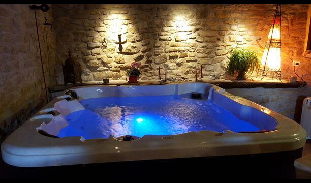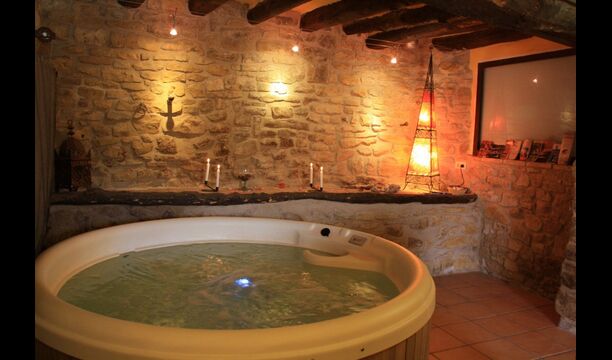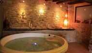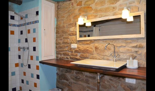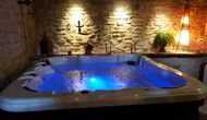 Nederst er der en lille ’separat’ lejlighed, der følger med, når man lejer feriehuset. Hertil er der indgang af en stor, flot dobbeltdør – eller direkte fra gaden. Her er der et dobbeltværelse med et tilhørende stort og meget smukt badeværelse, og ved siden af er der også et udstyret køkken. På samme niveau er der jacuzziområde med ekstra bad.