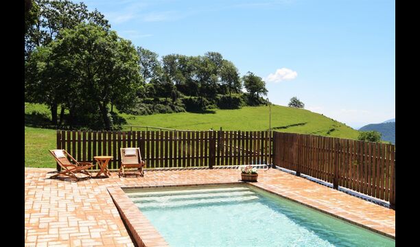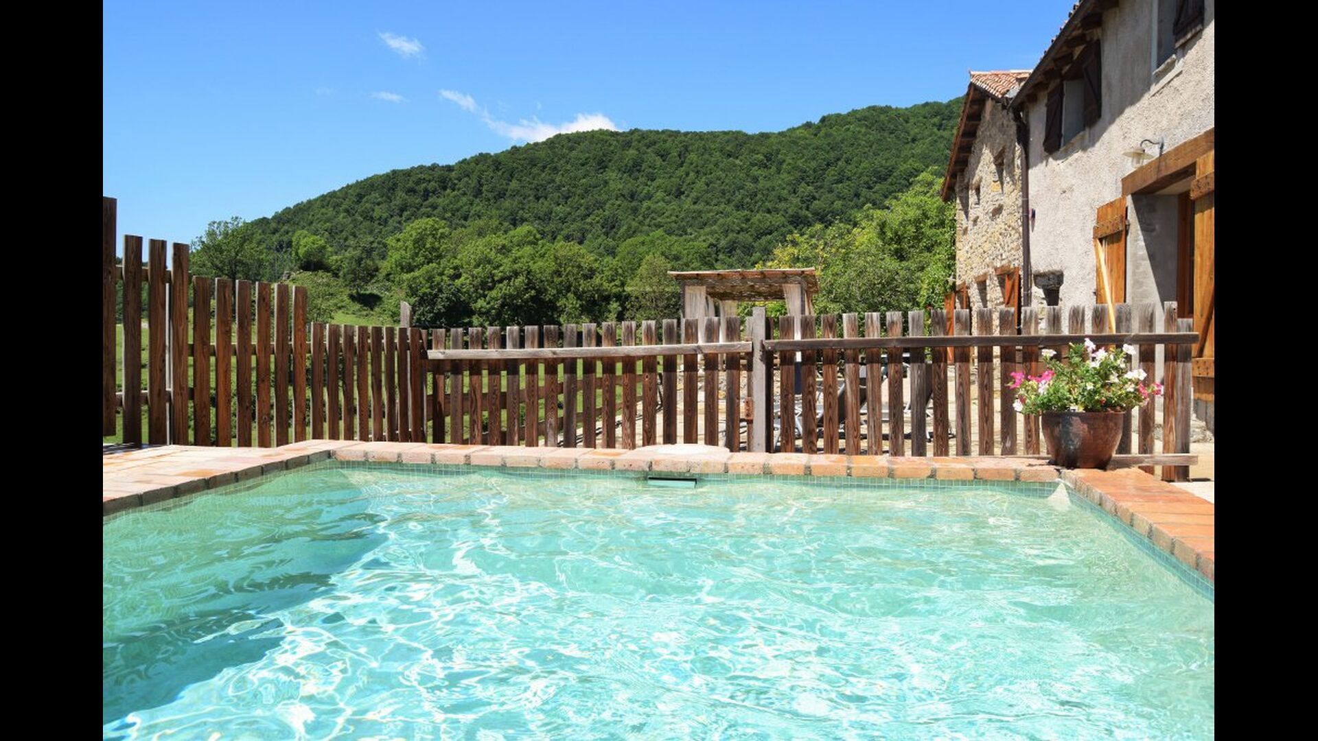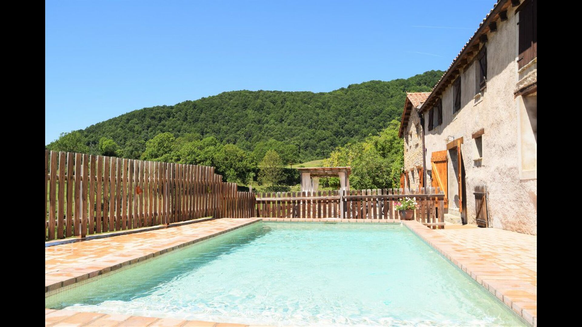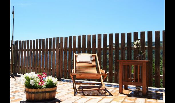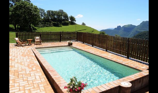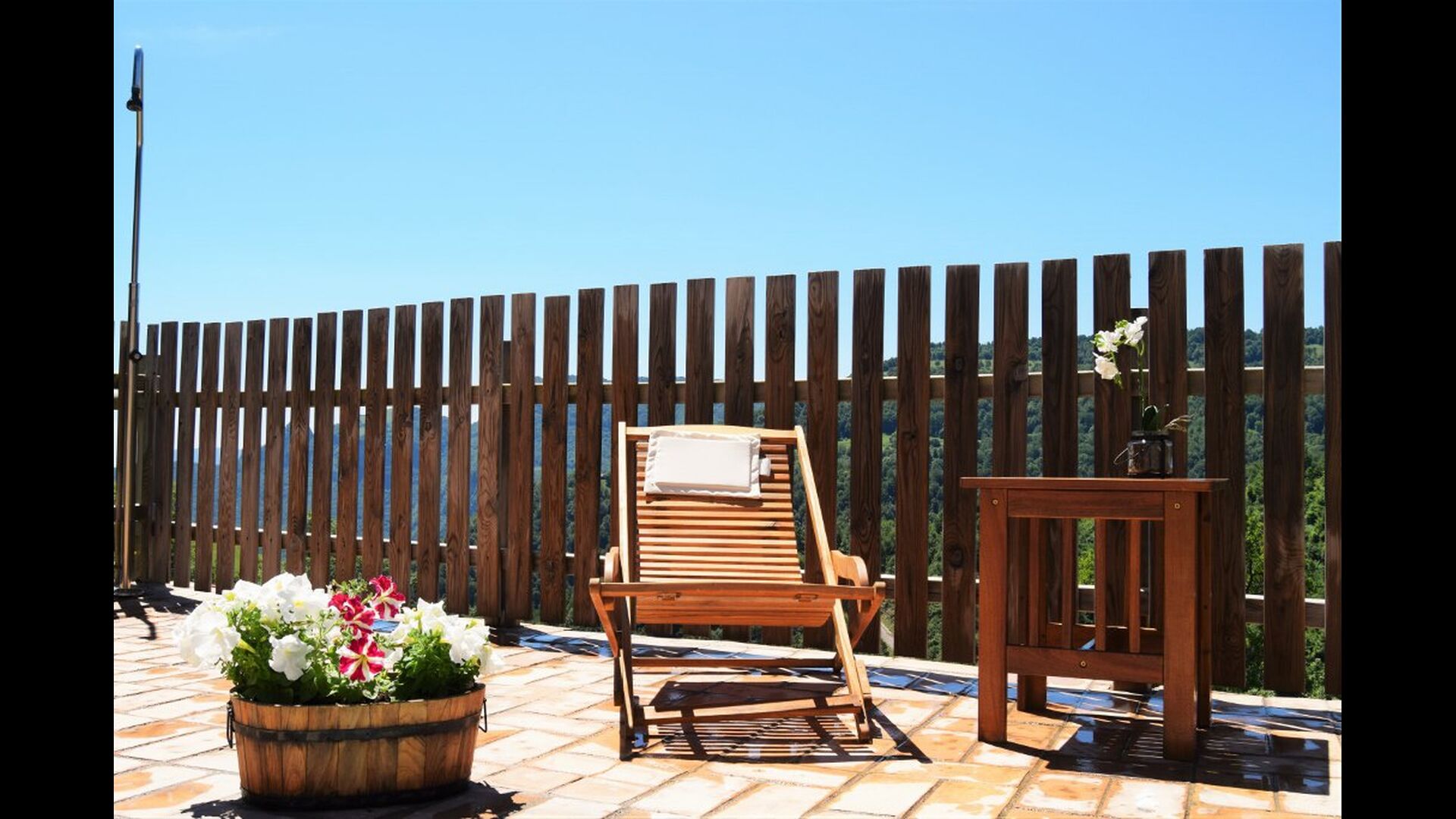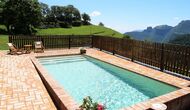 Feriehusets placering er som før nævnt helt unik. Man skal køre 20-25 minutter for at komme op til huset, hvilket betyder, at man bor helt alene i den flotte alpeagtige natur. De omkringliggende skråninger er beklædt med græs og træer, og da ferieboligen er placeret på toppen af en bakke, er der er en fantastisk udsigt ud over dalen. Denne udsigt kan nydes fra det store terrasseområde, hvor der er to overdækkede områder. Det ene er placeret med fantastisk udsigt over skråningen, mens den anden ligger inde i haven med spisebord og BBQ-grill. Der er også en swimmingpool, hvor der ligeledes er vidunderlig udsigt fra – denne kombinationen er ikke noget, alle feriehuse kan prale af! Swimmingpoolen er af sikkerhedsmæssige årsager indhegnet.
