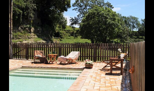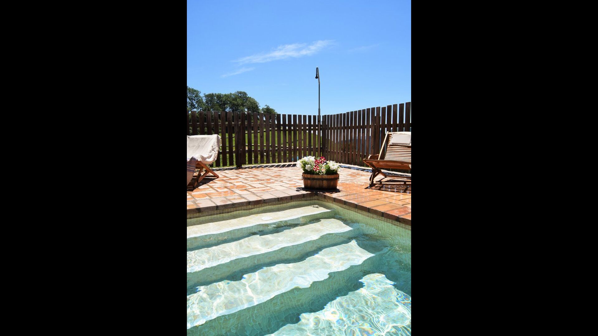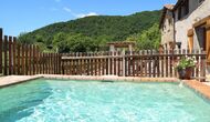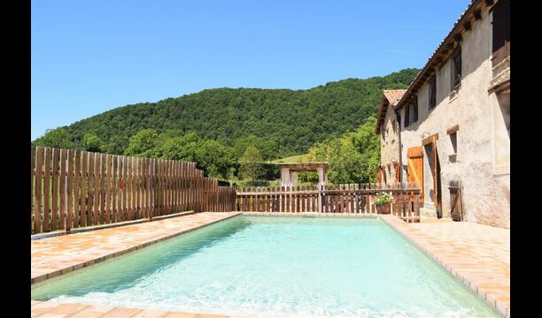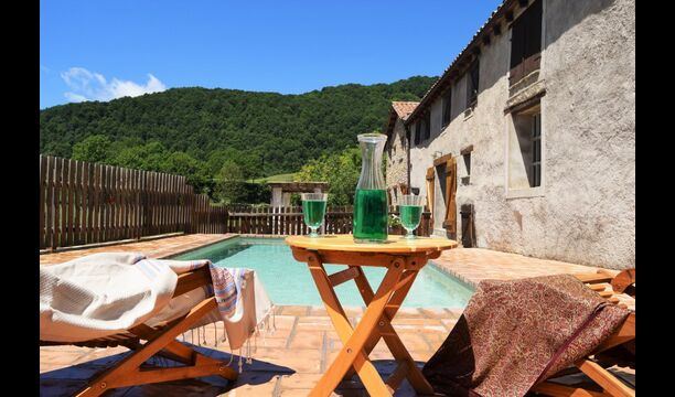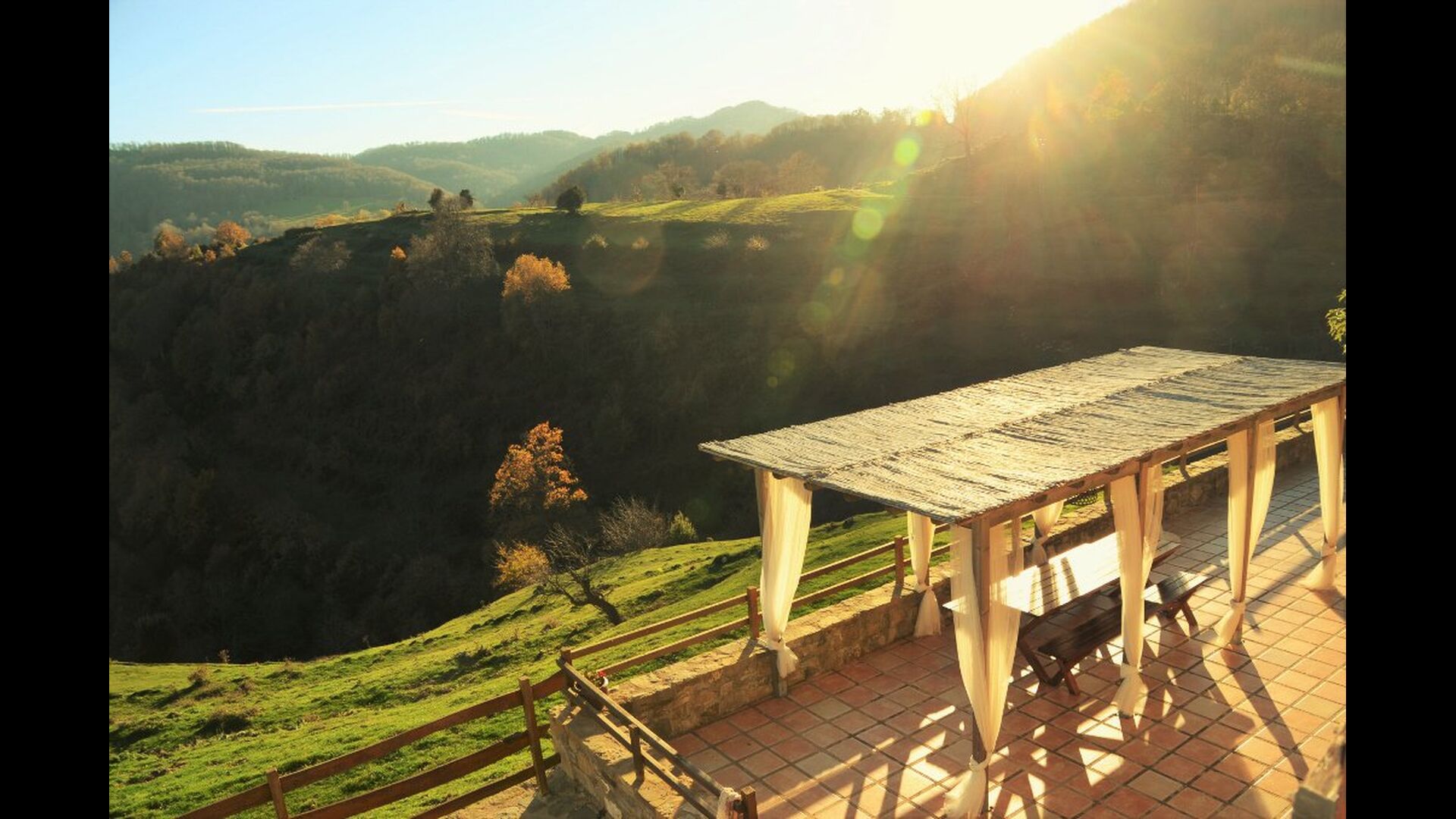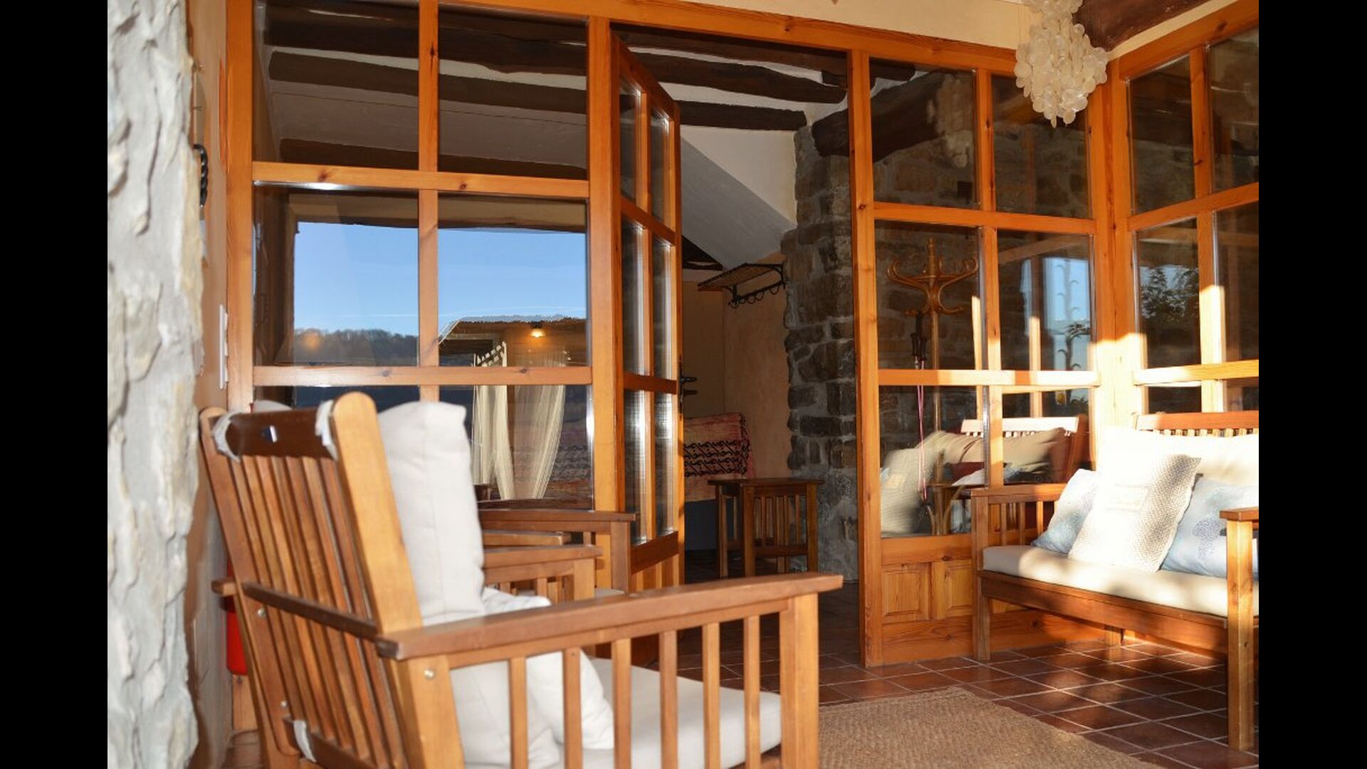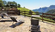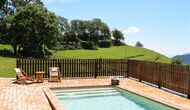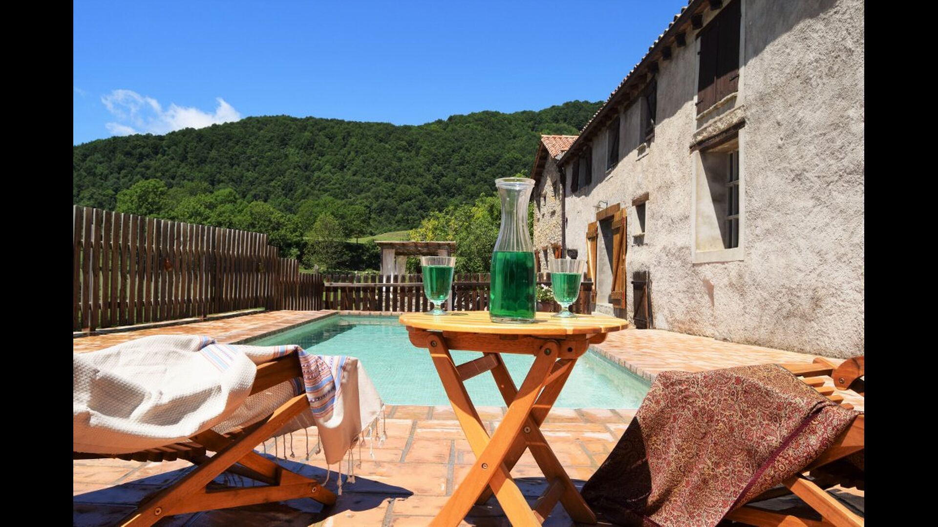 Feriehusets placering er som før nævnt helt unik. Man skal køre 20-25 minutter for at komme op til huset, hvilket betyder, at man bor helt alene i den flotte alpeagtige natur. De omkringliggende skråninger er beklædt med græs og træer, og da ferieboligen er placeret på toppen af en bakke, er der er en fantastisk udsigt ud over dalen. Denne udsigt kan nydes fra det store terrasseområde, hvor der er to overdækkede områder. Det ene er placeret med fantastisk udsigt over skråningen, mens den anden ligger inde i haven med spisebord og BBQ-grill. Der er også en swimmingpool, hvor der ligeledes er vidunderlig udsigt fra – denne kombinationen er ikke noget, alle feriehuse kan prale af! Swimmingpoolen er af sikkerhedsmæssige årsager indhegnet.