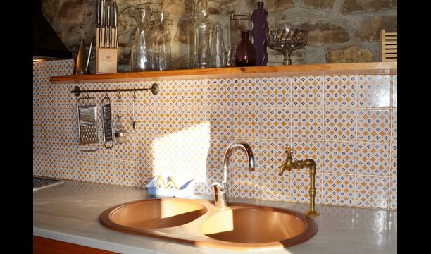 Feriehusets stueetage består af køkken, spisestue og sofaområde. Køkkenet er dejligt veludstyret med alle de nødvendige faciliteter og redskaber. Derudover er der direkte udgang til et udendørs og overdækket spiseområde, så det er nemt at tilberede maden og derefter nyde den udenfor med den fantastiske udsigt og aftensolen i baggrunden. Det er et åbent køkken med en ø, hvor der i samme rum er siddefaciliteter. Sofaområdet er lavet rundt om en stor, hyggelig pejs, og ved siden af er der en spisestue, hvis man vil nyde måltiderne indendørs. I stueetagen er der ligeledes et toilet og vaskemaskine.