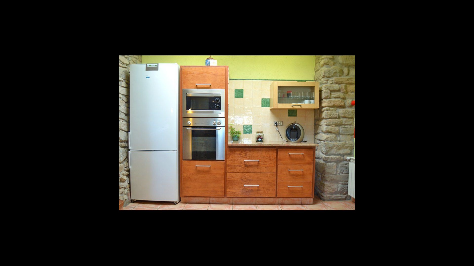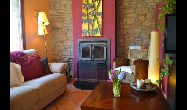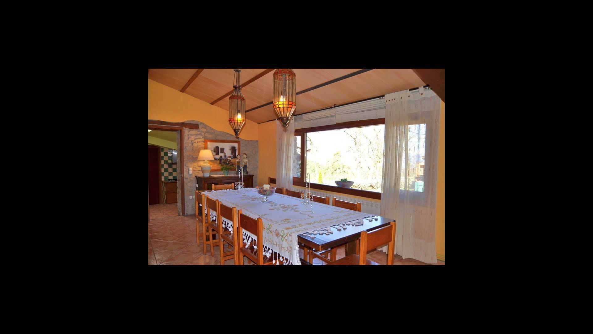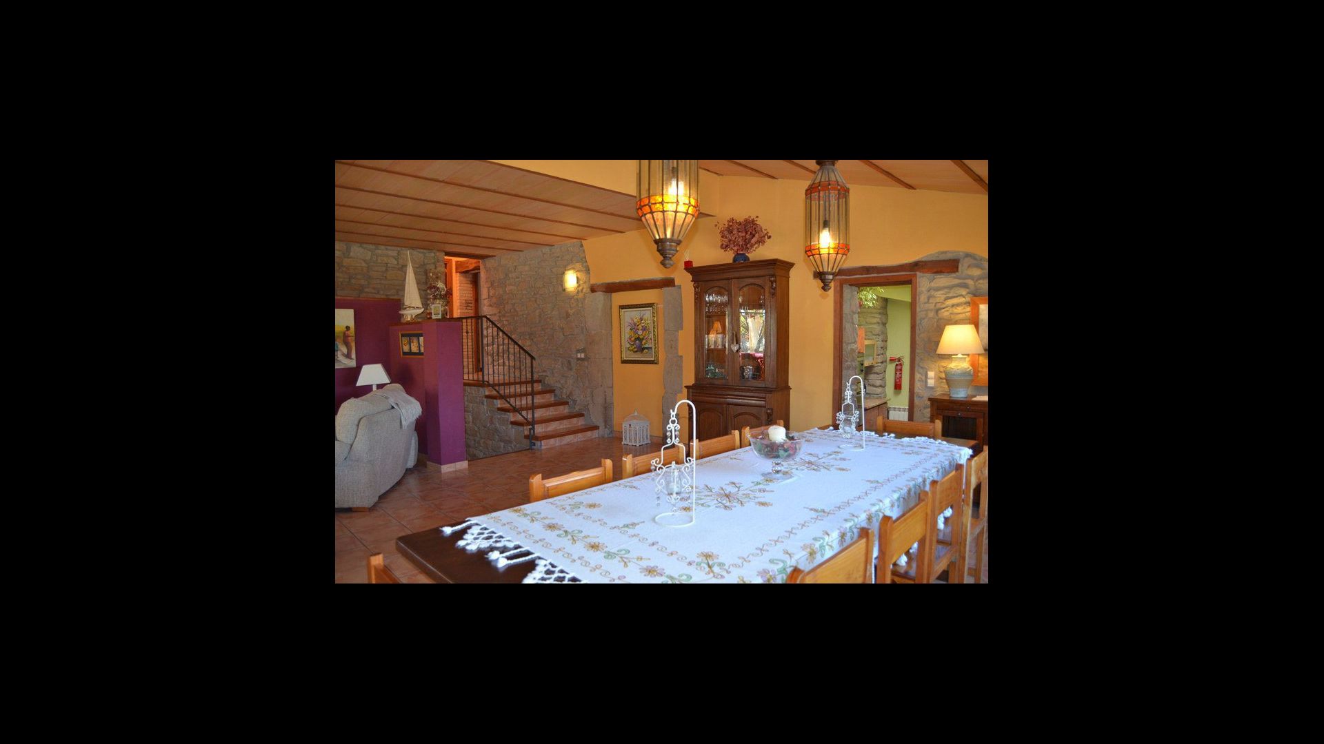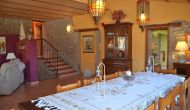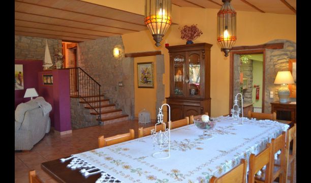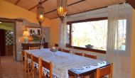 Den flotte stue med sofaer og pejs ligger i forlængelse af husets spisestue, der er indrettet med det gode traditionelle, spanske langbord. Husets køkken er stort og har rigtig god plads til den store ferie gruppe. I køkkenet er der alle moderne bekvemmeligheder. Der er bl.a. køl, frys, god stor ovn, mikroovn, opvaskemaskine, expressomaskine og gasplader. I huset er desuden hurtigt WI-FI, DVD og musikanlæg.