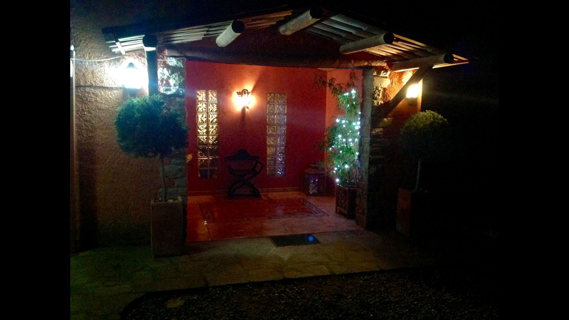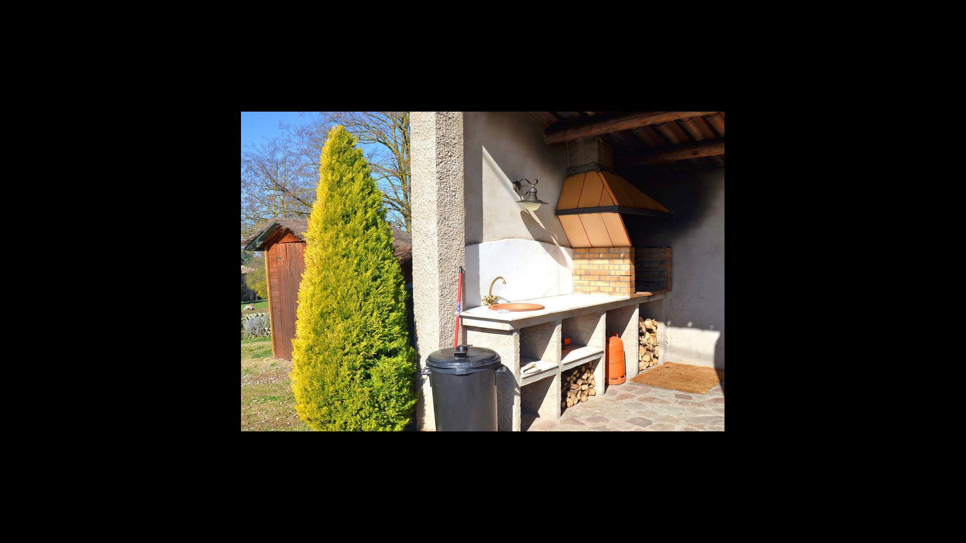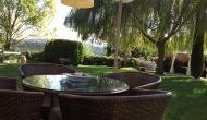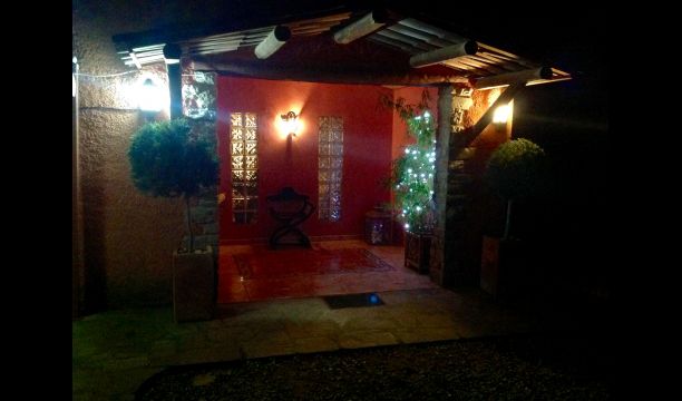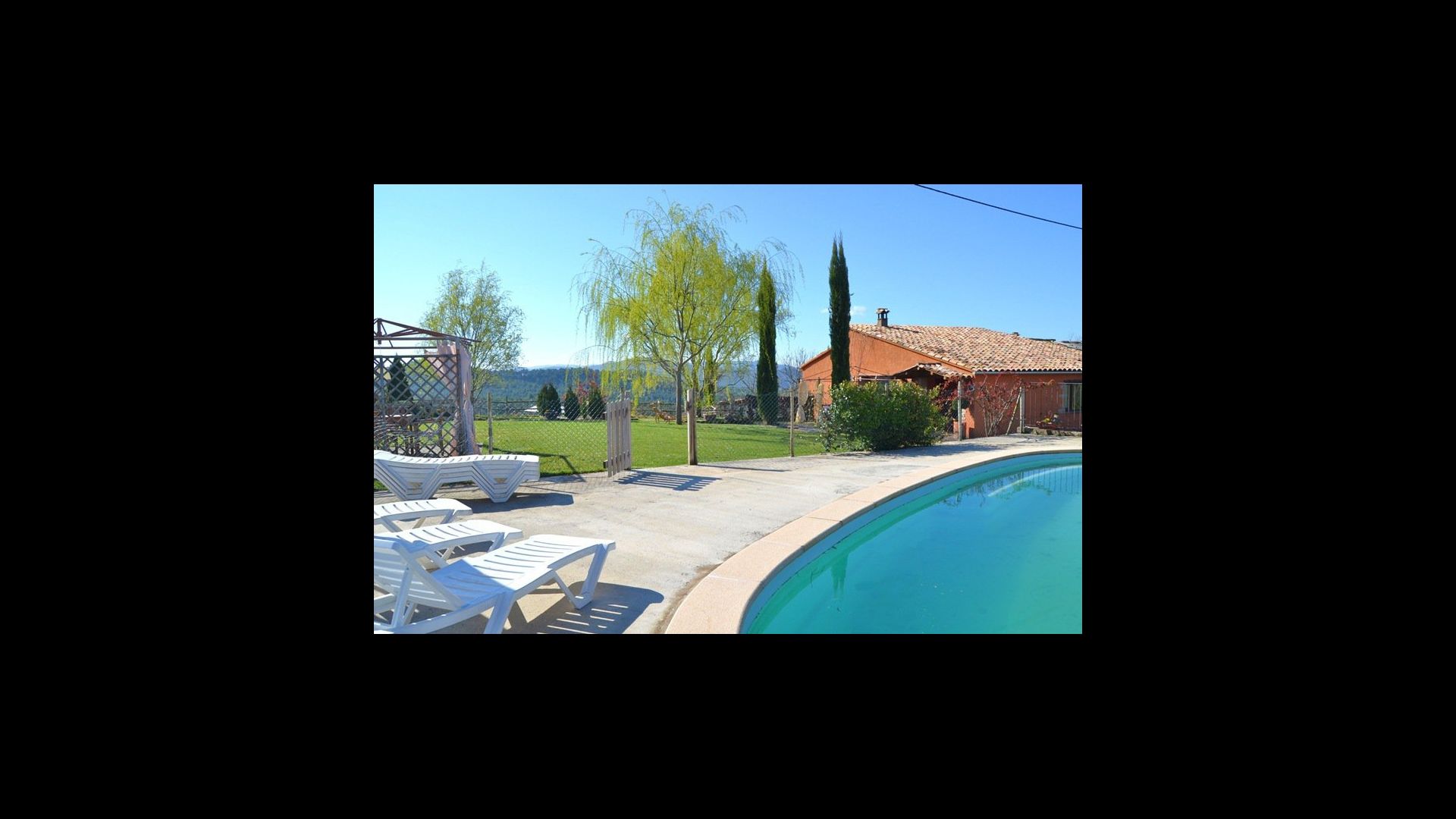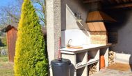 I haven er der privat indhegnet, privat swimmingpool (hvert af de to huse har egen pool) og i forlængelse af swimmingpoolen er en overdækket terrasse med BBQ og udekøkken. Der er desuden en lille terrasse foran huset og på plænen er desuden opsat en lille pavillon, hvor I også kan søge skygge på de varme sommerdage.