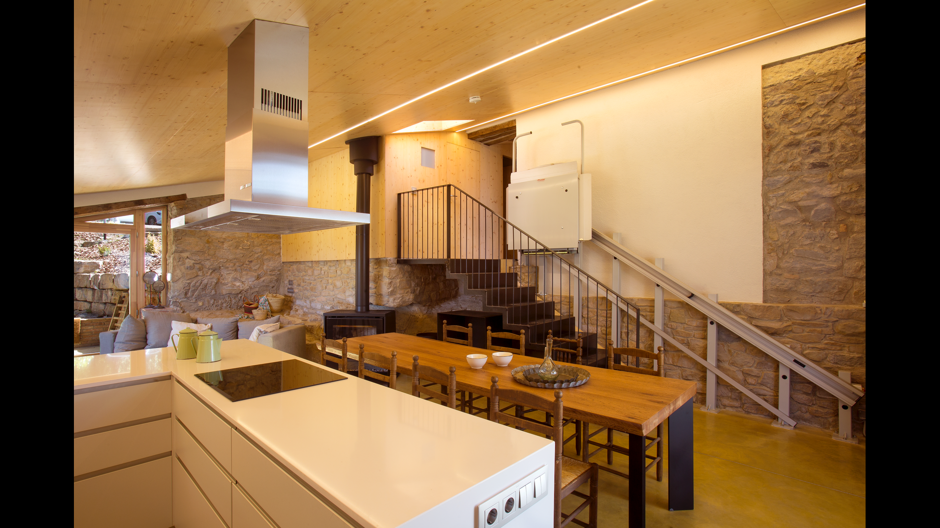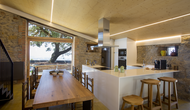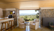 Inde i huset finder du det store, åbne køkken og spiseplads. Panoramavinduerne giver rummet et smukt, naturligt lys, men giver dig også endnu et sted at nyde den spektakulære udsigt. Køkkenet er fuldt udstyret og har også basisprodukter såsom skrubbe og sæbe, klude og køkkenpapir, olie, eddike, salt, sukker og kaffe. Du finder også fire flotte og velindrettede dobbeltværelser, som hver har private badeværelser.