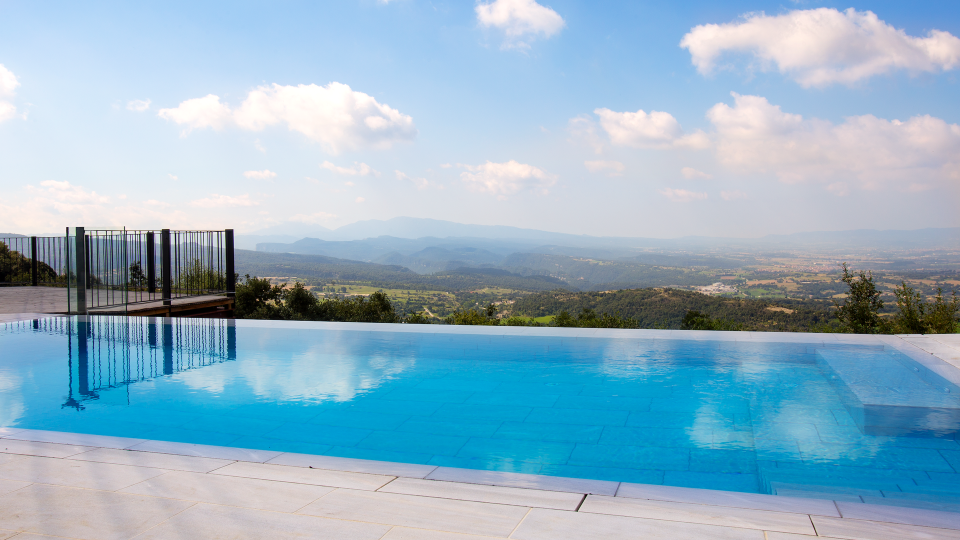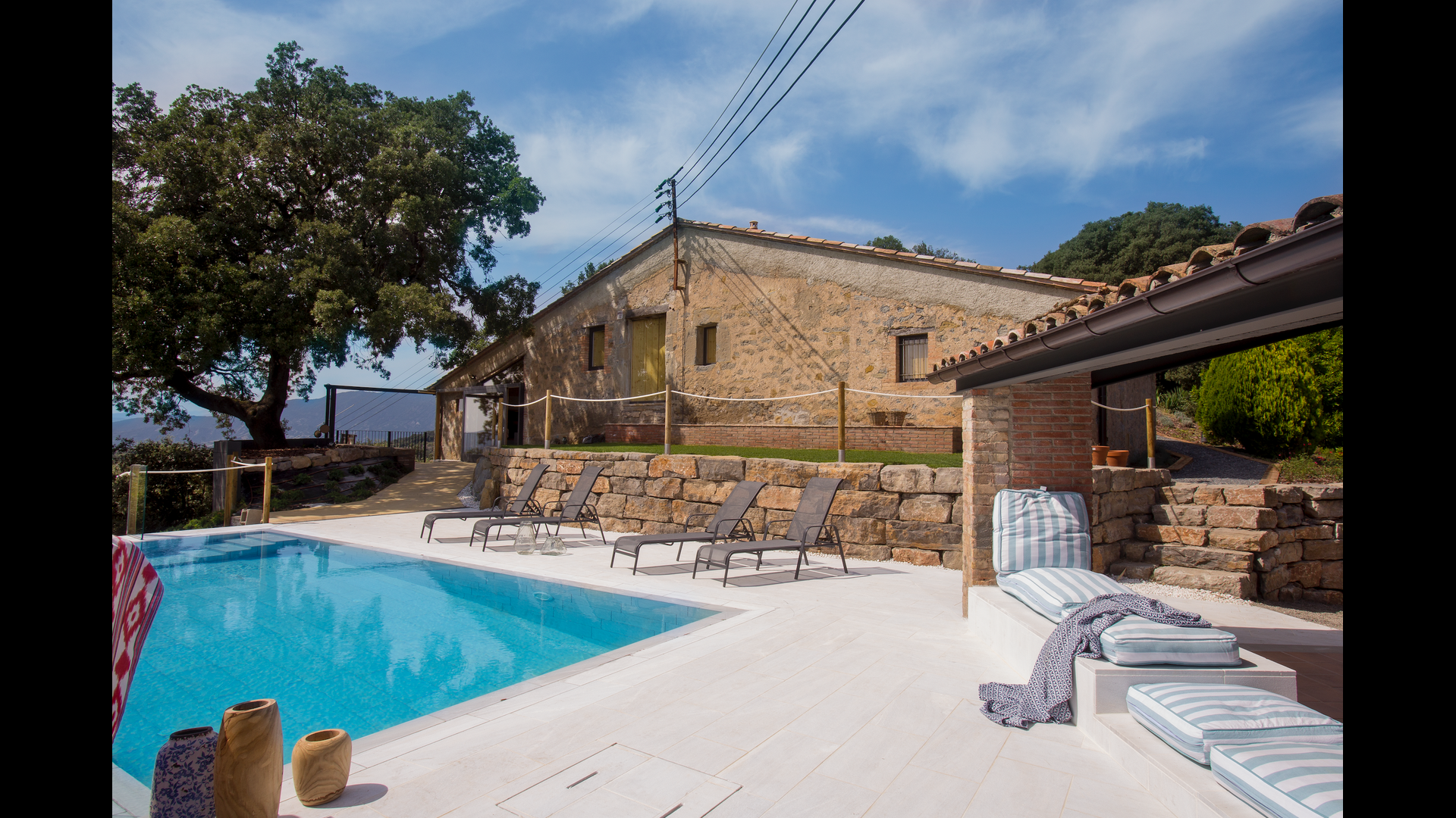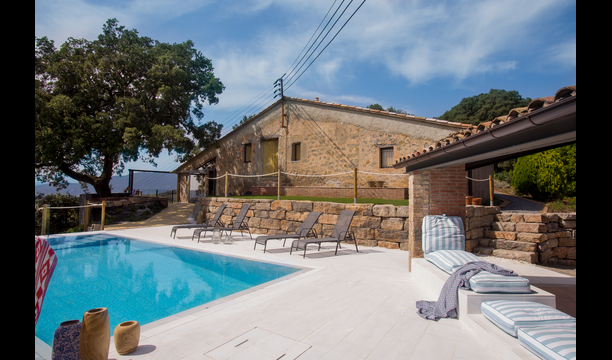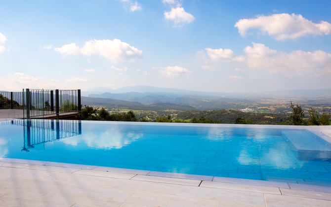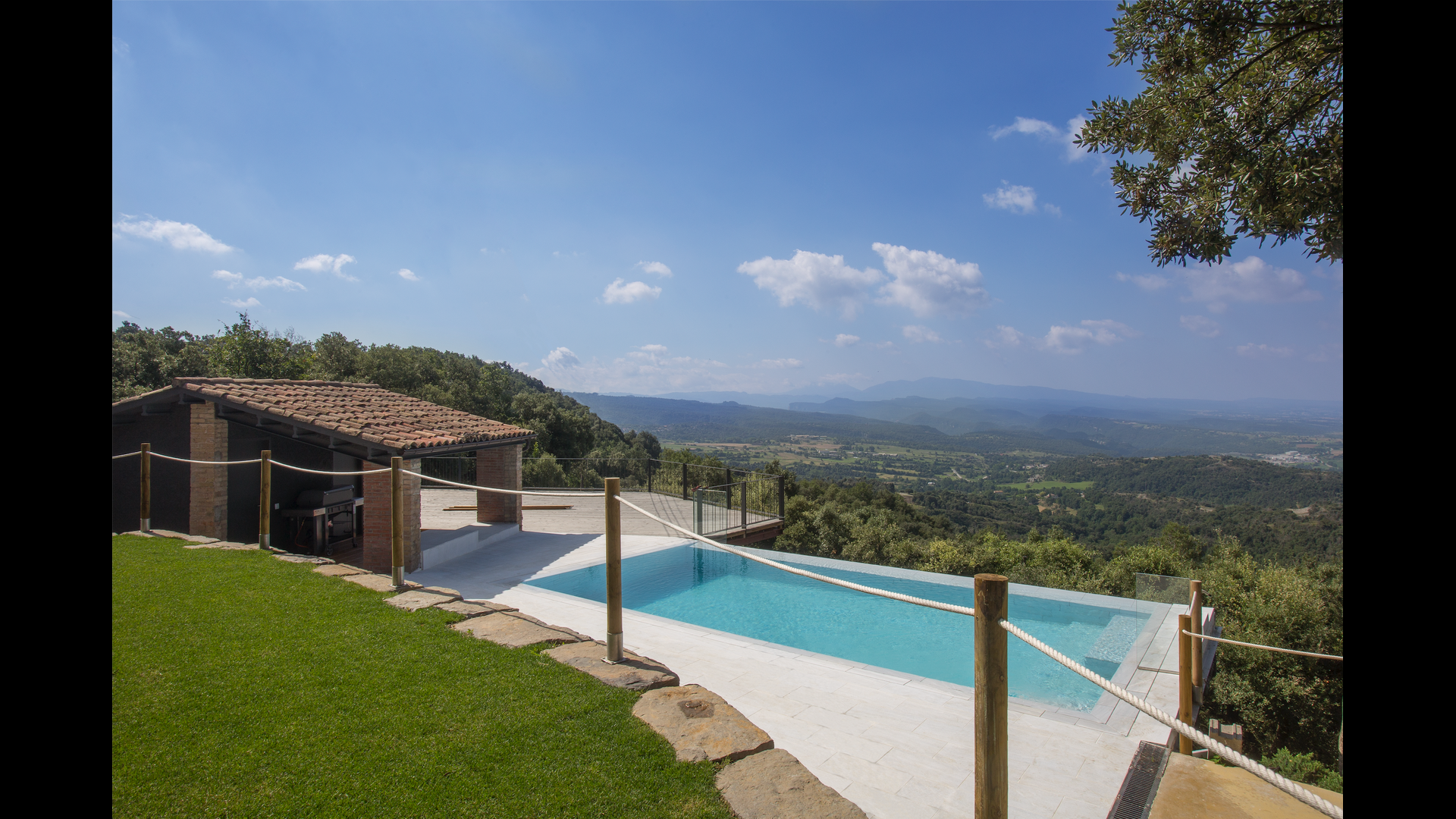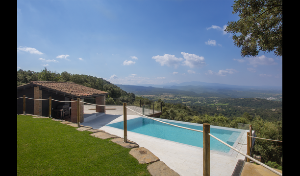 Den fantastiske swimmingpool er placeret foran huset og har den samme storslåede udsigt som resten af huset. Vi forestiller os, at du sandsynligvis vil tilbringe det meste af din ferie lige her, hvor børnene kan lege og svømme dagen lang. Men det er også det perfekte sted til at læse bøger og nyde de catalanske solstråler. Til venstre for poolen ligger et BBQ område og den store terrasse, hvor du kan nyde dagens måltider, med udsigt over det grønne landskab.