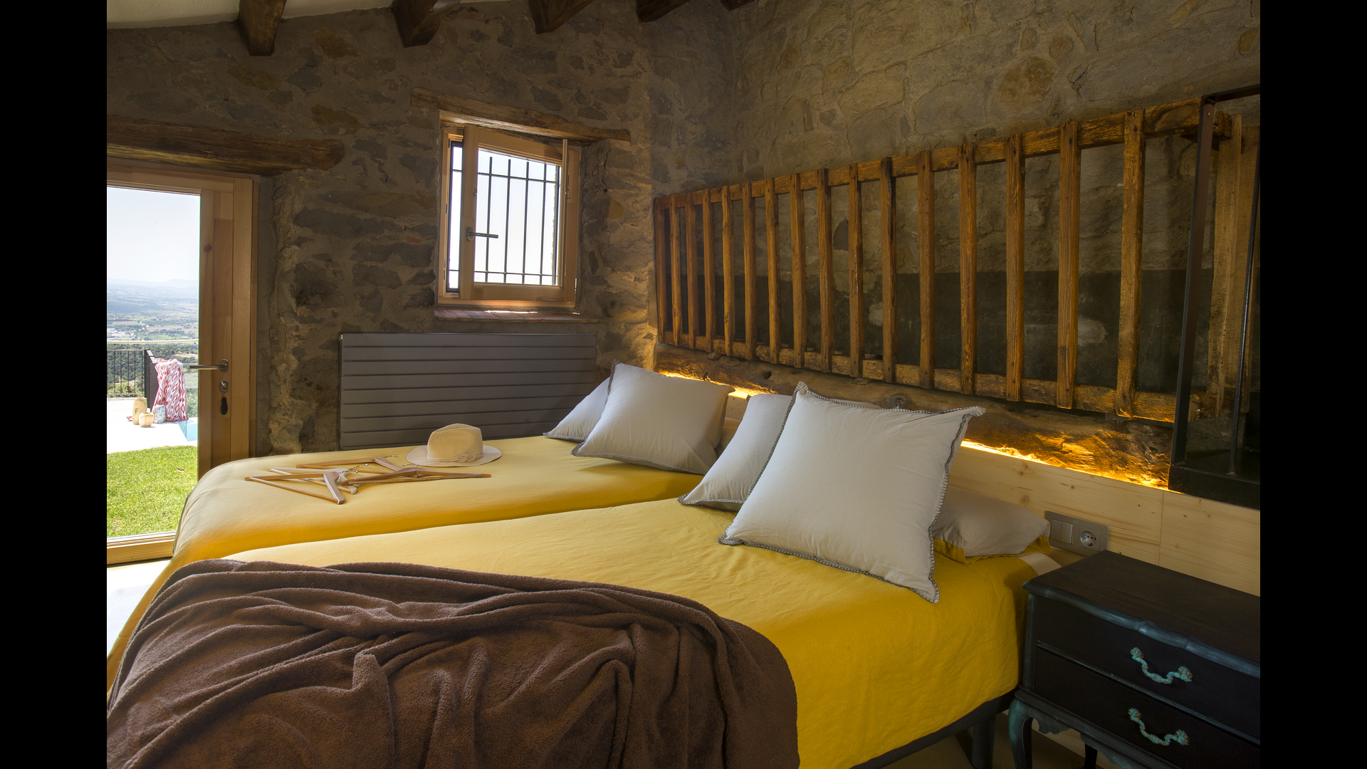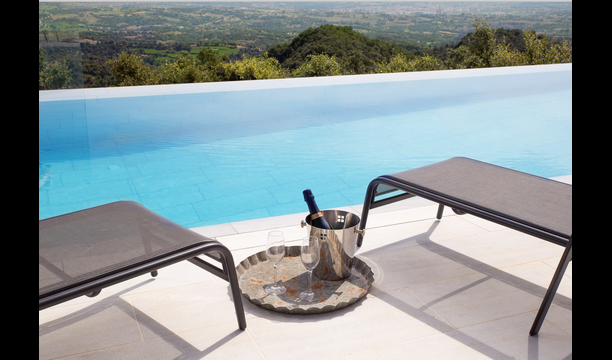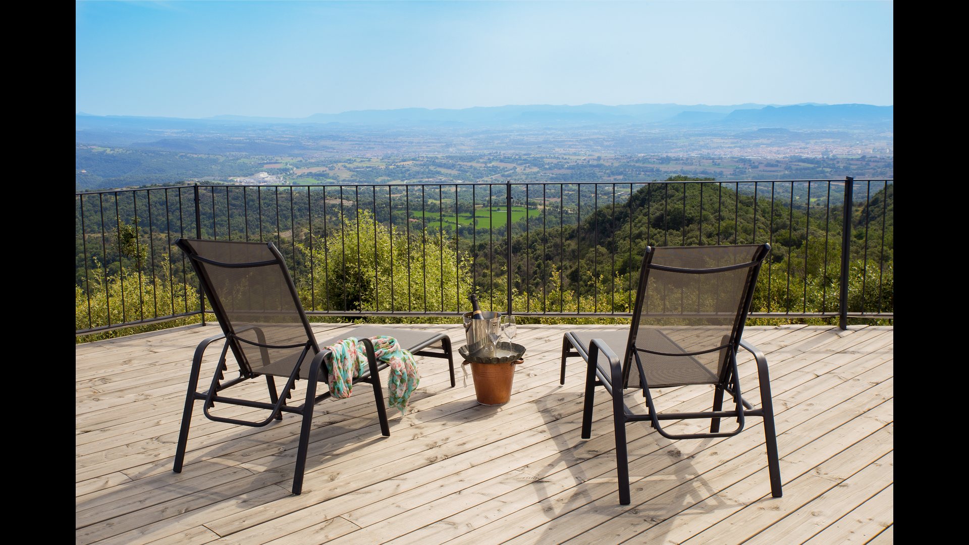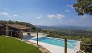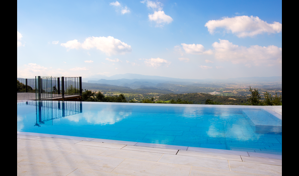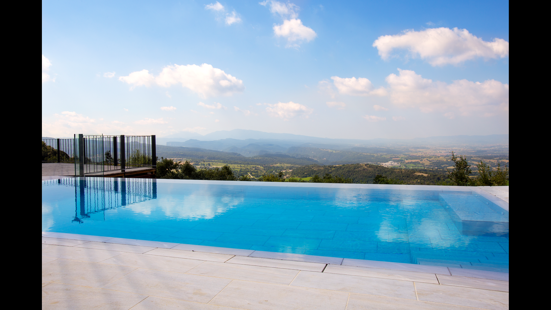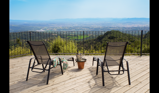 Den fantastiske swimmingpool er placeret foran huset og har den samme storslåede udsigt som resten af huset. Vi forestiller os, at du sandsynligvis vil tilbringe det meste af din ferie lige her, hvor børnene kan lege og svømme dagen lang. Men det er også det perfekte sted til at læse bøger og nyde de catalanske solstråler. Til venstre for poolen ligger et BBQ område og den store terrasse, hvor du kan nyde dagens måltider, med udsigt over det grønne landskab.