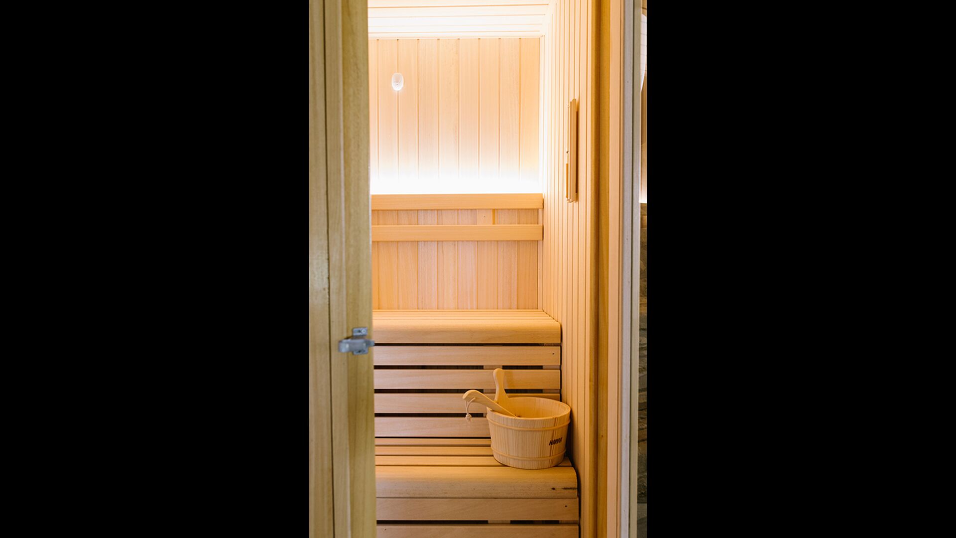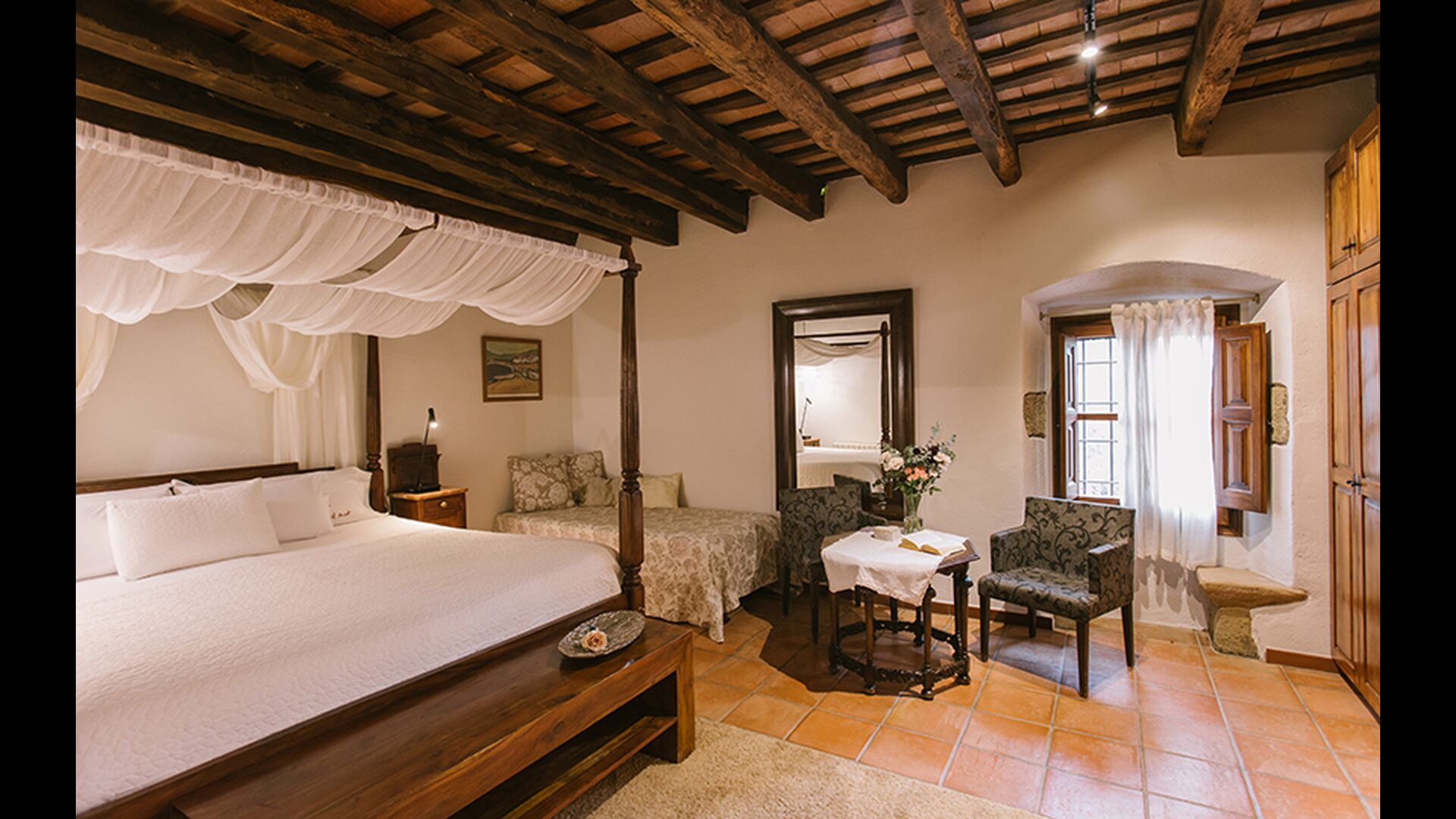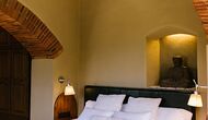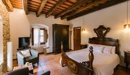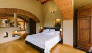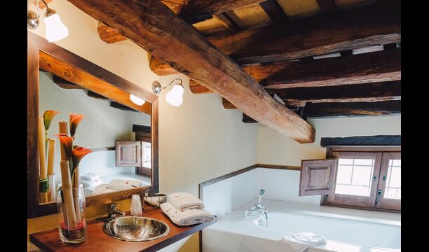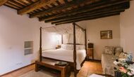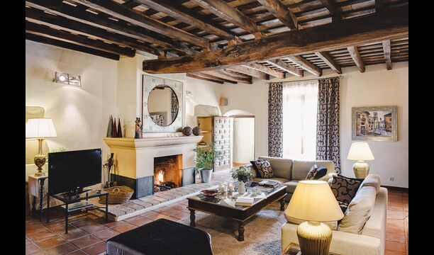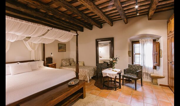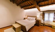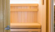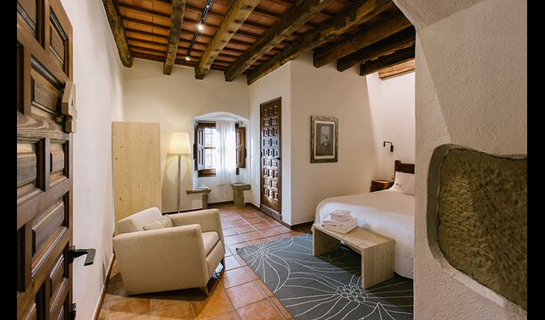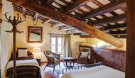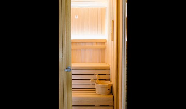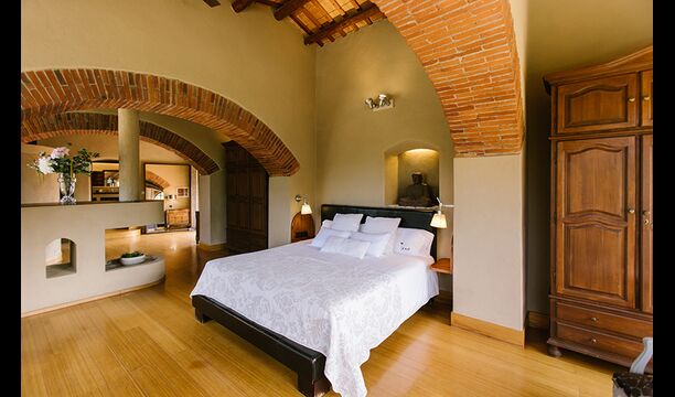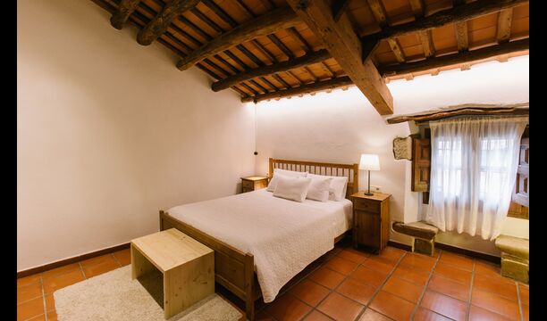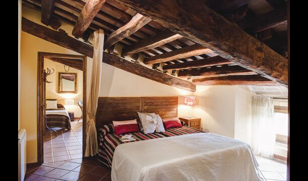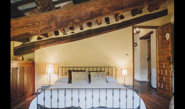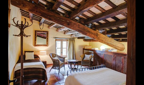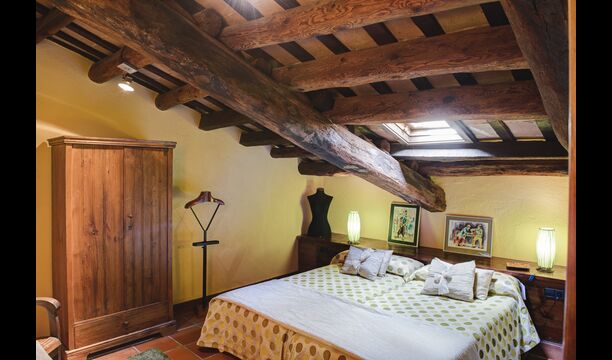På første sal er der endnu et stort loungeområde med åbent ildsted, tv, dvd og musikanlæg. Der er fire dobbeltværelser, heraf 3 med dobbeltsenge og 1 med enkeltsenge, samt 65m2 luksus suite med åbent ildsted, tv og badeværelse med spa. Fra suiten er der en privat vindeltrappe ned til det indendørs pool-område.