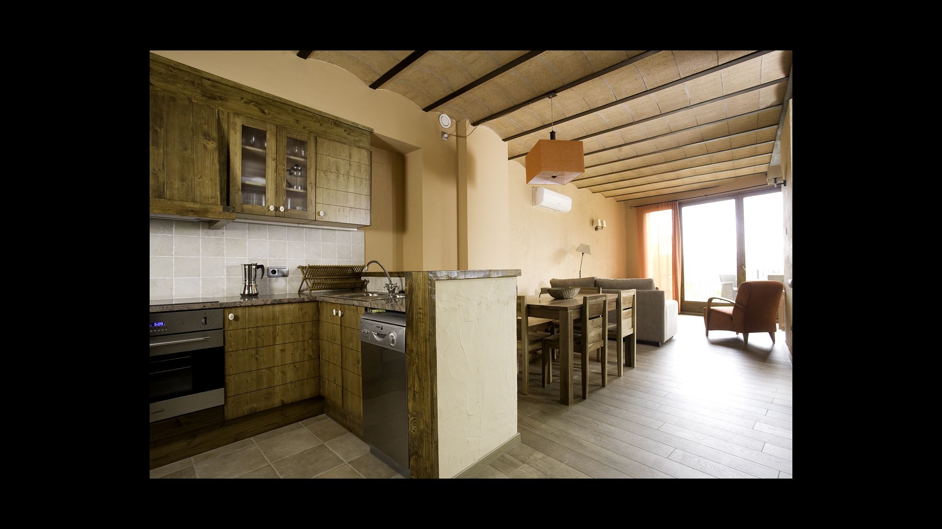 Du kommer ind i det store fællesrum, hvor du finder køkken, spiseplads, sofahjørne og udgang til terrasse, alt integreret. Køkkenet er veludstyret og har køleskab og fryser, keramiske kogeplader, ovn, mikroovn, opvaskemaskine med mere.