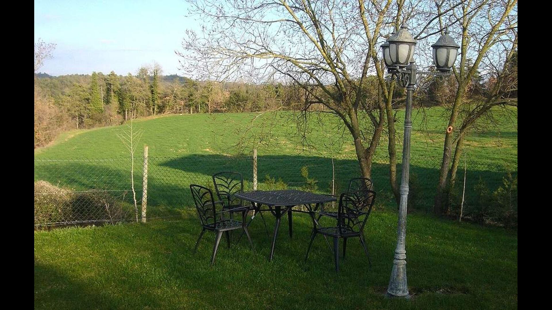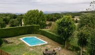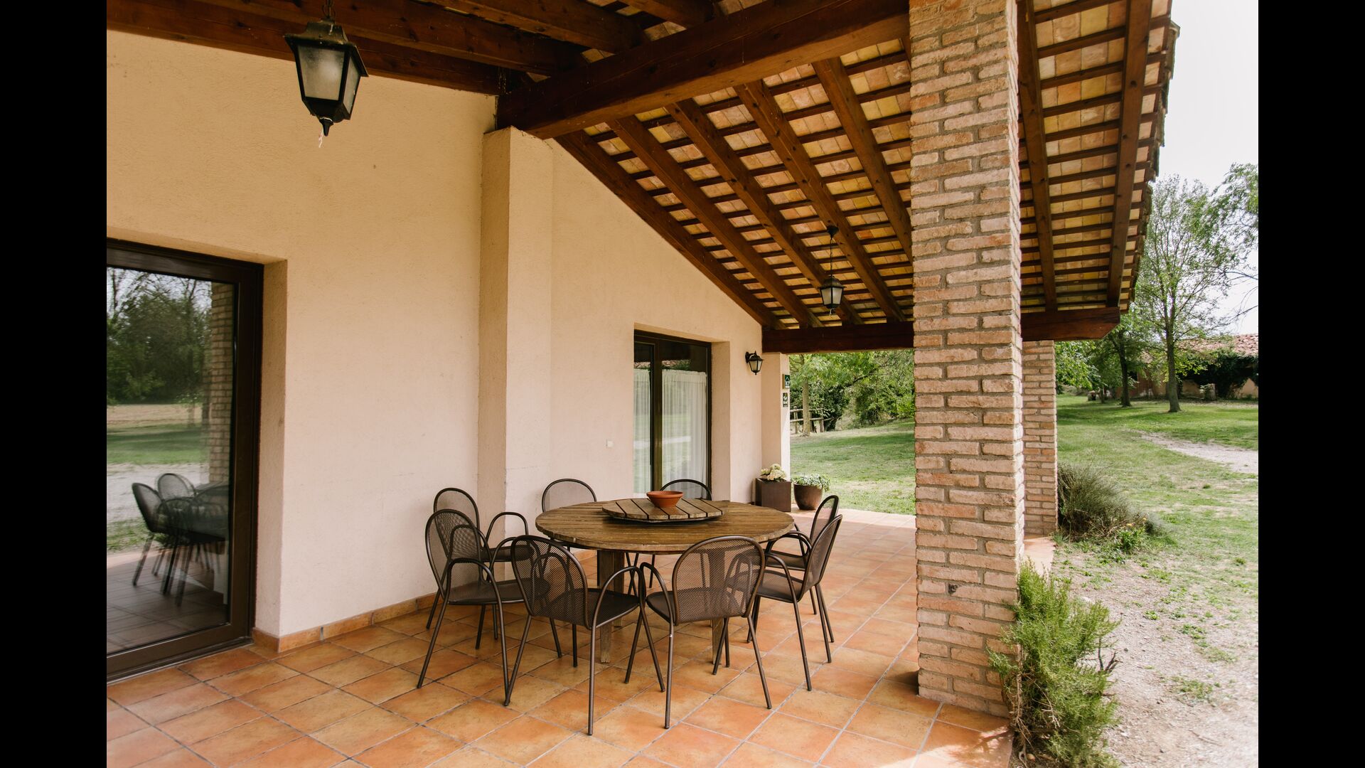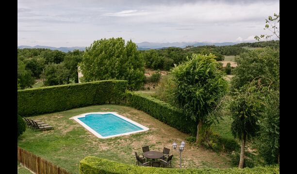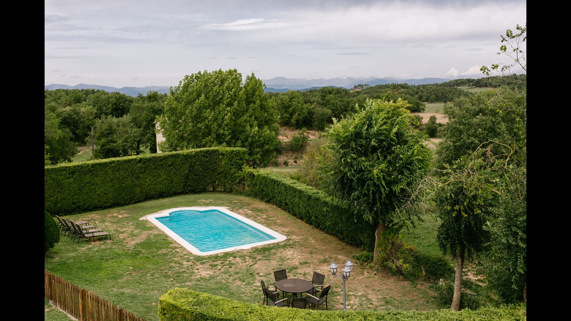 Nedenfor huset er der en indhegnet have med swimmingpool og udsigt ned over markerne og med Pyrenæerne i horisonten. Huset ligger omgivet af naturen og med lang distance til nærmeste nabo. Have og pool-område deles som udgangspunkt med den anden feriebolig.