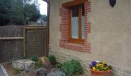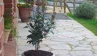 Indgangspartiet til ferieboligen Casa Pratse. Hver af de to boliger har egne havemøbler