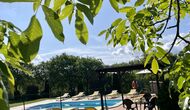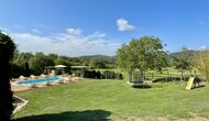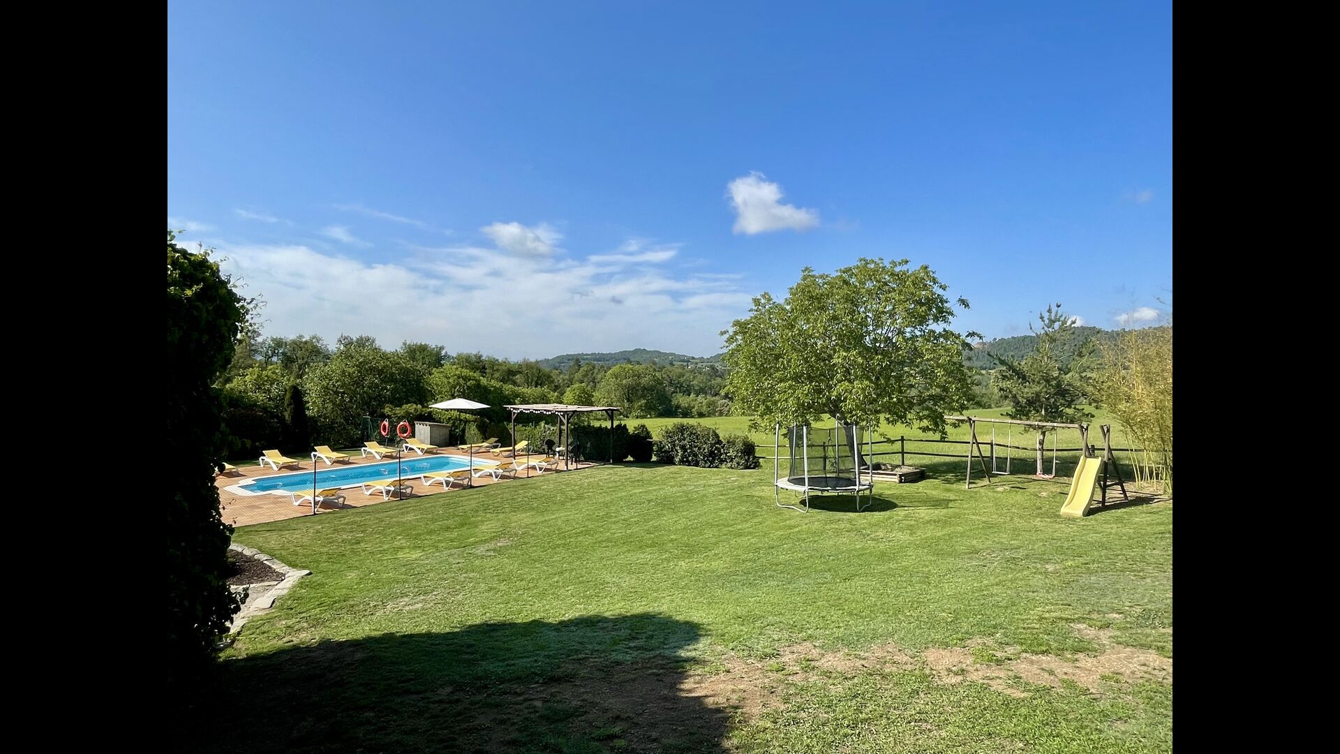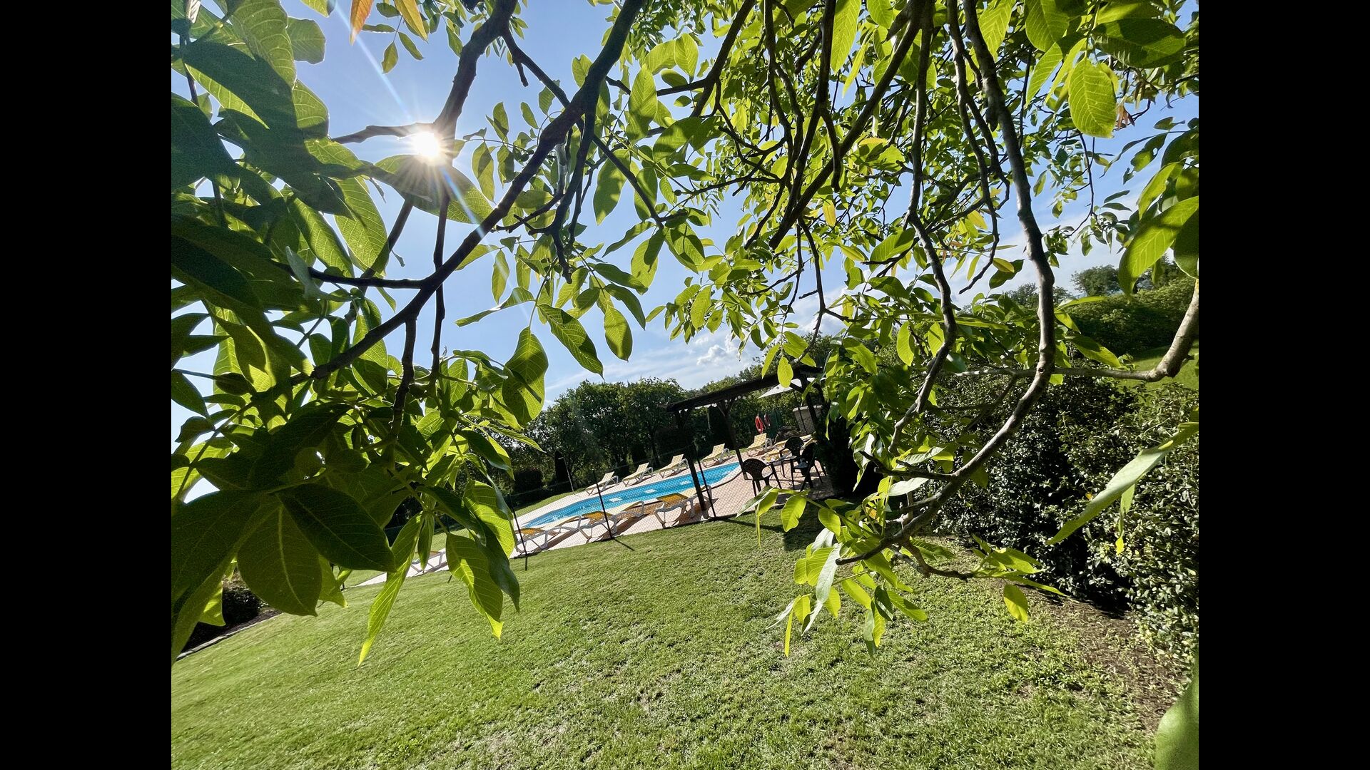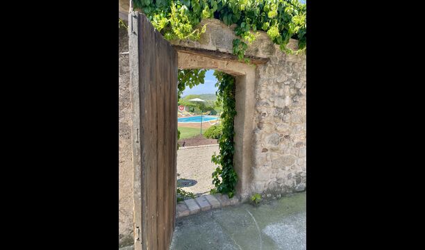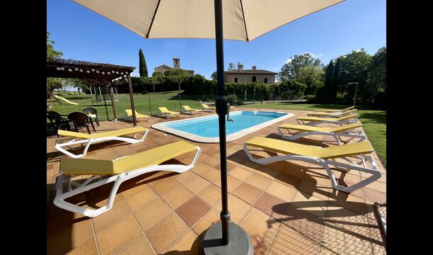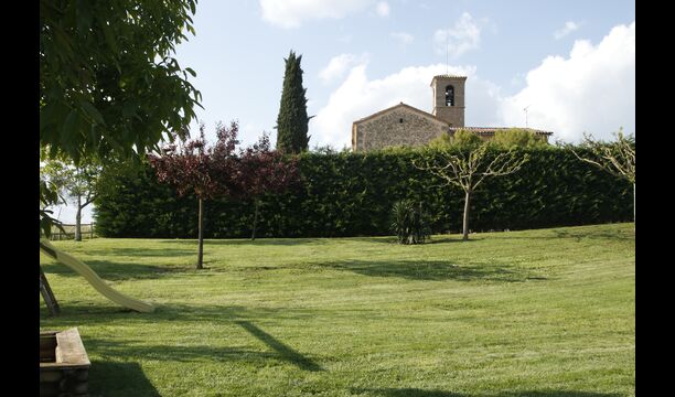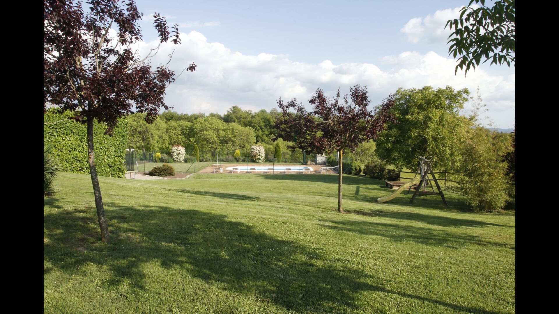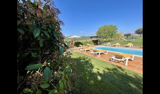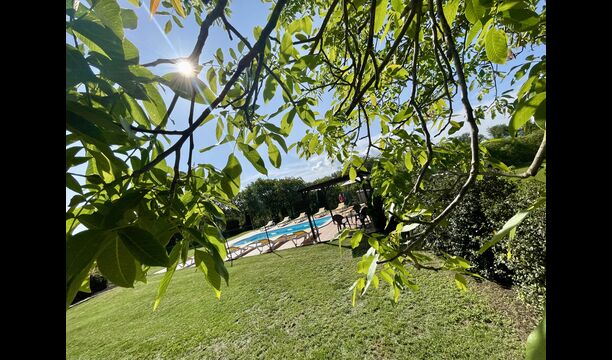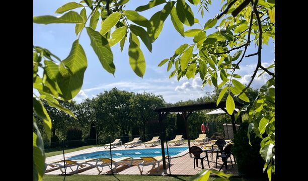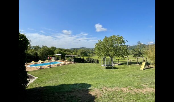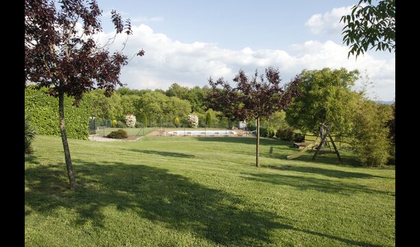 Den imponerende port, der i gamle dage var stor nok til, at hestevognene kunne komme ind, giver adgang til det smukke have- og poolområde. I den ene ende, græsplænen med nogle træer, der giver skygge. Desuden er der en sandkasse og gynger til de yngste, og nogle borde til lette måltider. I den anden ende, swimmingpoolen med romerske trin, det er faktisk meget rart, når man har små børn i sin gruppe. Med en kold drink og en bog og med den smukke udsigt over det bakkede landskab med marker og skov, får roen og lydene de sidste rester af den stressede hverdag til at forsvinde.