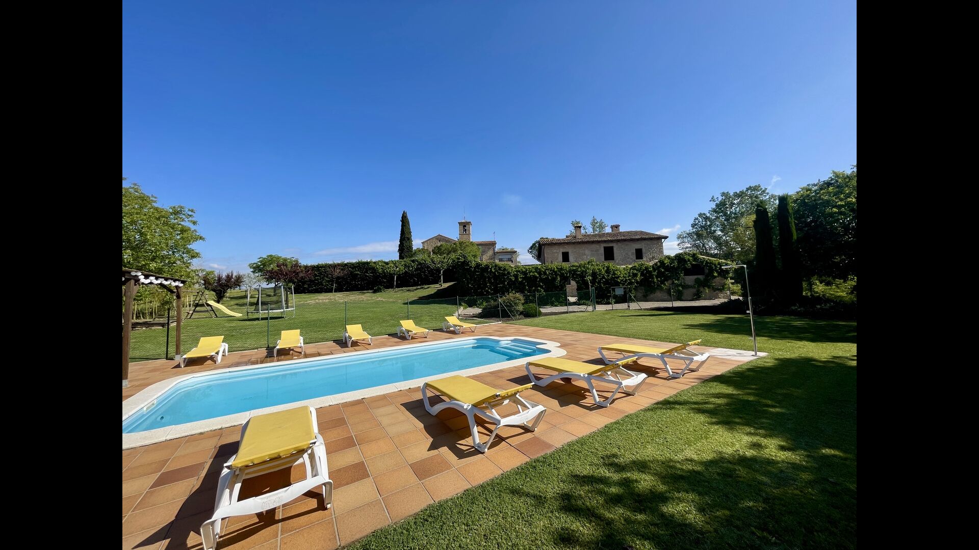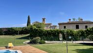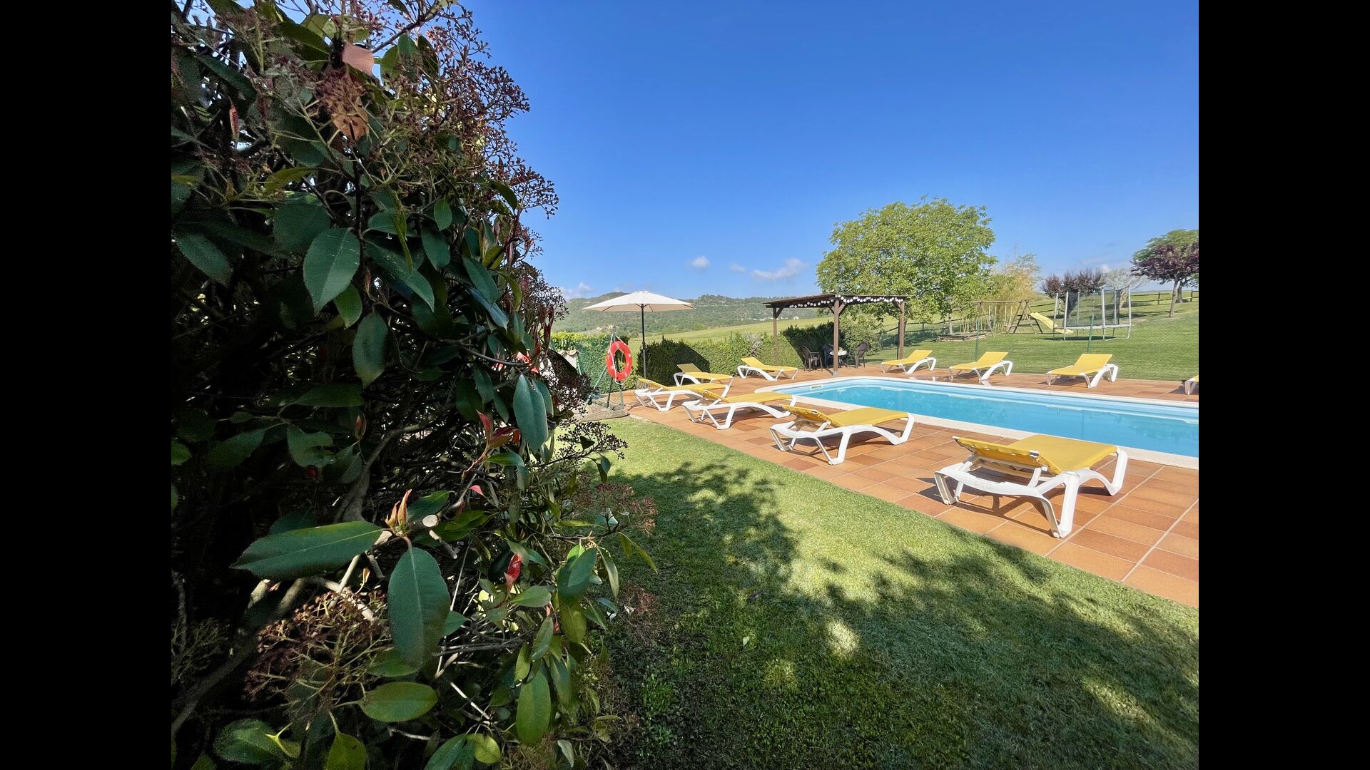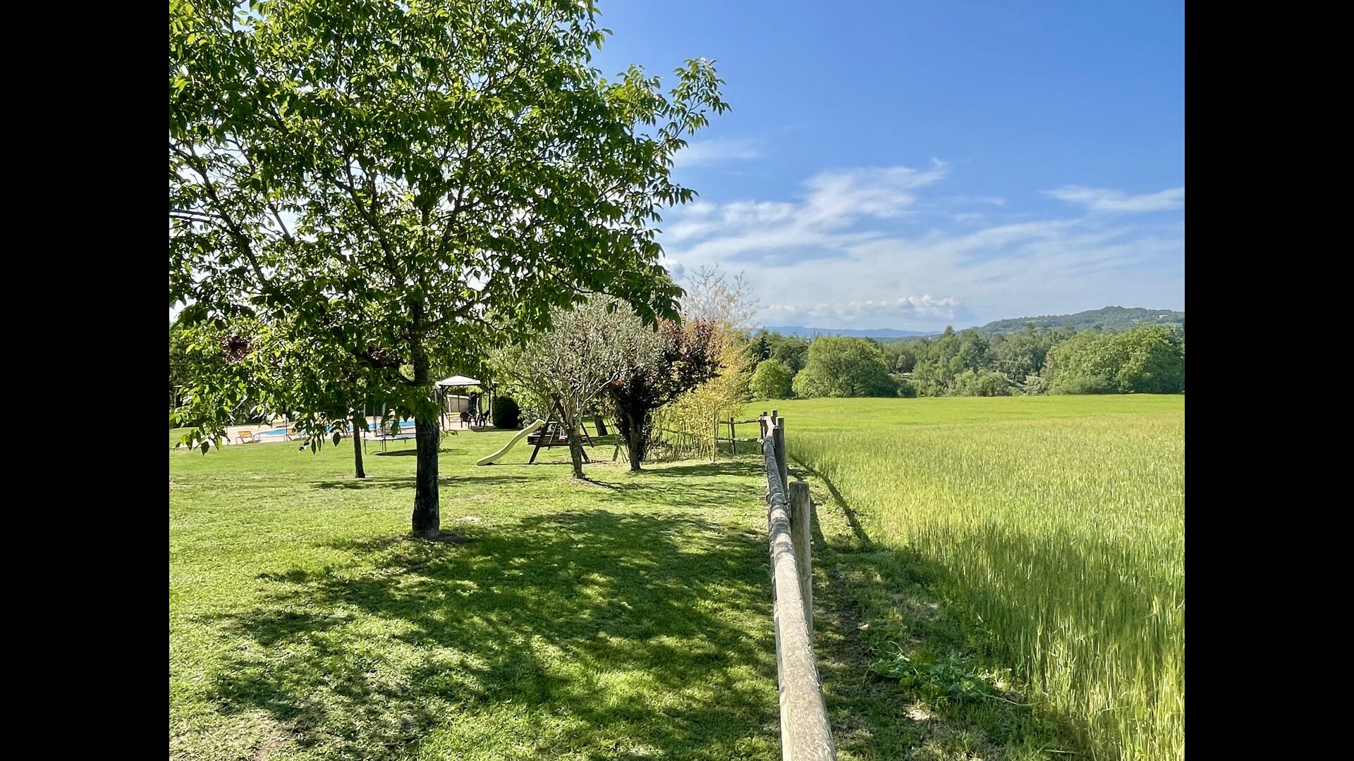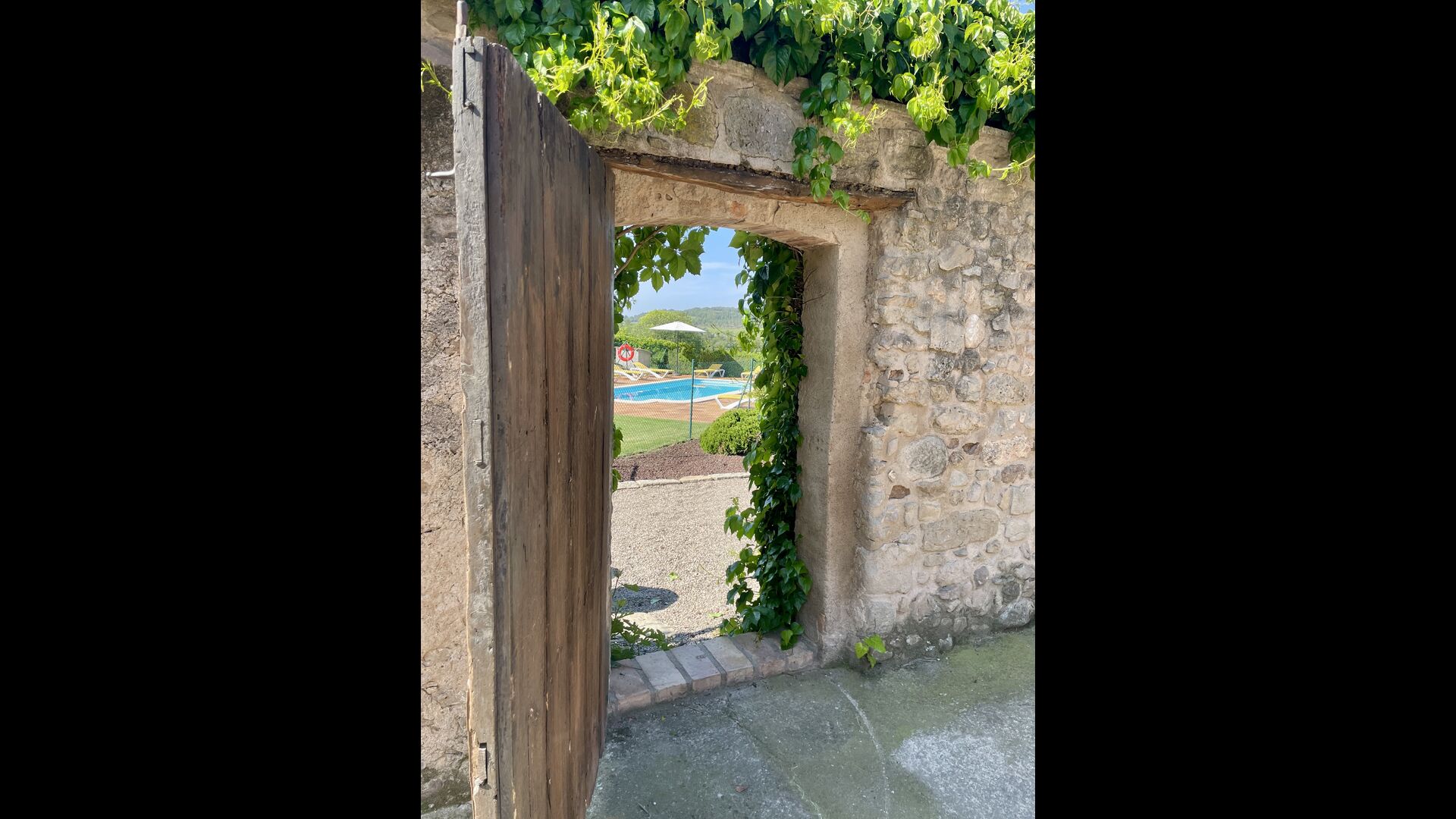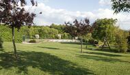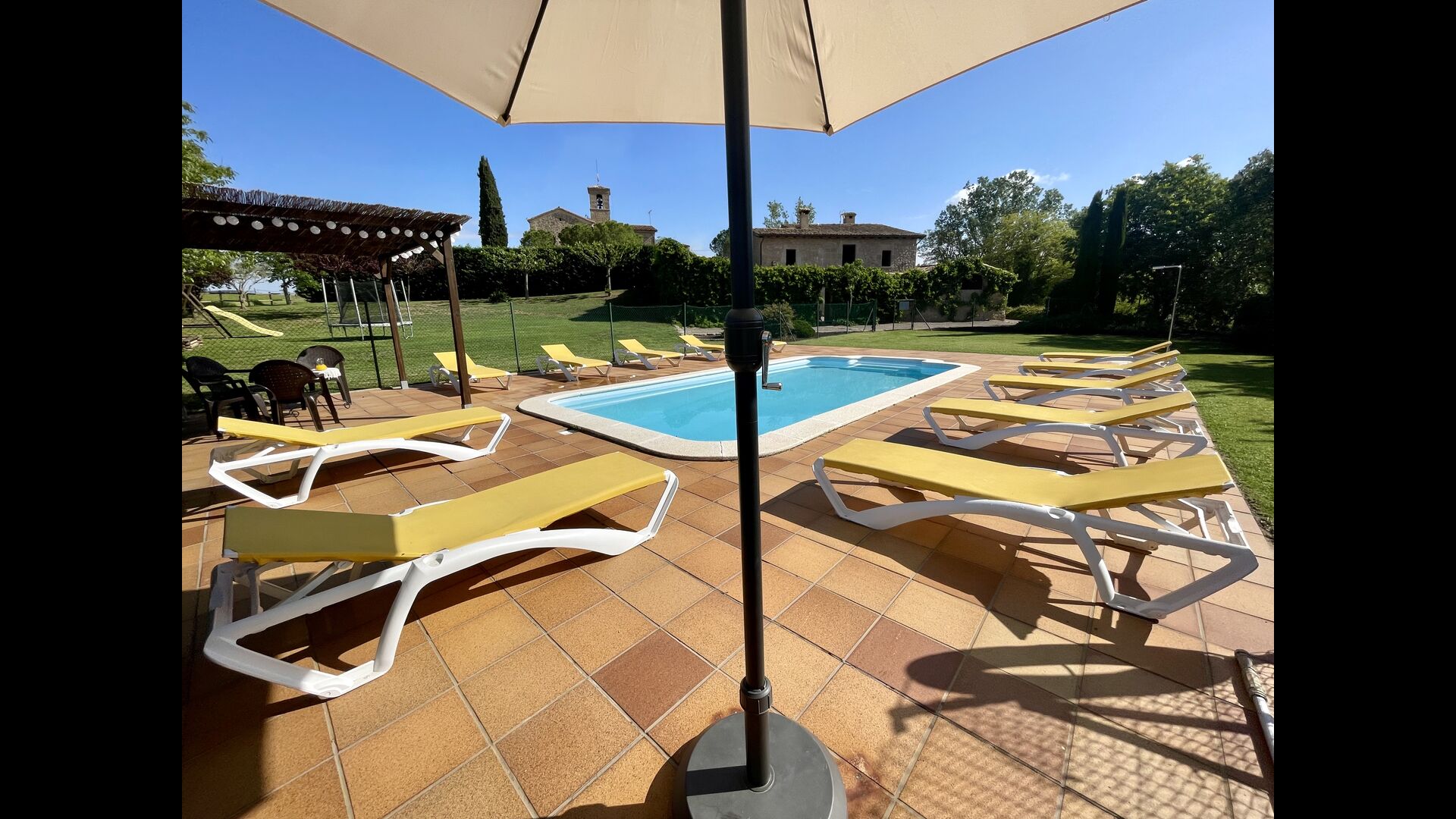 Den imponerende port, der i gamle dage var stor nok til, at hestevognene kunne komme ind, giver adgang til det smukke have- og poolområde. I den ene ende, græsplænen med nogle træer, der giver skygge. Desuden er der en sandkasse og gynger til de yngste, og nogle borde til lette måltider. I den anden ende, swimmingpoolen med romerske trin, det er faktisk meget rart, når man har små børn i sin gruppe. Med en kold drink og en bog og med den smukke udsigt over det bakkede landskab med marker og skov, får roen og lydene de sidste rester af den stressede hverdag til at forsvinde.