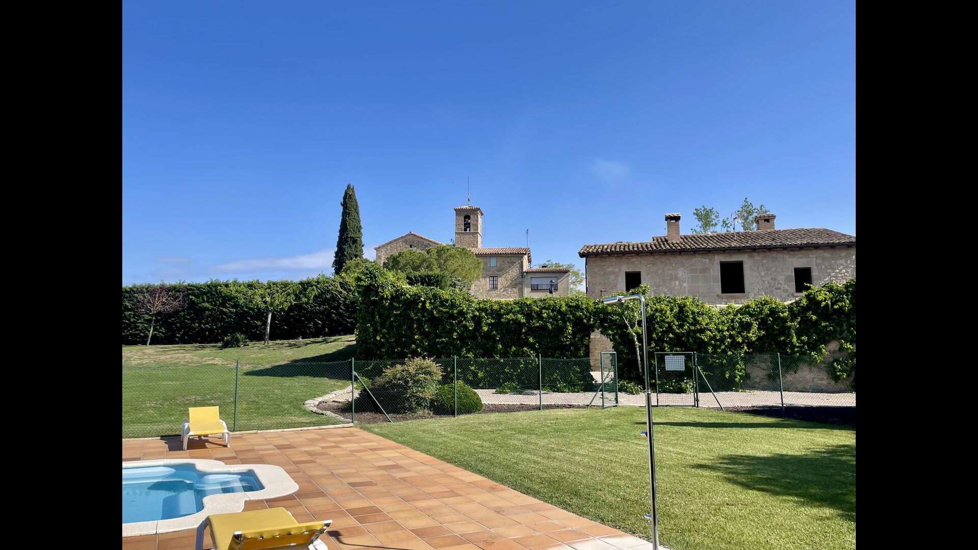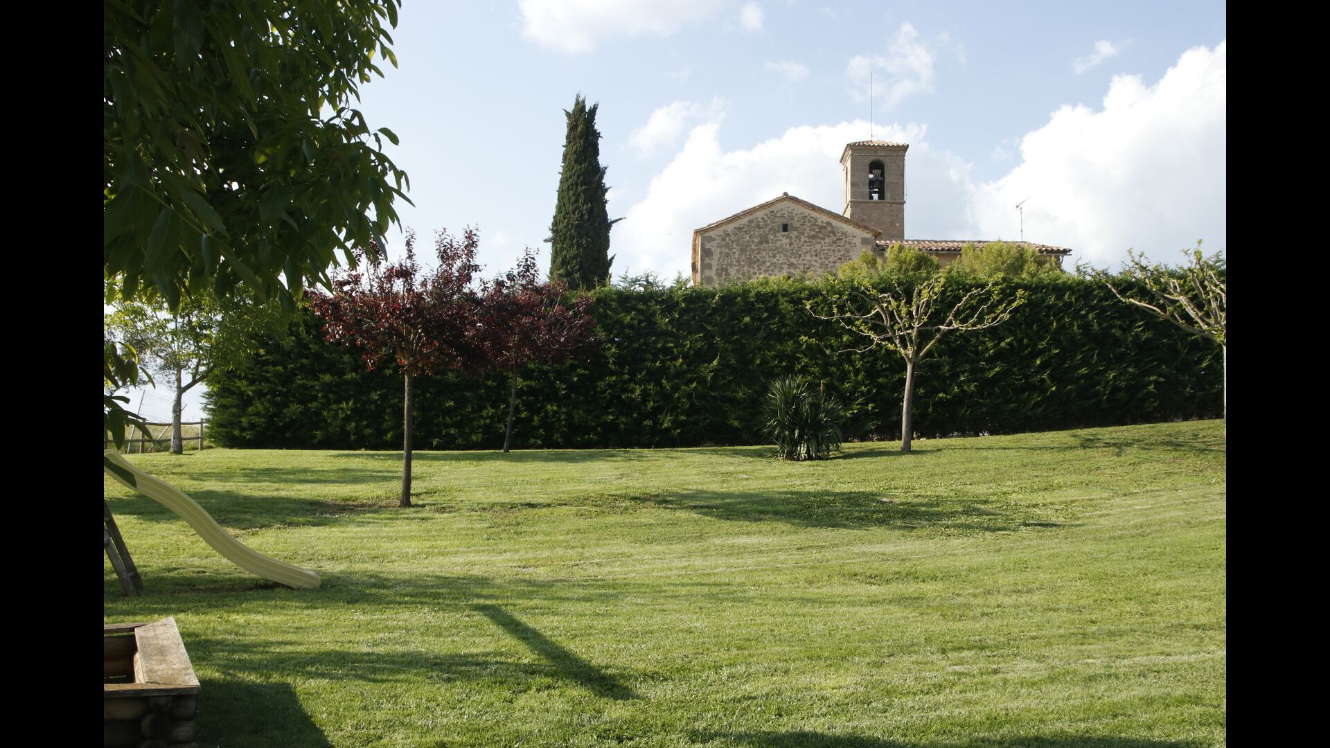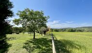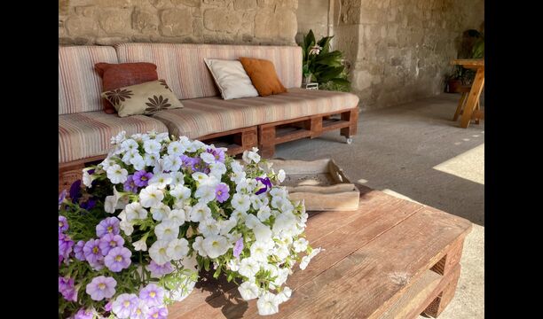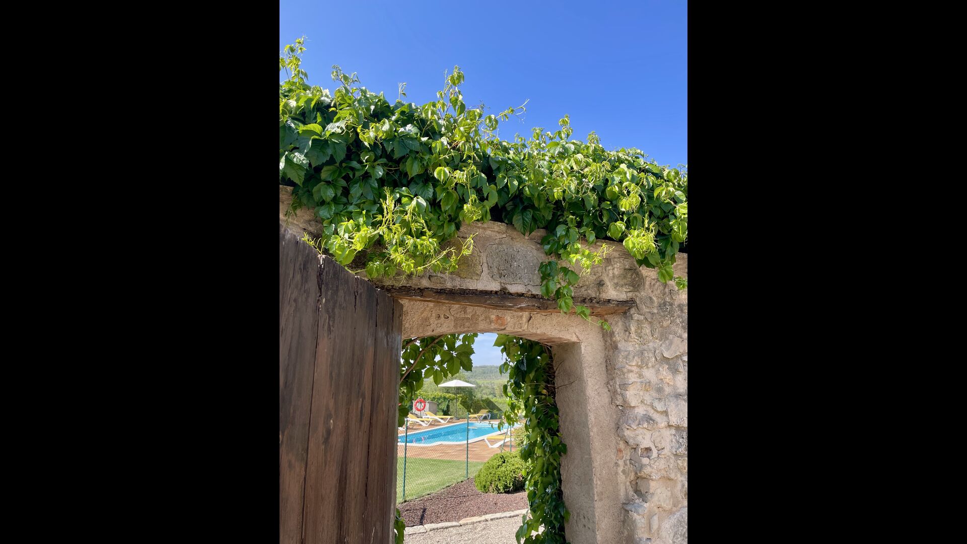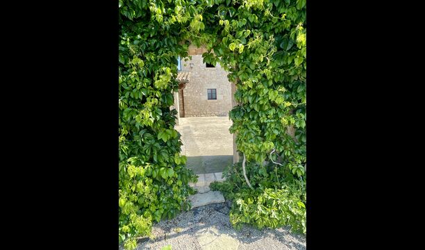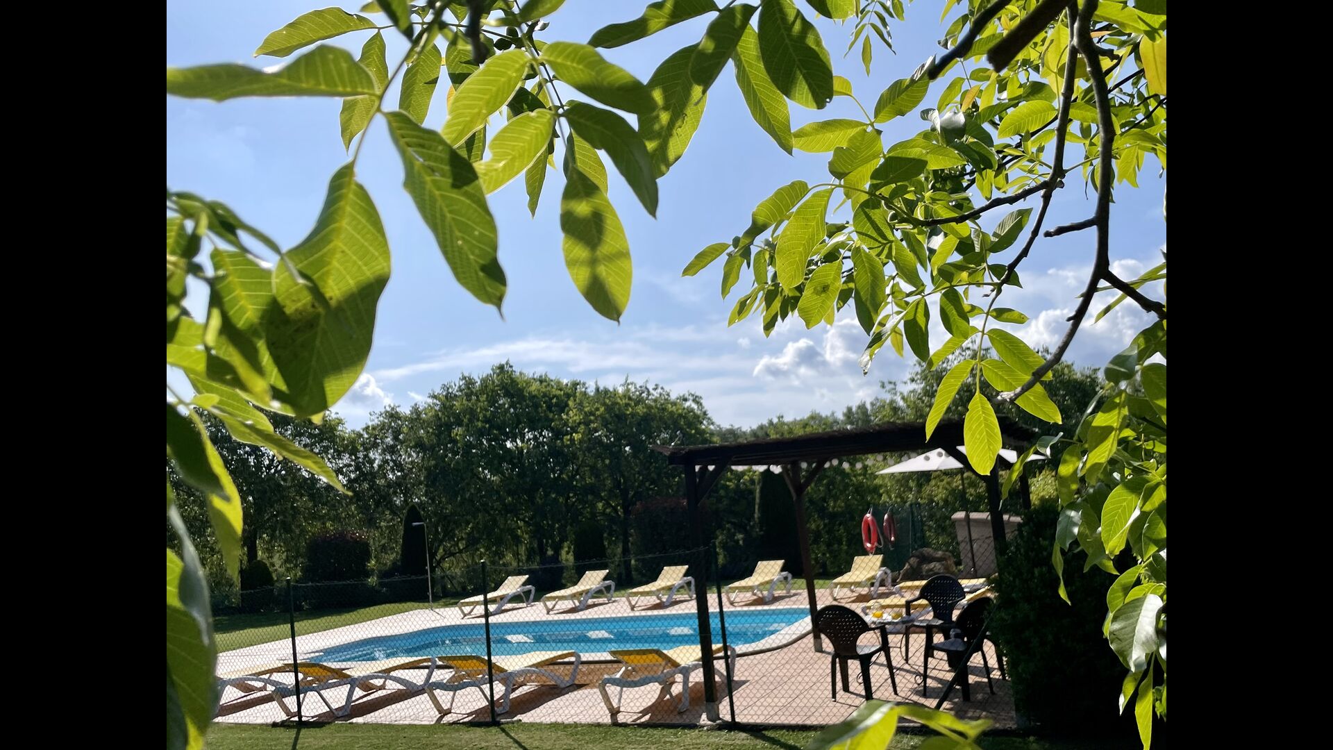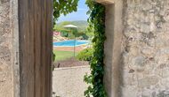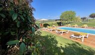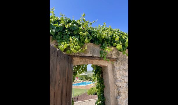 Den imponerende port, der i gamle dage var stor nok til, at hestevognene kunne komme ind, giver adgang til det smukke have- og poolområde. I den ene ende, græsplænen med nogle træer, der giver skygge. Desuden er der en sandkasse og gynger til de yngste, og nogle borde til lette måltider. I den anden ende, swimmingpoolen med romerske trin, det er faktisk meget rart, når man har små børn i sin gruppe. Med en kold drink og en bog og med den smukke udsigt over det bakkede landskab med marker og skov, får roen og lydene de sidste rester af den stressede hverdag til at forsvinde.